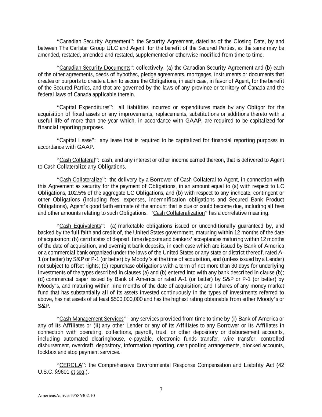 7 AmericasActive:19586302.10 “Canadian Security Agreement”: the Security Agreement, dated as of the Closing Date, by and between The Carlstar Group ULC and Agent, for the benefit of the Secured Parties, as the same may be amended, restated, amended and restated, supplemented or otherwise modified from time to time. “Canadian Security Documents”: collectively, (a) the Canadian Security Agreement and (b) each of the other agreements, deeds of hypothec, pledge agreements, mortgages, instruments or documents that creates or purports to create a Lien to secure the Obligations, in each case, in favor of Agent, for the benefit of the Secured Parties, and that are governed by the laws of any province or territory of Canada and the federal laws of Canada applicable therein. “Capital Expenditures”: all liabilities incurred or expenditures made by any Obligor for the acquisition of fixed assets or any improvements, replacements, substitutions or additions thereto with a useful life of more than one year which, in accordance with GAAP, are required to be capitalized for financial reporting purposes. “Capital Lease”: any lease that is required to be capitalized for financial reporting purposes in accordance with GAAP. “Cash Collateral”: cash, and any interest or other income earned thereon, that is delivered to Agent to Cash Collateralize any Obligations. “Cash Collateralize”: the delivery by a Borrower of Cash Collateral to Agent, in connection with this Agreement as security for the payment of Obligations, in an amount equal to (a) with respect to LC Obligations, 102.5% of the aggregate LC Obligations, and (b) with respect to any inchoate, contingent or other Obligations (including fees, expenses, indemnification obligations and Secured Bank Product Obligations), Agent’s good faith estimate of the amount that is due or could become due, including all fees and other amounts relating to such Obligations. “Cash Collateralization” has a correlative meaning. “Cash Equivalents”: (a) marketable obligations issued or unconditionally guaranteed by, and backed by the full faith and credit of, the United States government, maturing within 12 months of the date of acquisition; (b) certificates of deposit, time deposits and bankers’ acceptances maturing within 12 months of the date of acquisition, and overnight bank deposits, in each case which are issued by Bank of America or a commercial bank organized under the laws of the United States or any state or district thereof, rated A- 1 (or better) by S&P or P-1 (or better) by Moody’s at the time of acquisition, and (unless issued by a Lender) not subject to offset rights; (c) repurchase obligations with a term of not more than 30 days for underlying investments of the types described in clauses (a) and (b) entered into with any bank described in clause (b); (d) commercial paper issued by Bank of America or rated A-1 (or better) by S&P or P-1 (or better) by Moody’s, and maturing within nine months of the date of acquisition; and I shares of any money market fund that has substantially all of its assets invested continuously in the types of investments referred to above, has net assets of at least $500,000,000 and has the highest rating obtainable from either Moody’s or S&P. “Cash Management Services”: any services provided from time to time by (i) Bank of America or any of its Affiliates or (ii) any other Lender or any of its Affiliates to any Borrower or its Affiliates in connection with operating, collections, payroll, trust, or other depository or disbursement accounts, including automated clearinghouse, e-payable, electronic funds transfer, wire transfer, controlled disbursement, overdraft, depository, information reporting, cash pooling arrangements, blocked accounts, lockbox and stop payment services. “CERCLA”: the Comprehensive Environmental Response Compensation and Liability Act (42 U.S.C. §9601 et seq.).
