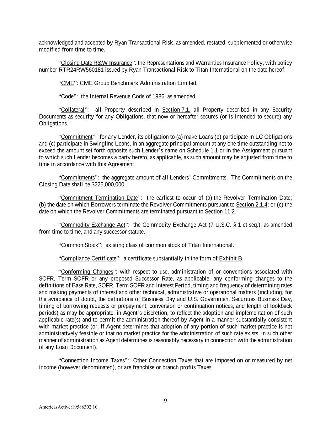9 AmericasActive:19586302.10 acknowledged and accepted by Ryan Transactional Risk, as amended, restated, supplemented or otherwise modified from time to time. “Closing Date R&W Insurance”: the Representations and Warranties Insurance Policy, with policy number RTR24RW560181 issued by Ryan Transactional Risk to Titan International on the date hereof. “CME”: CME Group Benchmark Administration Limited. “Code”: the Internal Revenue Code of 1986, as amended. “Collateral”: all Property described in Section 7.1, all Property described in any Security Documents as security for any Obligations, that now or hereafter secures (or is intended to secure) any Obligations. “Commitment”: for any Lender, its obligation to (a) make Loans (b) participate in LC Obligations and (c) participate in Swingline Loans, in an aggregate principal amount at any one time outstanding not to exceed the amount set forth opposite such Lender’s name on Schedule 1.1 or in the Assignment pursuant to which such Lender becomes a party hereto, as applicable, as such amount may be adjusted from time to time in accordance with this Agreement. “Commitments”: the aggregate amount of all Lenders’ Commitments. The Commitments on the Closing Date shall be $225,000,000. “Commitment Termination Date”: the earliest to occur of (a) the Revolver Termination Date; (b) the date on which Borrowers terminate the Revolver Commitments pursuant to Section 2.1.4; or (c) the date on which the Revolver Commitments are terminated pursuant to Section 11.2. “Commodity Exchange Act”: the Commodity Exchange Act (7 U.S.C. § 1 et seq.), as amended from time to time, and any successor statute. “Common Stock”: existing class of common stock of Titan International. “Compliance Certificate”: a certificate substantially in the form of Exhibit B. “Conforming Changes”: with respect to use, administration of or conventions associated with SOFR, Term SOFR or any proposed Successor Rate, as applicable, any conforming changes to the definitions of Base Rate, SOFR, Term SOFR and Interest Period, timing and frequency of determining rates and making payments of interest and other technical, administrative or operational matters (including, for the avoidance of doubt, the definitions of Business Day and U.S. Government Securities Business Day, timing of borrowing requests or prepayment, conversion or continuation notices, and length of lookback periods) as may be appropriate, in Agent’s discretion, to reflect the adoption and implementation of such applicable rate(s) and to permit the administration thereof by Agent in a manner substantially consistent with market practice (or, if Agent determines that adoption of any portion of such market practice is not administratively feasible or that no market practice for the administration of such rate exists, in such other manner of administration as Agent determines is reasonably necessary in connection with the administration of any Loan Document). “Connection Income Taxes”: Other Connection Taxes that are imposed on or measured by net income (however denominated), or are franchise or branch profits Taxes.
