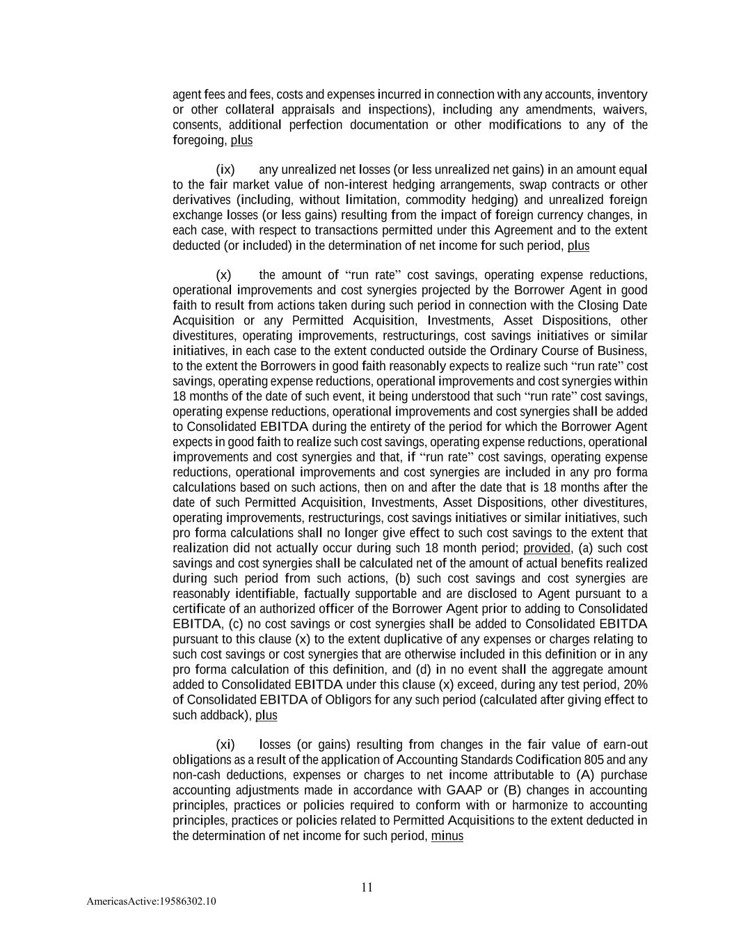 11 AmericasActive:19586302.10 agent fees and fees, costs and expenses incurred in connection with any accounts, inventory or other collateral appraisals and inspections), including any amendments, waivers, consents, additional perfection documentation or other modifications to any of the foregoing, plus (ix) any unrealized net losses (or less unrealized net gains) in an amount equal to the fair market value of non-interest hedging arrangements, swap contracts or other derivatives (including, without limitation, commodity hedging) and unrealized foreign exchange losses (or less gains) resulting from the impact of foreign currency changes, in each case, with respect to transactions permitted under this Agreement and to the extent deducted (or included) in the determination of net income for such period, plus (x) the amount of “run rate” cost savings, operating expense reductions, operational improvements and cost synergies projected by the Borrower Agent in good faith to result from actions taken during such period in connection with the Closing Date Acquisition or any Permitted Acquisition, Investments, Asset Dispositions, other divestitures, operating improvements, restructurings, cost savings initiatives or similar initiatives, in each case to the extent conducted outside the Ordinary Course of Business, to the extent the Borrowers in good faith reasonably expects to realize such “run rate” cost savings, operating expense reductions, operational improvements and cost synergies within 18 months of the date of such event, it being understood that such “run rate” cost savings, operating expense reductions, operational improvements and cost synergies shall be added to Consolidated EBITDA during the entirety of the period for which the Borrower Agent expects in good faith to realize such cost savings, operating expense reductions, operational improvements and cost synergies and that, if “run rate” cost savings, operating expense reductions, operational improvements and cost synergies are included in any pro forma calculations based on such actions, then on and after the date that is 18 months after the date of such Permitted Acquisition, Investments, Asset Dispositions, other divestitures, operating improvements, restructurings, cost savings initiatives or similar initiatives, such pro forma calculations shall no longer give effect to such cost savings to the extent that realization did not actually occur during such 18 month period; provided, (a) such cost savings and cost synergies shall be calculated net of the amount of actual benefits realized during such period from such actions, (b) such cost savings and cost synergies are reasonably identifiable, factually supportable and are disclosed to Agent pursuant to a certificate of an authorized officer of the Borrower Agent prior to adding to Consolidated EBITDA, (c) no cost savings or cost synergies shall be added to Consolidated EBITDA pursuant to this clause (x) to the extent duplicative of any expenses or charges relating to such cost savings or cost synergies that are otherwise included in this definition or in any pro forma calculation of this definition, and (d) in no event shall the aggregate amount added to Consolidated EBITDA under this clause (x) exceed, during any test period, 20% of Consolidated EBITDA of Obligors for any such period (calculated after giving effect to such addback), plus (xi) losses (or gains) resulting from changes in the fair value of earn-out obligations as a result of the application of Accounting Standards Codification 805 and any non-cash deductions, expenses or charges to net income attributable to (A) purchase accounting adjustments made in accordance with GAAP or (B) changes in accounting principles, practices or policies required to conform with or harmonize to accounting principles, practices or policies related to Permitted Acquisitions to the extent deducted in the determination of net income for such period, minus