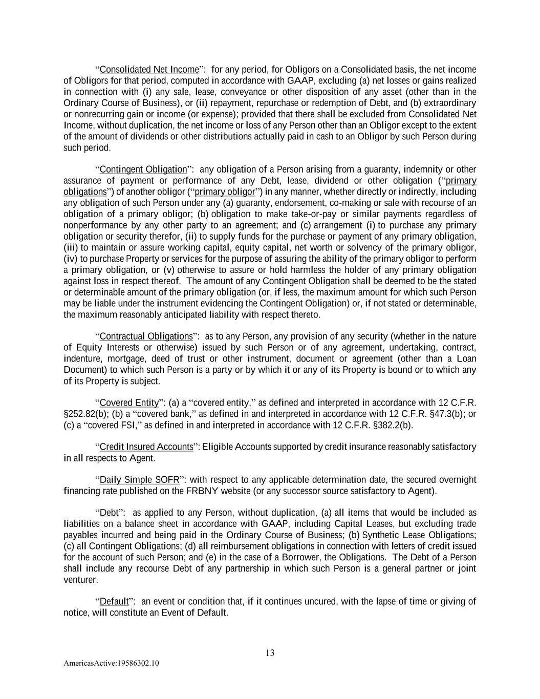 13 AmericasActive:19586302.10 “Consolidated Net Income”: for any period, for Obligors on a Consolidated basis, the net income of Obligors for that period, computed in accordance with GAAP, excluding (a) net losses or gains realized in connection with (i) any sale, lease, conveyance or other disposition of any asset (other than in the Ordinary Course of Business), or (ii) repayment, repurchase or redemption of Debt, and (b) extraordinary or nonrecurring gain or income (or expense); provided that there shall be excluded from Consolidated Net Income, without duplication, the net income or loss of any Person other than an Obligor except to the extent of the amount of dividends or other distributions actually paid in cash to an Obligor by such Person during such period. “Contingent Obligation”: any obligation of a Person arising from a guaranty, indemnity or other assurance of payment or performance of any Debt, lease, dividend or other obligation (“primary obligations”) of another obligor (“primary obligor”) in any manner, whether directly or indirectly, including any obligation of such Person under any (a) guaranty, endorsement, co-making or sale with recourse of an obligation of a primary obligor; (b) obligation to make take-or-pay or similar payments regardless of nonperformance by any other party to an agreement; and (c) arrangement (i) to purchase any primary obligation or security therefor, (ii) to supply funds for the purchase or payment of any primary obligation, (iii) to maintain or assure working capital, equity capital, net worth or solvency of the primary obligor, (iv) to purchase Property or services for the purpose of assuring the ability of the primary obligor to perform a primary obligation, or (v) otherwise to assure or hold harmless the holder of any primary obligation against loss in respect thereof. The amount of any Contingent Obligation shall be deemed to be the stated or determinable amount of the primary obligation (or, if less, the maximum amount for which such Person may be liable under the instrument evidencing the Contingent Obligation) or, if not stated or determinable, the maximum reasonably anticipated liability with respect thereto. “Contractual Obligations”: as to any Person, any provision of any security (whether in the nature of Equity Interests or otherwise) issued by such Person or of any agreement, undertaking, contract, indenture, mortgage, deed of trust or other instrument, document or agreement (other than a Loan Document) to which such Person is a party or by which it or any of its Property is bound or to which any of its Property is subject. “Covered Entity”: (a) a “covered entity,” as defined and interpreted in accordance with 12 C.F.R. §252.82(b); (b) a “covered bank,” as defined in and interpreted in accordance with 12 C.F.R. §47.3(b); or (c) a “covered FSI,” as defined in and interpreted in accordance with 12 C.F.R. §382.2(b). “Credit Insured Accounts”: Eligible Accounts supported by credit insurance reasonably satisfactory in all respects to Agent. “Daily Simple SOFR”: with respect to any applicable determination date, the secured overnight financing rate published on the FRBNY website (or any successor source satisfactory to Agent). “Debt”: as applied to any Person, without duplication, (a) all items that would be included as liabilities on a balance sheet in accordance with GAAP, including Capital Leases, but excluding trade payables incurred and being paid in the Ordinary Course of Business; (b) Synthetic Lease Obligations; (c) all Contingent Obligations; (d) all reimbursement obligations in connection with letters of credit issued for the account of such Person; and (e) in the case of a Borrower, the Obligations. The Debt of a Person shall include any recourse Debt of any partnership in which such Person is a general partner or joint venturer. “Default”: an event or condition that, if it continues uncured, with the lapse of time or giving of notice, will constitute an Event of Default.