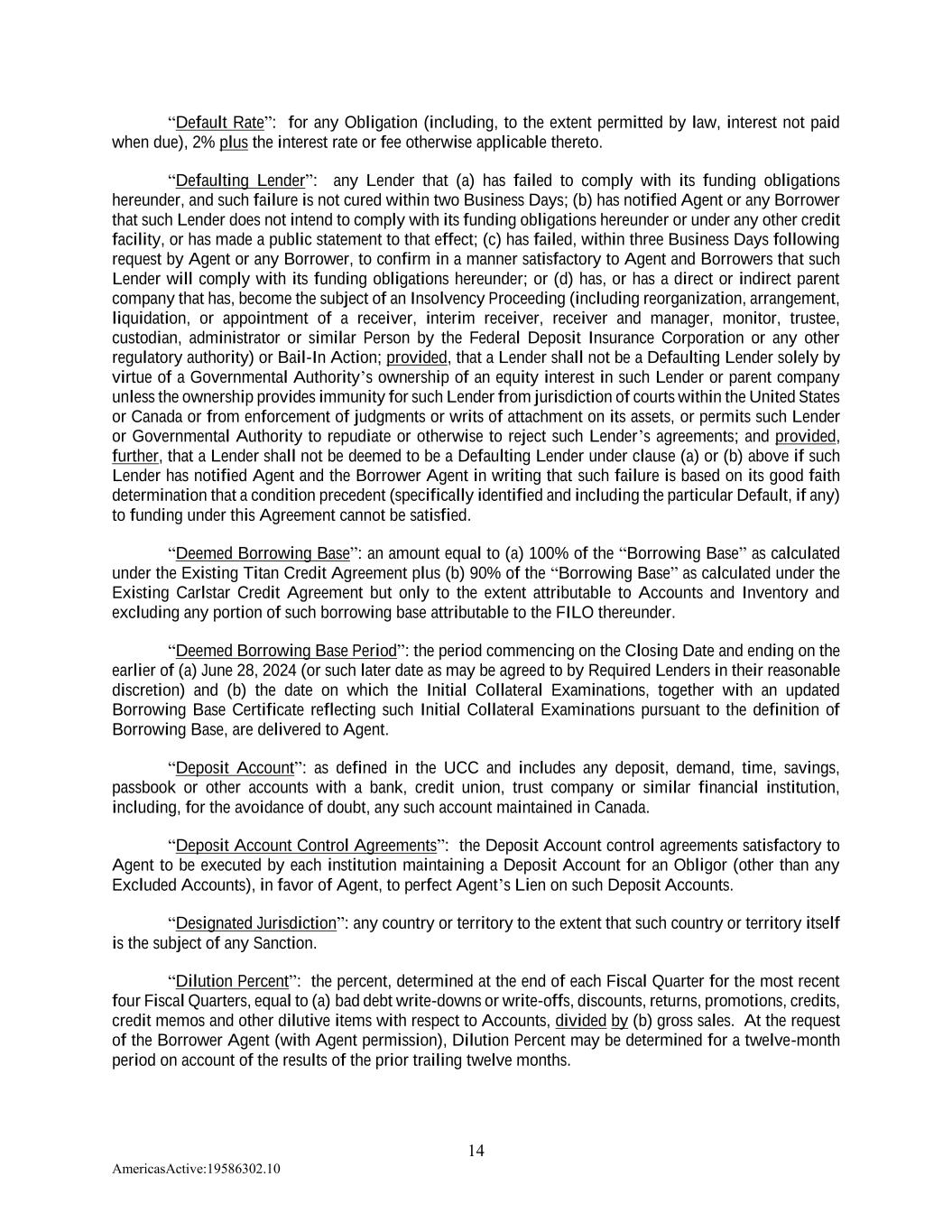 14 AmericasActive:19586302.10 “Default Rate”: for any Obligation (including, to the extent permitted by law, interest not paid when due), 2% plus the interest rate or fee otherwise applicable thereto. “Defaulting Lender”: any Lender that (a) has failed to comply with its funding obligations hereunder, and such failure is not cured within two Business Days; (b) has notified Agent or any Borrower that such Lender does not intend to comply with its funding obligations hereunder or under any other credit facility, or has made a public statement to that effect; (c) has failed, within three Business Days following request by Agent or any Borrower, to confirm in a manner satisfactory to Agent and Borrowers that such Lender will comply with its funding obligations hereunder; or (d) has, or has a direct or indirect parent company that has, become the subject of an Insolvency Proceeding (including reorganization, arrangement, liquidation, or appointment of a receiver, interim receiver, receiver and manager, monitor, trustee, custodian, administrator or similar Person by the Federal Deposit Insurance Corporation or any other regulatory authority) or Bail-In Action; provided, that a Lender shall not be a Defaulting Lender solely by virtue of a Governmental Authority’s ownership of an equity interest in such Lender or parent company unless the ownership provides immunity for such Lender from jurisdiction of courts within the United States or Canada or from enforcement of judgments or writs of attachment on its assets, or permits such Lender or Governmental Authority to repudiate or otherwise to reject such Lender’s agreements; and provided, further, that a Lender shall not be deemed to be a Defaulting Lender under clause (a) or (b) above if such Lender has notified Agent and the Borrower Agent in writing that such failure is based on its good faith determination that a condition precedent (specifically identified and including the particular Default, if any) to funding under this Agreement cannot be satisfied. “Deemed Borrowing Base”: an amount equal to (a) 100% of the “Borrowing Base” as calculated under the Existing Titan Credit Agreement plus (b) 90% of the “Borrowing Base” as calculated under the Existing Carlstar Credit Agreement but only to the extent attributable to Accounts and Inventory and excluding any portion of such borrowing base attributable to the FILO thereunder. “Deemed Borrowing Base Period”: the period commencing on the Closing Date and ending on the earlier of (a) June 28, 2024 (or such later date as may be agreed to by Required Lenders in their reasonable discretion) and (b) the date on which the Initial Collateral Examinations, together with an updated Borrowing Base Certificate reflecting such Initial Collateral Examinations pursuant to the definition of Borrowing Base, are delivered to Agent. “Deposit Account”: as defined in the UCC and includes any deposit, demand, time, savings, passbook or other accounts with a bank, credit union, trust company or similar financial institution, including, for the avoidance of doubt, any such account maintained in Canada. “Deposit Account Control Agreements”: the Deposit Account control agreements satisfactory to Agent to be executed by each institution maintaining a Deposit Account for an Obligor (other than any Excluded Accounts), in favor of Agent, to perfect Agent’s Lien on such Deposit Accounts. “Designated Jurisdiction”: any country or territory to the extent that such country or territory itself is the subject of any Sanction. “Dilution Percent”: the percent, determined at the end of each Fiscal Quarter for the most recent four Fiscal Quarters, equal to (a) bad debt write-downs or write-offs, discounts, returns, promotions, credits, credit memos and other dilutive items with respect to Accounts, divided by (b) gross sales. At the request of the Borrower Agent (with Agent permission), Dilution Percent may be determined for a twelve-month period on account of the results of the prior trailing twelve months.