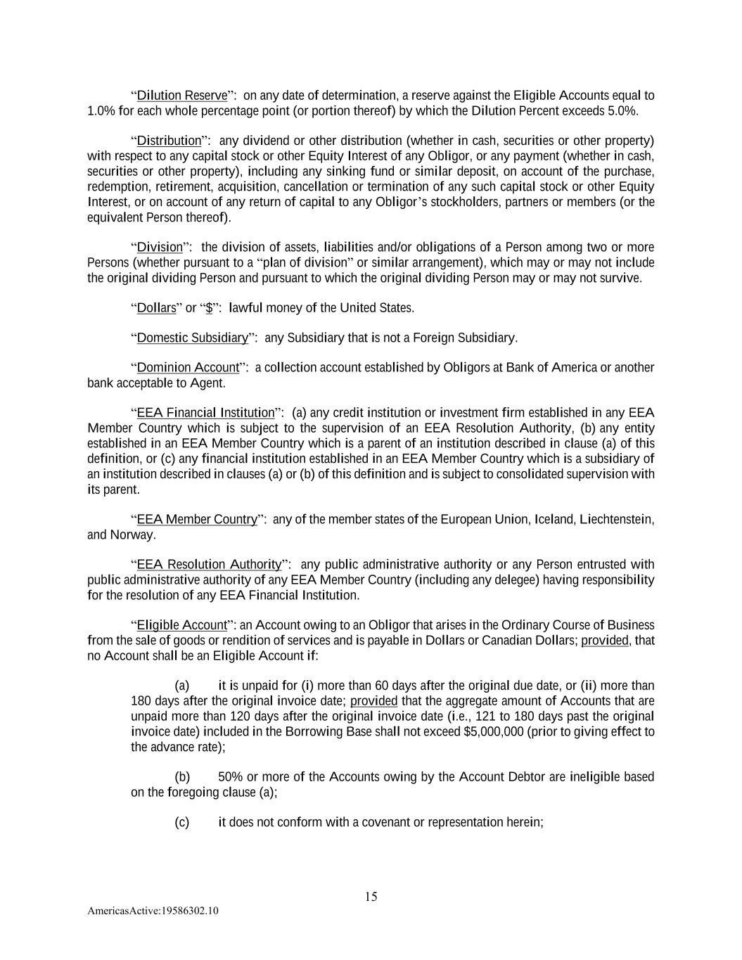 15 AmericasActive:19586302.10 “Dilution Reserve”: on any date of determination, a reserve against the Eligible Accounts equal to 1.0% for each whole percentage point (or portion thereof) by which the Dilution Percent exceeds 5.0%. “Distribution”: any dividend or other distribution (whether in cash, securities or other property) with respect to any capital stock or other Equity Interest of any Obligor, or any payment (whether in cash, securities or other property), including any sinking fund or similar deposit, on account of the purchase, redemption, retirement, acquisition, cancellation or termination of any such capital stock or other Equity Interest, or on account of any return of capital to any Obligor’s stockholders, partners or members (or the equivalent Person thereof). “Division”: the division of assets, liabilities and/or obligations of a Person among two or more Persons (whether pursuant to a “plan of division” or similar arrangement), which may or may not include the original dividing Person and pursuant to which the original dividing Person may or may not survive. “Dollars” or “$”: lawful money of the United States. “Domestic Subsidiary”: any Subsidiary that is not a Foreign Subsidiary. “Dominion Account”: a collection account established by Obligors at Bank of America or another bank acceptable to Agent. “EEA Financial Institution”: (a) any credit institution or investment firm established in any EEA Member Country which is subject to the supervision of an EEA Resolution Authority, (b) any entity established in an EEA Member Country which is a parent of an institution described in clause (a) of this definition, or (c) any financial institution established in an EEA Member Country which is a subsidiary of an institution described in clauses (a) or (b) of this definition and is subject to consolidated supervision with its parent. “EEA Member Country”: any of the member states of the European Union, Iceland, Liechtenstein, and Norway. “EEA Resolution Authority”: any public administrative authority or any Person entrusted with public administrative authority of any EEA Member Country (including any delegee) having responsibility for the resolution of any EEA Financial Institution. “Eligible Account”: an Account owing to an Obligor that arises in the Ordinary Course of Business from the sale of goods or rendition of services and is payable in Dollars or Canadian Dollars; provided, that no Account shall be an Eligible Account if: (a) it is unpaid for (i) more than 60 days after the original due date, or (ii) more than 180 days after the original invoice date; provided that the aggregate amount of Accounts that are unpaid more than 120 days after the original invoice date (i.e., 121 to 180 days past the original invoice date) included in the Borrowing Base shall not exceed $5,000,000 (prior to giving effect to the advance rate); (b) 50% or more of the Accounts owing by the Account Debtor are ineligible based on the foregoing clause (a); (c) it does not conform with a covenant or representation herein;