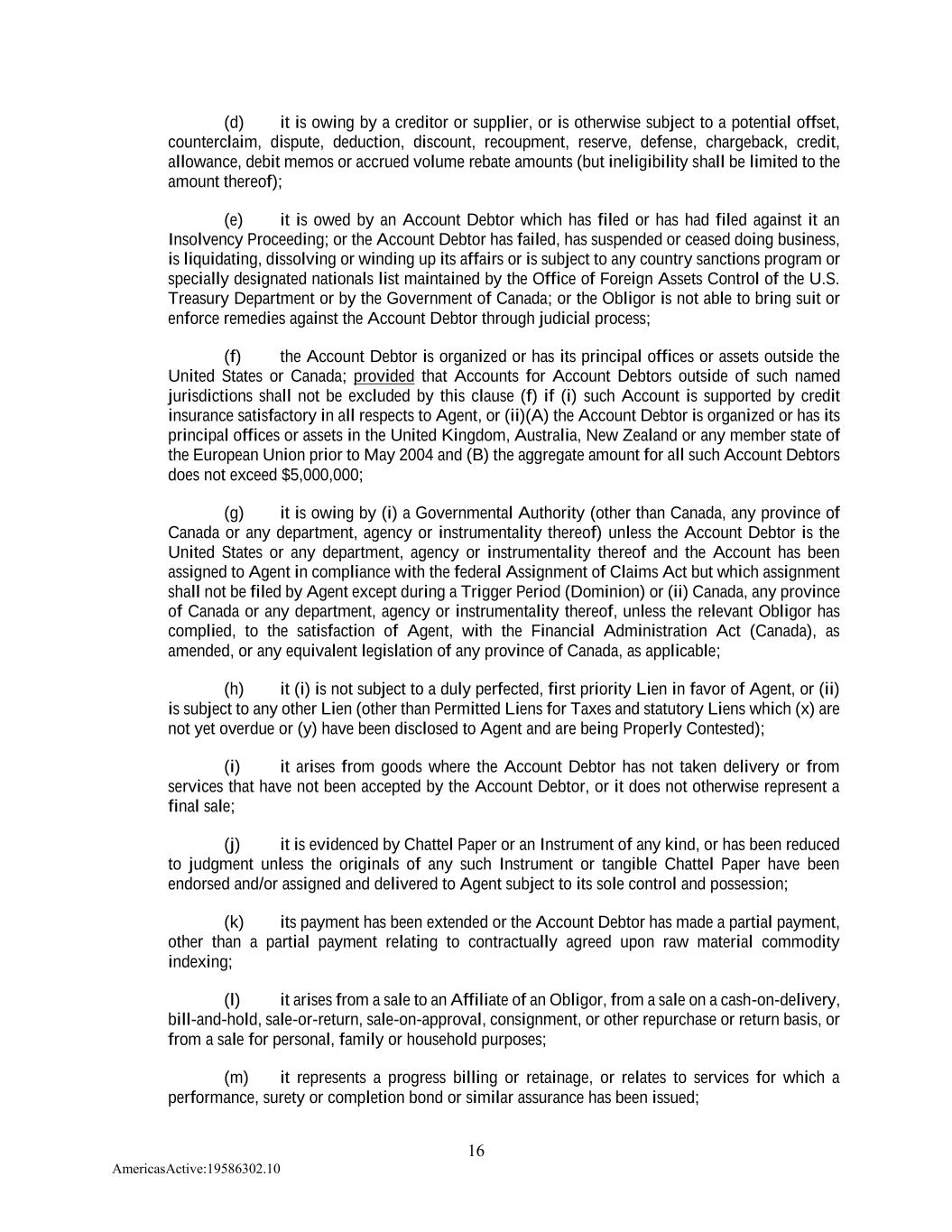 16 AmericasActive:19586302.10 (d) it is owing by a creditor or supplier, or is otherwise subject to a potential offset, counterclaim, dispute, deduction, discount, recoupment, reserve, defense, chargeback, credit, allowance, debit memos or accrued volume rebate amounts (but ineligibility shall be limited to the amount thereof); (e) it is owed by an Account Debtor which has filed or has had filed against it an Insolvency Proceeding; or the Account Debtor has failed, has suspended or ceased doing business, is liquidating, dissolving or winding up its affairs or is subject to any country sanctions program or specially designated nationals list maintained by the Office of Foreign Assets Control of the U.S. Treasury Department or by the Government of Canada; or the Obligor is not able to bring suit or enforce remedies against the Account Debtor through judicial process; (f) the Account Debtor is organized or has its principal offices or assets outside the United States or Canada; provided that Accounts for Account Debtors outside of such named jurisdictions shall not be excluded by this clause (f) if (i) such Account is supported by credit insurance satisfactory in all respects to Agent, or (ii)(A) the Account Debtor is organized or has its principal offices or assets in the United Kingdom, Australia, New Zealand or any member state of the European Union prior to May 2004 and (B) the aggregate amount for all such Account Debtors does not exceed $5,000,000; (g) it is owing by (i) a Governmental Authority (other than Canada, any province of Canada or any department, agency or instrumentality thereof) unless the Account Debtor is the United States or any department, agency or instrumentality thereof and the Account has been assigned to Agent in compliance with the federal Assignment of Claims Act but which assignment shall not be filed by Agent except during a Trigger Period (Dominion) or (ii) Canada, any province of Canada or any department, agency or instrumentality thereof, unless the relevant Obligor has complied, to the satisfaction of Agent, with the Financial Administration Act (Canada), as amended, or any equivalent legislation of any province of Canada, as applicable; (h) it (i) is not subject to a duly perfected, first priority Lien in favor of Agent, or (ii) is subject to any other Lien (other than Permitted Liens for Taxes and statutory Liens which (x) are not yet overdue or (y) have been disclosed to Agent and are being Properly Contested); (i) it arises from goods where the Account Debtor has not taken delivery or from services that have not been accepted by the Account Debtor, or it does not otherwise represent a final sale; (j) it is evidenced by Chattel Paper or an Instrument of any kind, or has been reduced to judgment unless the originals of any such Instrument or tangible Chattel Paper have been endorsed and/or assigned and delivered to Agent subject to its sole control and possession; (k) its payment has been extended or the Account Debtor has made a partial payment, other than a partial payment relating to contractually agreed upon raw material commodity indexing; (l) it arises from a sale to an Affiliate of an Obligor, from a sale on a cash-on-delivery, bill-and-hold, sale-or-return, sale-on-approval, consignment, or other repurchase or return basis, or from a sale for personal, family or household purposes; (m) it represents a progress billing or retainage, or relates to services for which a performance, surety or completion bond or similar assurance has been issued;