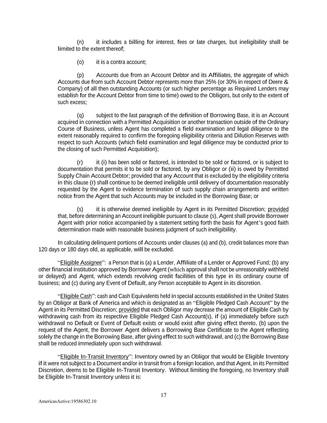 17 AmericasActive:19586302.10 (n) it includes a billing for interest, fees or late charges, but ineligibility shall be limited to the extent thereof; (o) it is a contra account; (p) Accounts due from an Account Debtor and its Affiliates, the aggregate of which Accounts due from such Account Debtor represents more than 25% (or 30% in respect of Deere & Company) of all then outstanding Accounts (or such higher percentage as Required Lenders may establish for the Account Debtor from time to time) owed to the Obligors, but only to the extent of such excess; (q) subject to the last paragraph of the definition of Borrowing Base, it is an Account acquired in connection with a Permitted Acquisition or another transaction outside of the Ordinary Course of Business, unless Agent has completed a field examination and legal diligence to the extent reasonably required to confirm the foregoing eligibility criteria and Dilution Reserves with respect to such Accounts (which field examination and legal diligence may be conducted prior to the closing of such Permitted Acquisition); (r) it (i) has been sold or factored, is intended to be sold or factored, or is subject to documentation that permits it to be sold or factored, by any Obligor or (ii) is owed by Permitted Supply Chain Account Debtor; provided that any Account that is excluded by the eligibility criteria in this clause (r) shall continue to be deemed ineligible until delivery of documentation reasonably requested by the Agent to evidence termination of such supply chain arrangements and written notice from the Agent that such Accounts may be included in the Borrowing Base; or (s) it is otherwise deemed ineligible by Agent in its Permitted Discretion; provided that, before determining an Account ineligible pursuant to clause (s), Agent shall provide Borrower Agent with prior notice accompanied by a statement setting forth the basis for Agent’s good faith determination made with reasonable business judgment of such ineligibility. In calculating delinquent portions of Accounts under clauses (a) and (b), credit balances more than 120 days or 180 days old, as applicable, will be excluded. “Eligible Assignee”: a Person that is (a) a Lender, Affiliate of a Lender or Approved Fund; (b) any other financial institution approved by Borrower Agent (which approval shall not be unreasonably withheld or delayed) and Agent, which extends revolving credit facilities of this type in its ordinary course of business; and (c) during any Event of Default, any Person acceptable to Agent in its discretion. “Eligible Cash”: cash and Cash Equivalents held in special accounts established in the United States by an Obligor at Bank of America and which is designated as an “Eligible Pledged Cash Account” by the Agent in its Permitted Discretion; provided that each Obligor may decrease the amount of Eligible Cash by withdrawing cash from its respective Eligible Pledged Cash Account(s), if (a) immediately before such withdrawal no Default or Event of Default exists or would exist after giving effect thereto, (b) upon the request of the Agent, the Borrower Agent delivers a Borrowing Base Certificate to the Agent reflecting solely the change in the Borrowing Base, after giving effect to such withdrawal, and (c) the Borrowing Base shall be reduced immediately upon such withdrawal. “Eligible In-Transit Inventory”: Inventory owned by an Obligor that would be Eligible Inventory if it were not subject to a Document and/or in transit from a foreign location, and that Agent, in its Permitted Discretion, deems to be Eligible In-Transit Inventory. Without limiting the foregoing, no Inventory shall be Eligible In-Transit Inventory unless it is: