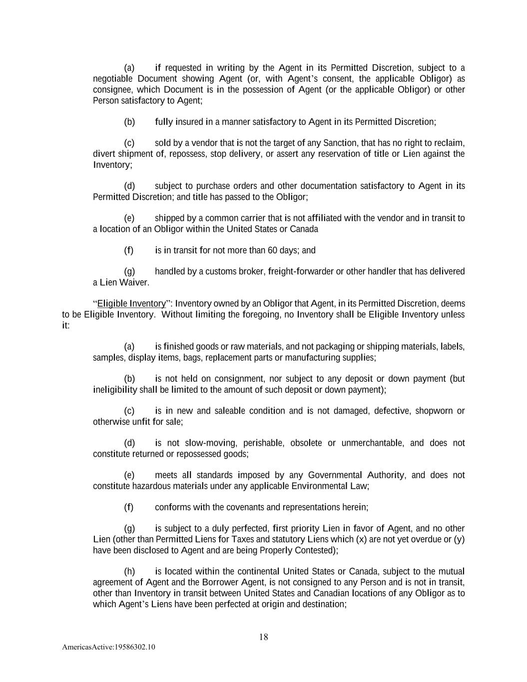 18 AmericasActive:19586302.10 (a) if requested in writing by the Agent in its Permitted Discretion, subject to a negotiable Document showing Agent (or, with Agent’s consent, the applicable Obligor) as consignee, which Document is in the possession of Agent (or the applicable Obligor) or other Person satisfactory to Agent; (b) fully insured in a manner satisfactory to Agent in its Permitted Discretion; (c) sold by a vendor that is not the target of any Sanction, that has no right to reclaim, divert shipment of, repossess, stop delivery, or assert any reservation of title or Lien against the Inventory; (d) subject to purchase orders and other documentation satisfactory to Agent in its Permitted Discretion; and title has passed to the Obligor; (e) shipped by a common carrier that is not affiliated with the vendor and in transit to a location of an Obligor within the United States or Canada (f) is in transit for not more than 60 days; and (g) handled by a customs broker, freight-forwarder or other handler that has delivered a Lien Waiver. “Eligible Inventory”: Inventory owned by an Obligor that Agent, in its Permitted Discretion, deems to be Eligible Inventory. Without limiting the foregoing, no Inventory shall be Eligible Inventory unless it: (a) is finished goods or raw materials, and not packaging or shipping materials, labels, samples, display items, bags, replacement parts or manufacturing supplies; (b) is not held on consignment, nor subject to any deposit or down payment (but ineligibility shall be limited to the amount of such deposit or down payment); (c) is in new and saleable condition and is not damaged, defective, shopworn or otherwise unfit for sale; (d) is not slow-moving, perishable, obsolete or unmerchantable, and does not constitute returned or repossessed goods; (e) meets all standards imposed by any Governmental Authority, and does not constitute hazardous materials under any applicable Environmental Law; (f) conforms with the covenants and representations herein; (g) is subject to a duly perfected, first priority Lien in favor of Agent, and no other Lien (other than Permitted Liens for Taxes and statutory Liens which (x) are not yet overdue or (y) have been disclosed to Agent and are being Properly Contested); (h) is located within the continental United States or Canada, subject to the mutual agreement of Agent and the Borrower Agent, is not consigned to any Person and is not in transit, other than Inventory in transit between United States and Canadian locations of any Obligor as to which Agent’s Liens have been perfected at origin and destination;