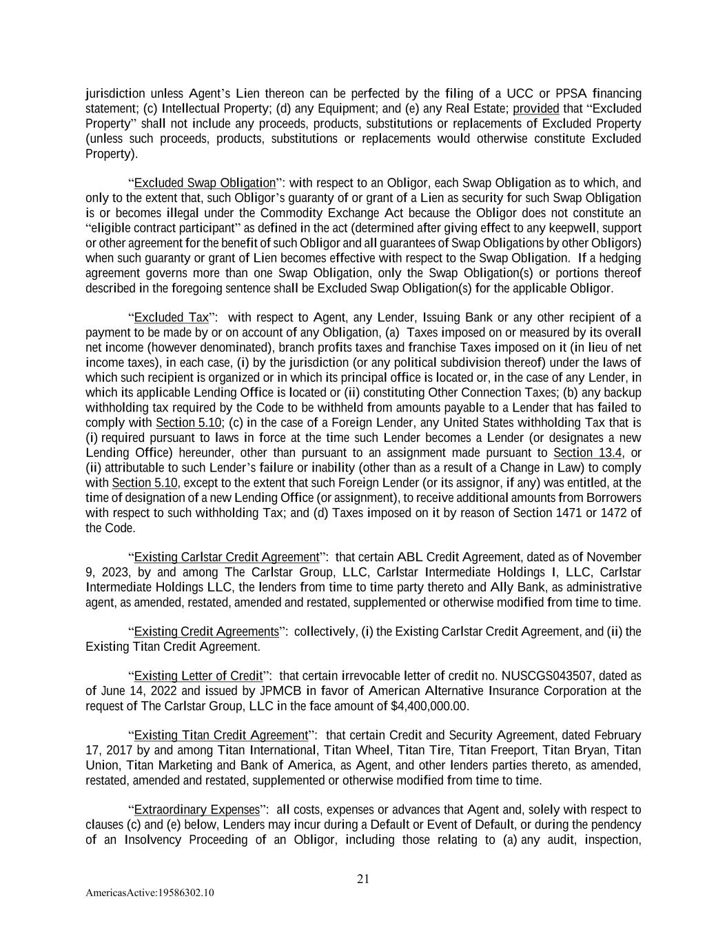 21 AmericasActive:19586302.10 jurisdiction unless Agent’s Lien thereon can be perfected by the filing of a UCC or PPSA financing statement; (c) Intellectual Property; (d) any Equipment; and (e) any Real Estate; provided that “Excluded Property” shall not include any proceeds, products, substitutions or replacements of Excluded Property (unless such proceeds, products, substitutions or replacements would otherwise constitute Excluded Property). “Excluded Swap Obligation”: with respect to an Obligor, each Swap Obligation as to which, and only to the extent that, such Obligor’s guaranty of or grant of a Lien as security for such Swap Obligation is or becomes illegal under the Commodity Exchange Act because the Obligor does not constitute an “eligible contract participant” as defined in the act (determined after giving effect to any keepwell, support or other agreement for the benefit of such Obligor and all guarantees of Swap Obligations by other Obligors) when such guaranty or grant of Lien becomes effective with respect to the Swap Obligation. If a hedging agreement governs more than one Swap Obligation, only the Swap Obligation(s) or portions thereof described in the foregoing sentence shall be Excluded Swap Obligation(s) for the applicable Obligor. “Excluded Tax”: with respect to Agent, any Lender, Issuing Bank or any other recipient of a payment to be made by or on account of any Obligation, (a) Taxes imposed on or measured by its overall net income (however denominated), branch profits taxes and franchise Taxes imposed on it (in lieu of net income taxes), in each case, (i) by the jurisdiction (or any political subdivision thereof) under the laws of which such recipient is organized or in which its principal office is located or, in the case of any Lender, in which its applicable Lending Office is located or (ii) constituting Other Connection Taxes; (b) any backup withholding tax required by the Code to be withheld from amounts payable to a Lender that has failed to comply with Section 5.10; (c) in the case of a Foreign Lender, any United States withholding Tax that is (i) required pursuant to laws in force at the time such Lender becomes a Lender (or designates a new Lending Office) hereunder, other than pursuant to an assignment made pursuant to Section 13.4, or (ii) attributable to such Lender’s failure or inability (other than as a result of a Change in Law) to comply with Section 5.10, except to the extent that such Foreign Lender (or its assignor, if any) was entitled, at the time of designation of a new Lending Office (or assignment), to receive additional amounts from Borrowers with respect to such withholding Tax; and (d) Taxes imposed on it by reason of Section 1471 or 1472 of the Code. “Existing Carlstar Credit Agreement”: that certain ABL Credit Agreement, dated as of November 9, 2023, by and among The Carlstar Group, LLC, Carlstar Intermediate Holdings I, LLC, Carlstar Intermediate Holdings LLC, the lenders from time to time party thereto and Ally Bank, as administrative agent, as amended, restated, amended and restated, supplemented or otherwise modified from time to time. “Existing Credit Agreements”: collectively, (i) the Existing Carlstar Credit Agreement, and (ii) the Existing Titan Credit Agreement. “Existing Letter of Credit”: that certain irrevocable letter of credit no. NUSCGS043507, dated as of June 14, 2022 and issued by JPMCB in favor of American Alternative Insurance Corporation at the request of The Carlstar Group, LLC in the face amount of $4,400,000.00. “Existing Titan Credit Agreement”: that certain Credit and Security Agreement, dated February 17, 2017 by and among Titan International, Titan Wheel, Titan Tire, Titan Freeport, Titan Bryan, Titan Union, Titan Marketing and Bank of America, as Agent, and other lenders parties thereto, as amended, restated, amended and restated, supplemented or otherwise modified from time to time. “Extraordinary Expenses”: all costs, expenses or advances that Agent and, solely with respect to clauses (c) and (e) below, Lenders may incur during a Default or Event of Default, or during the pendency of an Insolvency Proceeding of an Obligor, including those relating to (a) any audit, inspection,