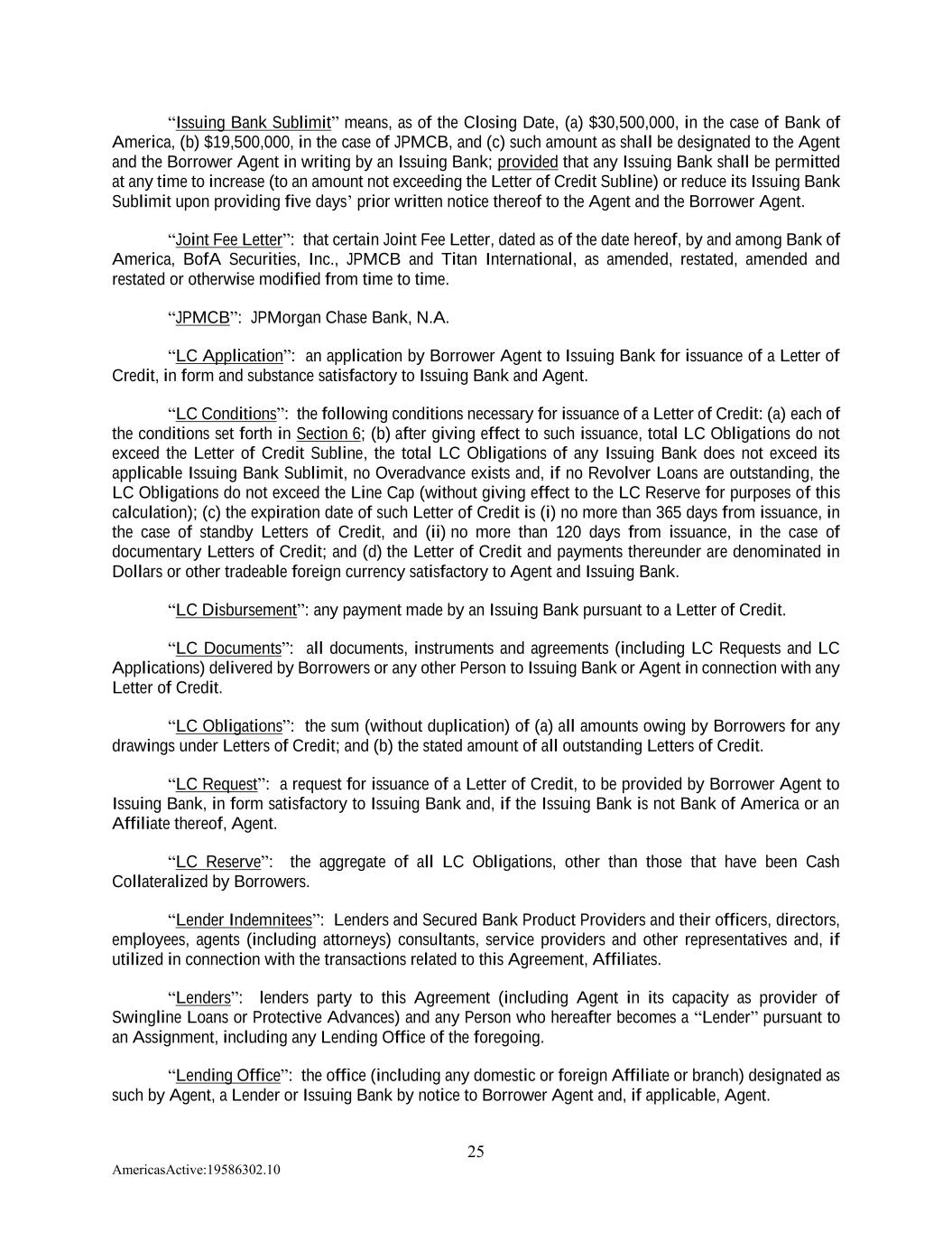 25 AmericasActive:19586302.10 “Issuing Bank Sublimit” means, as of the Closing Date, (a) $30,500,000, in the case of Bank of America, (b) $19,500,000, in the case of JPMCB, and (c) such amount as shall be designated to the Agent and the Borrower Agent in writing by an Issuing Bank; provided that any Issuing Bank shall be permitted at any time to increase (to an amount not exceeding the Letter of Credit Subline) or reduce its Issuing Bank Sublimit upon providing five days’ prior written notice thereof to the Agent and the Borrower Agent. “Joint Fee Letter”: that certain Joint Fee Letter, dated as of the date hereof, by and among Bank of America, BofA Securities, Inc., JPMCB and Titan International, as amended, restated, amended and restated or otherwise modified from time to time. “JPMCB”: JPMorgan Chase Bank, N.A. “LC Application”: an application by Borrower Agent to Issuing Bank for issuance of a Letter of Credit, in form and substance satisfactory to Issuing Bank and Agent. “LC Conditions”: the following conditions necessary for issuance of a Letter of Credit: (a) each of the conditions set forth in Section 6; (b) after giving effect to such issuance, total LC Obligations do not exceed the Letter of Credit Subline, the total LC Obligations of any Issuing Bank does not exceed its applicable Issuing Bank Sublimit, no Overadvance exists and, if no Revolver Loans are outstanding, the LC Obligations do not exceed the Line Cap (without giving effect to the LC Reserve for purposes of this calculation); (c) the expiration date of such Letter of Credit is (i) no more than 365 days from issuance, in the case of standby Letters of Credit, and (ii) no more than 120 days from issuance, in the case of documentary Letters of Credit; and (d) the Letter of Credit and payments thereunder are denominated in Dollars or other tradeable foreign currency satisfactory to Agent and Issuing Bank. “LC Disbursement”: any payment made by an Issuing Bank pursuant to a Letter of Credit. “LC Documents”: all documents, instruments and agreements (including LC Requests and LC Applications) delivered by Borrowers or any other Person to Issuing Bank or Agent in connection with any Letter of Credit. “LC Obligations”: the sum (without duplication) of (a) all amounts owing by Borrowers for any drawings under Letters of Credit; and (b) the stated amount of all outstanding Letters of Credit. “LC Request”: a request for issuance of a Letter of Credit, to be provided by Borrower Agent to Issuing Bank, in form satisfactory to Issuing Bank and, if the Issuing Bank is not Bank of America or an Affiliate thereof, Agent. “LC Reserve”: the aggregate of all LC Obligations, other than those that have been Cash Collateralized by Borrowers. “Lender Indemnitees”: Lenders and Secured Bank Product Providers and their officers, directors, employees, agents (including attorneys) consultants, service providers and other representatives and, if utilized in connection with the transactions related to this Agreement, Affiliates. “Lenders”: lenders party to this Agreement (including Agent in its capacity as provider of Swingline Loans or Protective Advances) and any Person who hereafter becomes a “Lender” pursuant to an Assignment, including any Lending Office of the foregoing. “Lending Office”: the office (including any domestic or foreign Affiliate or branch) designated as such by Agent, a Lender or Issuing Bank by notice to Borrower Agent and, if applicable, Agent.