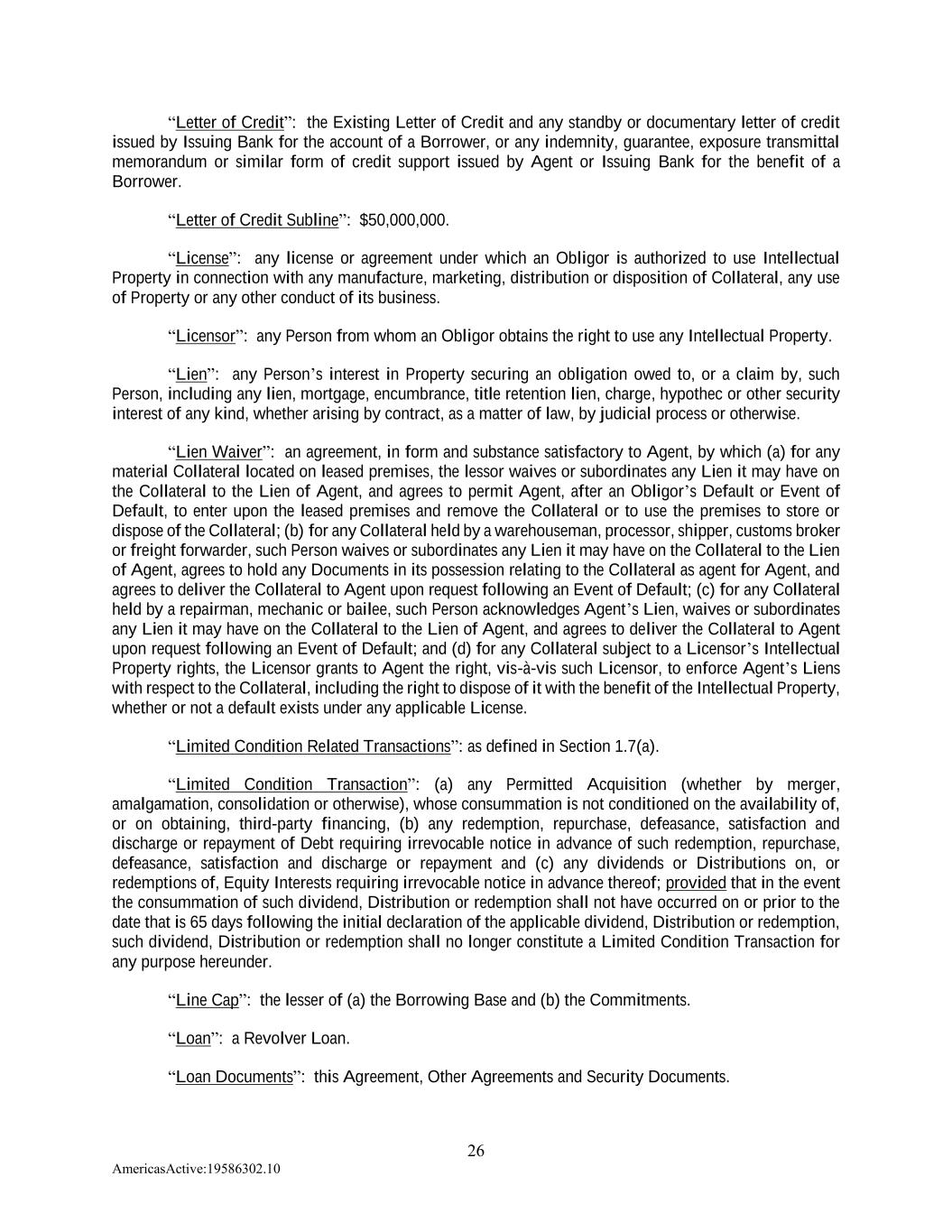 26 AmericasActive:19586302.10 “Letter of Credit”: the Existing Letter of Credit and any standby or documentary letter of credit issued by Issuing Bank for the account of a Borrower, or any indemnity, guarantee, exposure transmittal memorandum or similar form of credit support issued by Agent or Issuing Bank for the benefit of a Borrower. “Letter of Credit Subline”: $50,000,000. “License”: any license or agreement under which an Obligor is authorized to use Intellectual Property in connection with any manufacture, marketing, distribution or disposition of Collateral, any use of Property or any other conduct of its business. “Licensor”: any Person from whom an Obligor obtains the right to use any Intellectual Property. “Lien”: any Person’s interest in Property securing an obligation owed to, or a claim by, such Person, including any lien, mortgage, encumbrance, title retention lien, charge, hypothec or other security interest of any kind, whether arising by contract, as a matter of law, by judicial process or otherwise. “Lien Waiver”: an agreement, in form and substance satisfactory to Agent, by which (a) for any material Collateral located on leased premises, the lessor waives or subordinates any Lien it may have on the Collateral to the Lien of Agent, and agrees to permit Agent, after an Obligor’s Default or Event of Default, to enter upon the leased premises and remove the Collateral or to use the premises to store or dispose of the Collateral; (b) for any Collateral held by a warehouseman, processor, shipper, customs broker or freight forwarder, such Person waives or subordinates any Lien it may have on the Collateral to the Lien of Agent, agrees to hold any Documents in its possession relating to the Collateral as agent for Agent, and agrees to deliver the Collateral to Agent upon request following an Event of Default; (c) for any Collateral held by a repairman, mechanic or bailee, such Person acknowledges Agent’s Lien, waives or subordinates any Lien it may have on the Collateral to the Lien of Agent, and agrees to deliver the Collateral to Agent upon request following an Event of Default; and (d) for any Collateral subject to a Licensor’s Intellectual Property rights, the Licensor grants to Agent the right, vis-à-vis such Licensor, to enforce Agent’s Liens with respect to the Collateral, including the right to dispose of it with the benefit of the Intellectual Property, whether or not a default exists under any applicable License. “Limited Condition Related Transactions”: as defined in Section 1.7(a). “Limited Condition Transaction”: (a) any Permitted Acquisition (whether by merger, amalgamation, consolidation or otherwise), whose consummation is not conditioned on the availability of, or on obtaining, third-party financing, (b) any redemption, repurchase, defeasance, satisfaction and discharge or repayment of Debt requiring irrevocable notice in advance of such redemption, repurchase, defeasance, satisfaction and discharge or repayment and (c) any dividends or Distributions on, or redemptions of, Equity Interests requiring irrevocable notice in advance thereof; provided that in the event the consummation of such dividend, Distribution or redemption shall not have occurred on or prior to the date that is 65 days following the initial declaration of the applicable dividend, Distribution or redemption, such dividend, Distribution or redemption shall no longer constitute a Limited Condition Transaction for any purpose hereunder. “Line Cap”: the lesser of (a) the Borrowing Base and (b) the Commitments. “Loan”: a Revolver Loan. “Loan Documents”: this Agreement, Other Agreements and Security Documents.