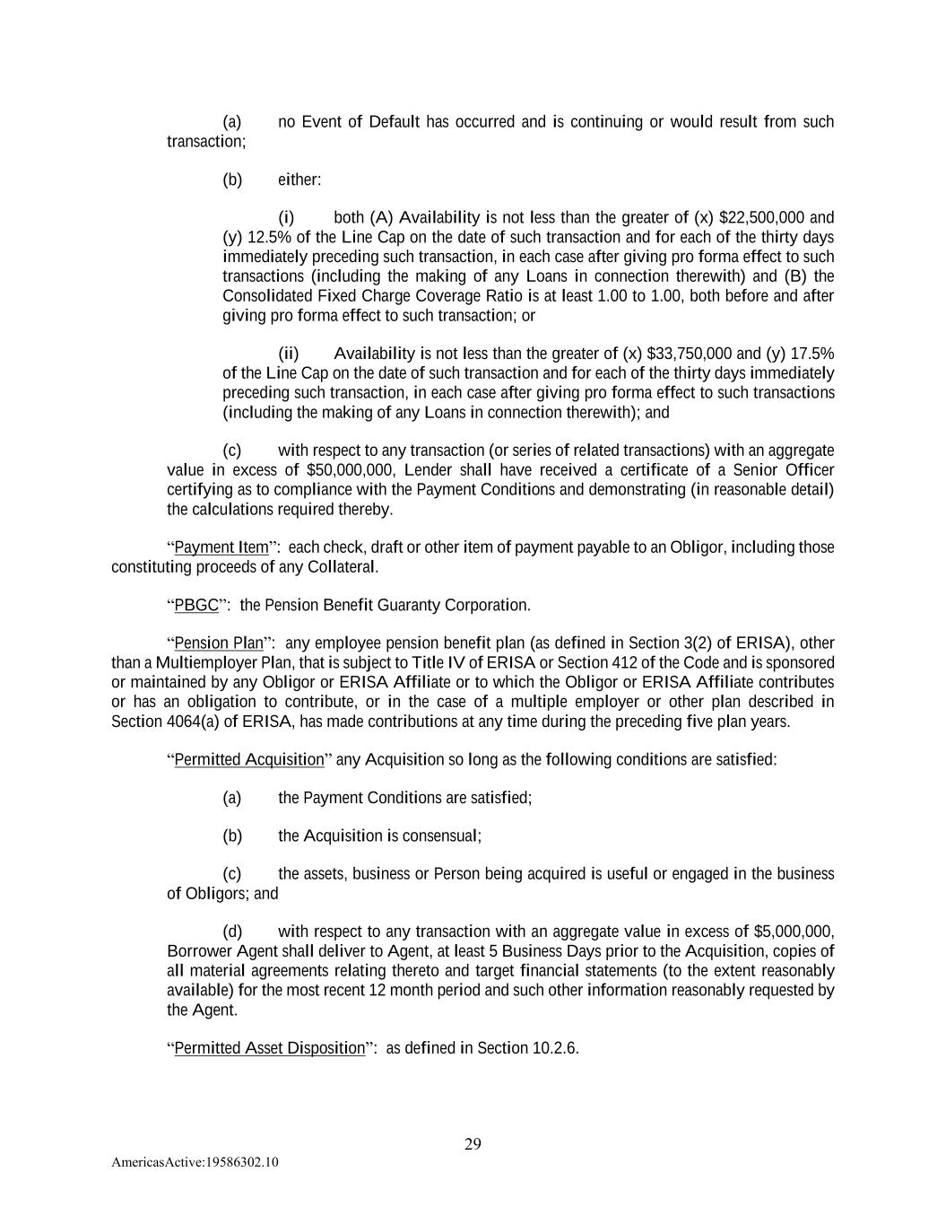 29 AmericasActive:19586302.10 (a) no Event of Default has occurred and is continuing or would result from such transaction; (b) either: (i) both (A) Availability is not less than the greater of (x) $22,500,000 and (y) 12.5% of the Line Cap on the date of such transaction and for each of the thirty days immediately preceding such transaction, in each case after giving pro forma effect to such transactions (including the making of any Loans in connection therewith) and (B) the Consolidated Fixed Charge Coverage Ratio is at least 1.00 to 1.00, both before and after giving pro forma effect to such transaction; or (ii) Availability is not less than the greater of (x) $33,750,000 and (y) 17.5% of the Line Cap on the date of such transaction and for each of the thirty days immediately preceding such transaction, in each case after giving pro forma effect to such transactions (including the making of any Loans in connection therewith); and (c) with respect to any transaction (or series of related transactions) with an aggregate value in excess of $50,000,000, Lender shall have received a certificate of a Senior Officer certifying as to compliance with the Payment Conditions and demonstrating (in reasonable detail) the calculations required thereby. “Payment Item”: each check, draft or other item of payment payable to an Obligor, including those constituting proceeds of any Collateral. “PBGC”: the Pension Benefit Guaranty Corporation. “Pension Plan”: any employee pension benefit plan (as defined in Section 3(2) of ERISA), other than a Multiemployer Plan, that is subject to Title IV of ERISA or Section 412 of the Code and is sponsored or maintained by any Obligor or ERISA Affiliate or to which the Obligor or ERISA Affiliate contributes or has an obligation to contribute, or in the case of a multiple employer or other plan described in Section 4064(a) of ERISA, has made contributions at any time during the preceding five plan years. “Permitted Acquisition” any Acquisition so long as the following conditions are satisfied: (a) the Payment Conditions are satisfied; (b) the Acquisition is consensual; (c) the assets, business or Person being acquired is useful or engaged in the business of Obligors; and (d) with respect to any transaction with an aggregate value in excess of $5,000,000, Borrower Agent shall deliver to Agent, at least 5 Business Days prior to the Acquisition, copies of all material agreements relating thereto and target financial statements (to the extent reasonably available) for the most recent 12 month period and such other information reasonably requested by the Agent. “Permitted Asset Disposition”: as defined in Section 10.2.6.