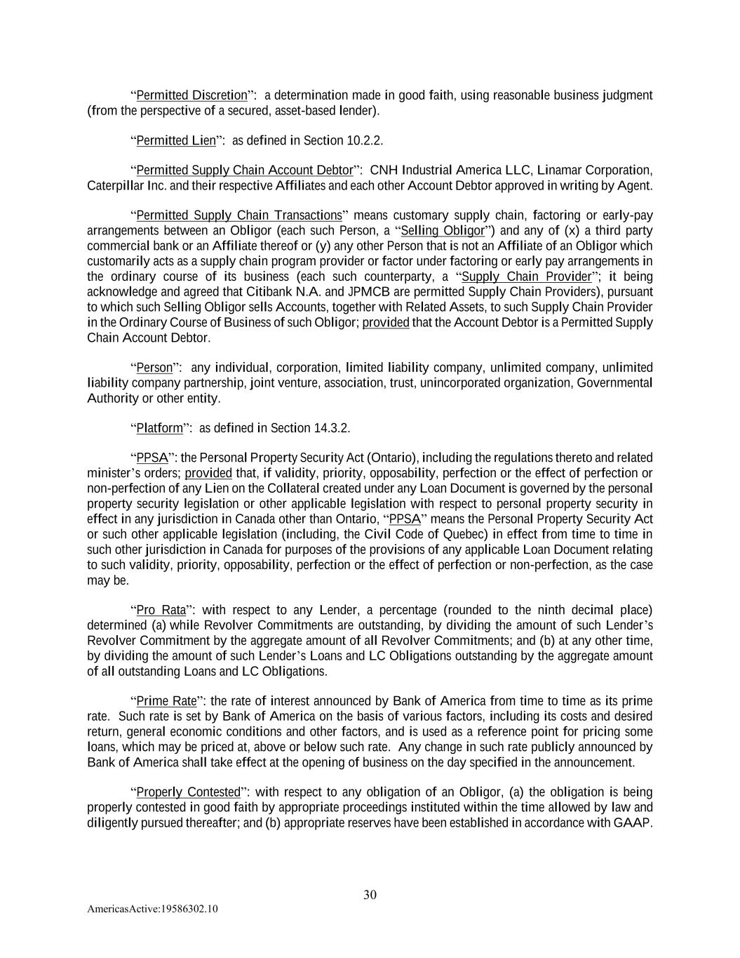 30 AmericasActive:19586302.10 “Permitted Discretion”: a determination made in good faith, using reasonable business judgment (from the perspective of a secured, asset-based lender). “Permitted Lien”: as defined in Section 10.2.2. “Permitted Supply Chain Account Debtor”: CNH Industrial America LLC, Linamar Corporation, Caterpillar Inc. and their respective Affiliates and each other Account Debtor approved in writing by Agent. “Permitted Supply Chain Transactions” means customary supply chain, factoring or early-pay arrangements between an Obligor (each such Person, a “Selling Obligor”) and any of (x) a third party commercial bank or an Affiliate thereof or (y) any other Person that is not an Affiliate of an Obligor which customarily acts as a supply chain program provider or factor under factoring or early pay arrangements in the ordinary course of its business (each such counterparty, a “Supply Chain Provider”; it being acknowledge and agreed that Citibank N.A. and JPMCB are permitted Supply Chain Providers), pursuant to which such Selling Obligor sells Accounts, together with Related Assets, to such Supply Chain Provider in the Ordinary Course of Business of such Obligor; provided that the Account Debtor is a Permitted Supply Chain Account Debtor. “Person”: any individual, corporation, limited liability company, unlimited company, unlimited liability company partnership, joint venture, association, trust, unincorporated organization, Governmental Authority or other entity. “Platform”: as defined in Section 14.3.2. “PPSA”: the Personal Property Security Act (Ontario), including the regulations thereto and related minister’s orders; provided that, if validity, priority, opposability, perfection or the effect of perfection or non-perfection of any Lien on the Collateral created under any Loan Document is governed by the personal property security legislation or other applicable legislation with respect to personal property security in effect in any jurisdiction in Canada other than Ontario, “PPSA” means the Personal Property Security Act or such other applicable legislation (including, the Civil Code of Quebec) in effect from time to time in such other jurisdiction in Canada for purposes of the provisions of any applicable Loan Document relating to such validity, priority, opposability, perfection or the effect of perfection or non-perfection, as the case may be. “Pro Rata”: with respect to any Lender, a percentage (rounded to the ninth decimal place) determined (a) while Revolver Commitments are outstanding, by dividing the amount of such Lender’s Revolver Commitment by the aggregate amount of all Revolver Commitments; and (b) at any other time, by dividing the amount of such Lender’s Loans and LC Obligations outstanding by the aggregate amount of all outstanding Loans and LC Obligations. “Prime Rate”: the rate of interest announced by Bank of America from time to time as its prime rate. Such rate is set by Bank of America on the basis of various factors, including its costs and desired return, general economic conditions and other factors, and is used as a reference point for pricing some loans, which may be priced at, above or below such rate. Any change in such rate publicly announced by Bank of America shall take effect at the opening of business on the day specified in the announcement. “Properly Contested”: with respect to any obligation of an Obligor, (a) the obligation is being properly contested in good faith by appropriate proceedings instituted within the time allowed by law and diligently pursued thereafter; and (b) appropriate reserves have been established in accordance with GAAP.