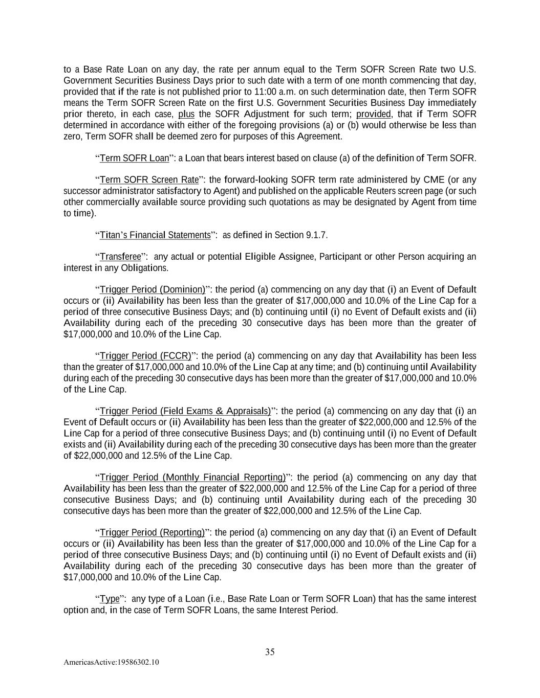 35 AmericasActive:19586302.10 to a Base Rate Loan on any day, the rate per annum equal to the Term SOFR Screen Rate two U.S. Government Securities Business Days prior to such date with a term of one month commencing that day, provided that if the rate is not published prior to 11:00 a.m. on such determination date, then Term SOFR means the Term SOFR Screen Rate on the first U.S. Government Securities Business Day immediately prior thereto, in each case, plus the SOFR Adjustment for such term; provided, that if Term SOFR determined in accordance with either of the foregoing provisions (a) or (b) would otherwise be less than zero, Term SOFR shall be deemed zero for purposes of this Agreement. “Term SOFR Loan”: a Loan that bears interest based on clause (a) of the definition of Term SOFR. “Term SOFR Screen Rate”: the forward-looking SOFR term rate administered by CME (or any successor administrator satisfactory to Agent) and published on the applicable Reuters screen page (or such other commercially available source providing such quotations as may be designated by Agent from time to time). “Titan’s Financial Statements”: as defined in Section 9.1.7. “Transferee”: any actual or potential Eligible Assignee, Participant or other Person acquiring an interest in any Obligations. “Trigger Period (Dominion)”: the period (a) commencing on any day that (i) an Event of Default occurs or (ii) Availability has been less than the greater of $17,000,000 and 10.0% of the Line Cap for a period of three consecutive Business Days; and (b) continuing until (i) no Event of Default exists and (ii) Availability during each of the preceding 30 consecutive days has been more than the greater of $17,000,000 and 10.0% of the Line Cap. “Trigger Period (FCCR)”: the period (a) commencing on any day that Availability has been less than the greater of $17,000,000 and 10.0% of the Line Cap at any time; and (b) continuing until Availability during each of the preceding 30 consecutive days has been more than the greater of $17,000,000 and 10.0% of the Line Cap. “Trigger Period (Field Exams & Appraisals)”: the period (a) commencing on any day that (i) an Event of Default occurs or (ii) Availability has been less than the greater of $22,000,000 and 12.5% of the Line Cap for a period of three consecutive Business Days; and (b) continuing until (i) no Event of Default exists and (ii) Availability during each of the preceding 30 consecutive days has been more than the greater of $22,000,000 and 12.5% of the Line Cap. “Trigger Period (Monthly Financial Reporting)”: the period (a) commencing on any day that Availability has been less than the greater of $22,000,000 and 12.5% of the Line Cap for a period of three consecutive Business Days; and (b) continuing until Availability during each of the preceding 30 consecutive days has been more than the greater of $22,000,000 and 12.5% of the Line Cap. “Trigger Period (Reporting)”: the period (a) commencing on any day that (i) an Event of Default occurs or (ii) Availability has been less than the greater of $17,000,000 and 10.0% of the Line Cap for a period of three consecutive Business Days; and (b) continuing until (i) no Event of Default exists and (ii) Availability during each of the preceding 30 consecutive days has been more than the greater of $17,000,000 and 10.0% of the Line Cap. “Type”: any type of a Loan (i.e., Base Rate Loan or Term SOFR Loan) that has the same interest option and, in the case of Term SOFR Loans, the same Interest Period.