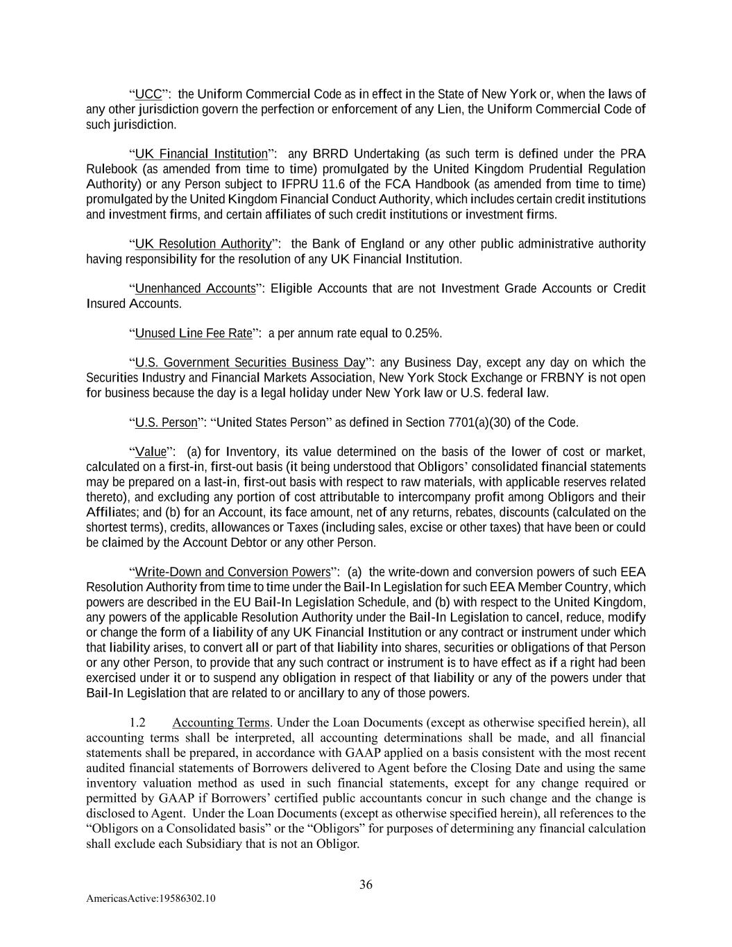 36 AmericasActive:19586302.10 “UCC”: the Uniform Commercial Code as in effect in the State of New York or, when the laws of any other jurisdiction govern the perfection or enforcement of any Lien, the Uniform Commercial Code of such jurisdiction. “UK Financial Institution”: any BRRD Undertaking (as such term is defined under the PRA Rulebook (as amended from time to time) promulgated by the United Kingdom Prudential Regulation Authority) or any Person subject to IFPRU 11.6 of the FCA Handbook (as amended from time to time) promulgated by the United Kingdom Financial Conduct Authority, which includes certain credit institutions and investment firms, and certain affiliates of such credit institutions or investment firms. “UK Resolution Authority”: the Bank of England or any other public administrative authority having responsibility for the resolution of any UK Financial Institution. “Unenhanced Accounts”: Eligible Accounts that are not Investment Grade Accounts or Credit Insured Accounts. “Unused Line Fee Rate”: a per annum rate equal to 0.25%. “U.S. Government Securities Business Day”: any Business Day, except any day on which the Securities Industry and Financial Markets Association, New York Stock Exchange or FRBNY is not open for business because the day is a legal holiday under New York law or U.S. federal law. “U.S. Person”: “United States Person” as defined in Section 7701(a)(30) of the Code. “Value”: (a) for Inventory, its value determined on the basis of the lower of cost or market, calculated on a first-in, first-out basis (it being understood that Obligors’ consolidated financial statements may be prepared on a last-in, first-out basis with respect to raw materials, with applicable reserves related thereto), and excluding any portion of cost attributable to intercompany profit among Obligors and their Affiliates; and (b) for an Account, its face amount, net of any returns, rebates, discounts (calculated on the shortest terms), credits, allowances or Taxes (including sales, excise or other taxes) that have been or could be claimed by the Account Debtor or any other Person. “Write-Down and Conversion Powers”: (a) the write-down and conversion powers of such EEA Resolution Authority from time to time under the Bail-In Legislation for such EEA Member Country, which powers are described in the EU Bail-In Legislation Schedule, and (b) with respect to the United Kingdom, any powers of the applicable Resolution Authority under the Bail-In Legislation to cancel, reduce, modify or change the form of a liability of any UK Financial Institution or any contract or instrument under which that liability arises, to convert all or part of that liability into shares, securities or obligations of that Person or any other Person, to provide that any such contract or instrument is to have effect as if a right had been exercised under it or to suspend any obligation in respect of that liability or any of the powers under that Bail-In Legislation that are related to or ancillary to any of those powers. 1.2 Accounting Terms. Under the Loan Documents (except as otherwise specified herein), all accounting terms shall be interpreted, all accounting determinations shall be made, and all financial statements shall be prepared, in accordance with GAAP applied on a basis consistent with the most recent audited financial statements of Borrowers delivered to Agent before the Closing Date and using the same inventory valuation method as used in such financial statements, except for any change required or permitted by GAAP if Borrowers’ certified public accountants concur in such change and the change is disclosed to Agent. Under the Loan Documents (except as otherwise specified herein), all references to the “Obligors on a Consolidated basis” or the “Obligors” for purposes of determining any financial calculation shall exclude each Subsidiary that is not an Obligor.