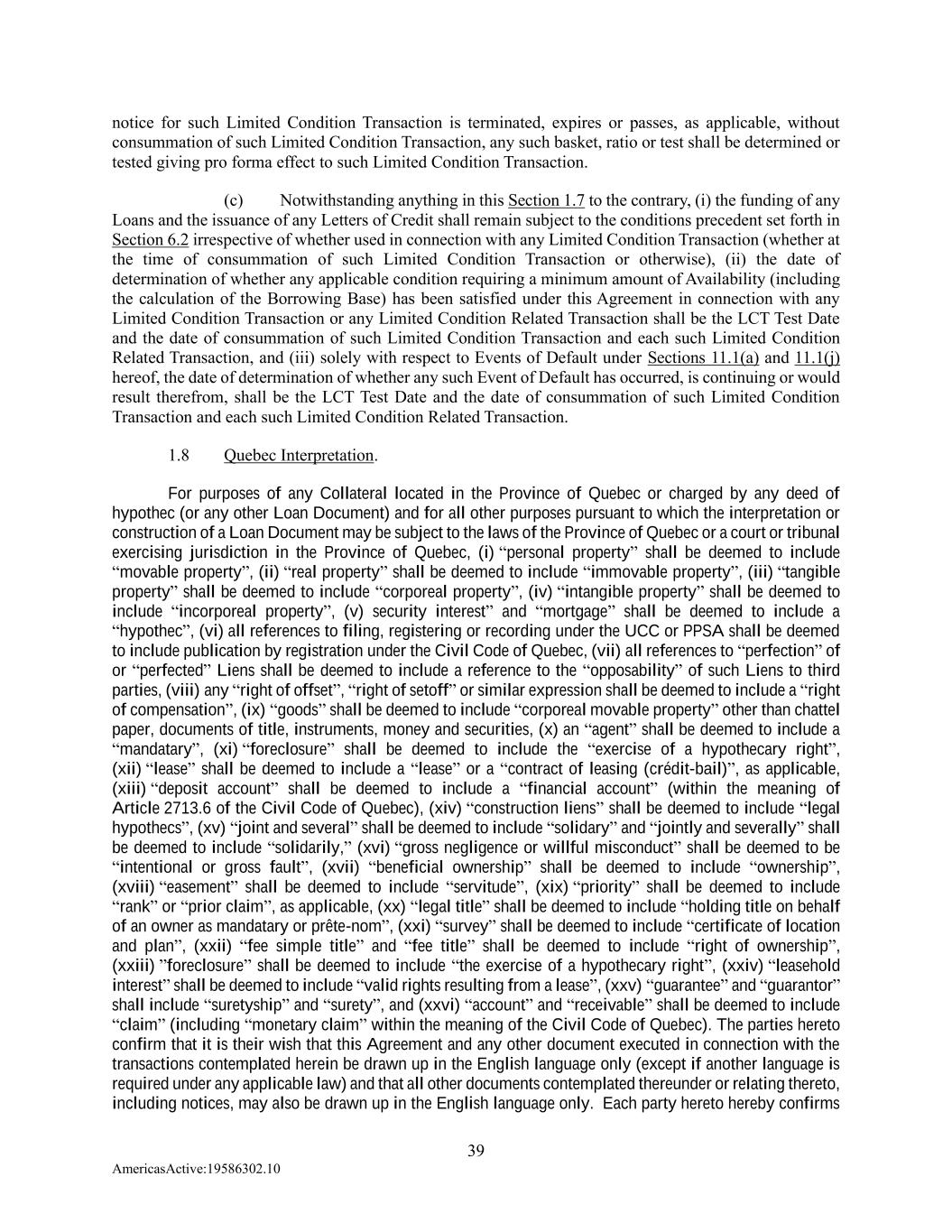 39 AmericasActive:19586302.10 notice for such Limited Condition Transaction is terminated, expires or passes, as applicable, without consummation of such Limited Condition Transaction, any such basket, ratio or test shall be determined or tested giving pro forma effect to such Limited Condition Transaction. (c) Notwithstanding anything in this Section 1.7 to the contrary, (i) the funding of any Loans and the issuance of any Letters of Credit shall remain subject to the conditions precedent set forth in Section 6.2 irrespective of whether used in connection with any Limited Condition Transaction (whether at the time of consummation of such Limited Condition Transaction or otherwise), (ii) the date of determination of whether any applicable condition requiring a minimum amount of Availability (including the calculation of the Borrowing Base) has been satisfied under this Agreement in connection with any Limited Condition Transaction or any Limited Condition Related Transaction shall be the LCT Test Date and the date of consummation of such Limited Condition Transaction and each such Limited Condition Related Transaction, and (iii) solely with respect to Events of Default under Sections 11.1(a) and 11.1(j) hereof, the date of determination of whether any such Event of Default has occurred, is continuing or would result therefrom, shall be the LCT Test Date and the date of consummation of such Limited Condition Transaction and each such Limited Condition Related Transaction. 1.8 Quebec Interpretation. For purposes of any Collateral located in the Province of Quebec or charged by any deed of hypothec (or any other Loan Document) and for all other purposes pursuant to which the interpretation or construction of a Loan Document may be subject to the laws of the Province of Quebec or a court or tribunal exercising jurisdiction in the Province of Quebec, (i) “personal property” shall be deemed to include “movable property”, (ii) “real property” shall be deemed to include “immovable property”, (iii) “tangible property” shall be deemed to include “corporeal property”, (iv) “intangible property” shall be deemed to include “incorporeal property”, (v) security interest” and “mortgage” shall be deemed to include a “hypothec”, (vi) all references to filing, registering or recording under the UCC or PPSA shall be deemed to include publication by registration under the Civil Code of Quebec, (vii) all references to “perfection” of or “perfected” Liens shall be deemed to include a reference to the “opposability” of such Liens to third parties, (viii) any “right of offset”, “right of setoff” or similar expression shall be deemed to include a “right of compensation”, (ix) “goods” shall be deemed to include “corporeal movable property” other than chattel paper, documents of title, instruments, money and securities, (x) an “agent” shall be deemed to include a “mandatary”, (xi) “foreclosure” shall be deemed to include the “exercise of a hypothecary right”, (xii) “lease” shall be deemed to include a “lease” or a “contract of leasing (crédit-bail)”, as applicable, (xiii) “deposit account” shall be deemed to include a “financial account” (within the meaning of Article 2713.6 of the Civil Code of Quebec), (xiv) “construction liens” shall be deemed to include “legal hypothecs”, (xv) “joint and several” shall be deemed to include “solidary” and “jointly and severally” shall be deemed to include “solidarily,” (xvi) “gross negligence or willful misconduct” shall be deemed to be “intentional or gross fault”, (xvii) “beneficial ownership” shall be deemed to include “ownership”, (xviii) “easement” shall be deemed to include “servitude”, (xix) “priority” shall be deemed to include “rank” or “prior claim”, as applicable, (xx) “legal title” shall be deemed to include “holding title on behalf of an owner as mandatary or prête-nom”, (xxi) “survey” shall be deemed to include “certificate of location and plan”, (xxii) “fee simple title” and “fee title” shall be deemed to include “right of ownership”, (xxiii) ”foreclosure” shall be deemed to include “the exercise of a hypothecary right”, (xxiv) “leasehold interest” shall be deemed to include “valid rights resulting from a lease”, (xxv) “guarantee” and “guarantor” shall include “suretyship” and “surety”, and (xxvi) “account” and “receivable” shall be deemed to include “claim” (including “monetary claim” within the meaning of the Civil Code of Quebec). The parties hereto confirm that it is their wish that this Agreement and any other document executed in connection with the transactions contemplated herein be drawn up in the English language only (except if another language is required under any applicable law) and that all other documents contemplated thereunder or relating thereto, including notices, may also be drawn up in the English language only. Each party hereto hereby confirms
