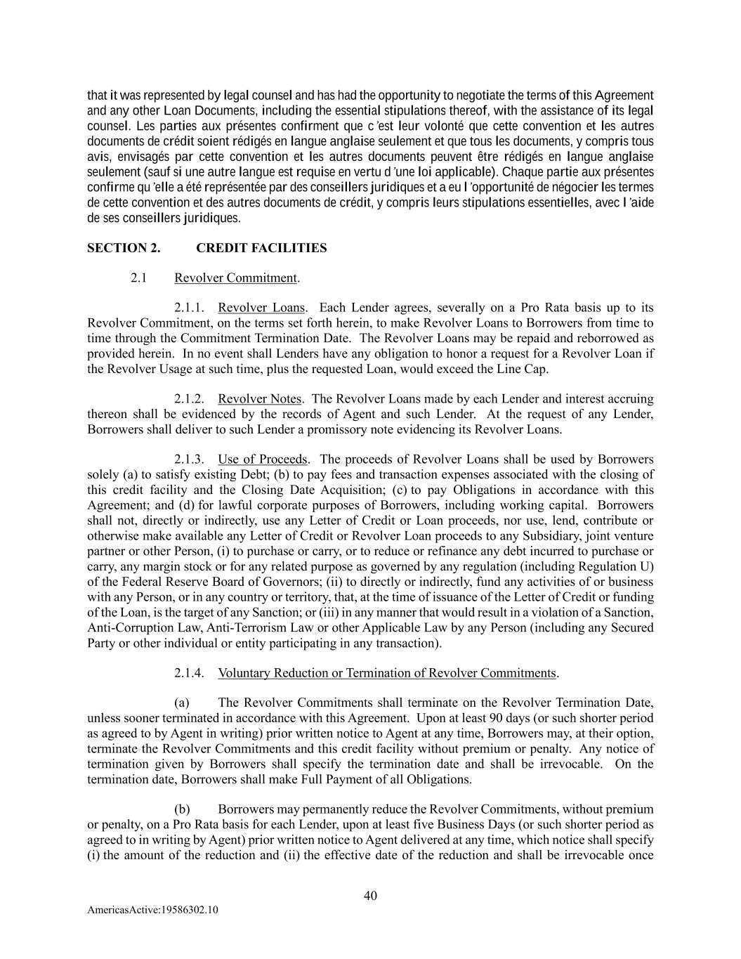 40 AmericasActive:19586302.10 that it was represented by legal counsel and has had the opportunity to negotiate the terms of this Agreement and any other Loan Documents, including the essential stipulations thereof, with the assistance of its legal counsel. Les parties aux présentes confirment que c’est leur volonté que cette convention et les autres documents de crédit soient rédigés en langue anglaise seulement et que tous les documents, y compris tous avis, envisagés par cette convention et les autres documents peuvent être rédigés en langue anglaise seulement (sauf si une autre langue est requise en vertu d’une loi applicable). Chaque partie aux présentes confirme qu’elle a été représentée par des conseillers juridiques et a eu l’opportunité de négocier les termes de cette convention et des autres documents de crédit, y compris leurs stipulations essentielles, avec l’aide de ses conseillers juridiques. SECTION 2. CREDIT FACILITIES 2.1 Revolver Commitment. 2.1.1. Revolver Loans. Each Lender agrees, severally on a Pro Rata basis up to its Revolver Commitment, on the terms set forth herein, to make Revolver Loans to Borrowers from time to time through the Commitment Termination Date. The Revolver Loans may be repaid and reborrowed as provided herein. In no event shall Lenders have any obligation to honor a request for a Revolver Loan if the Revolver Usage at such time, plus the requested Loan, would exceed the Line Cap. 2.1.2. Revolver Notes. The Revolver Loans made by each Lender and interest accruing thereon shall be evidenced by the records of Agent and such Lender. At the request of any Lender, Borrowers shall deliver to such Lender a promissory note evidencing its Revolver Loans. 2.1.3. Use of Proceeds. The proceeds of Revolver Loans shall be used by Borrowers solely (a) to satisfy existing Debt; (b) to pay fees and transaction expenses associated with the closing of this credit facility and the Closing Date Acquisition; (c) to pay Obligations in accordance with this Agreement; and (d) for lawful corporate purposes of Borrowers, including working capital. Borrowers shall not, directly or indirectly, use any Letter of Credit or Loan proceeds, nor use, lend, contribute or otherwise make available any Letter of Credit or Revolver Loan proceeds to any Subsidiary, joint venture partner or other Person, (i) to purchase or carry, or to reduce or refinance any debt incurred to purchase or carry, any margin stock or for any related purpose as governed by any regulation (including Regulation U) of the Federal Reserve Board of Governors; (ii) to directly or indirectly, fund any activities of or business with any Person, or in any country or territory, that, at the time of issuance of the Letter of Credit or funding of the Loan, is the target of any Sanction; or (iii) in any manner that would result in a violation of a Sanction, Anti-Corruption Law, Anti-Terrorism Law or other Applicable Law by any Person (including any Secured Party or other individual or entity participating in any transaction). 2.1.4. Voluntary Reduction or Termination of Revolver Commitments. (a) The Revolver Commitments shall terminate on the Revolver Termination Date, unless sooner terminated in accordance with this Agreement. Upon at least 90 days (or such shorter period as agreed to by Agent in writing) prior written notice to Agent at any time, Borrowers may, at their option, terminate the Revolver Commitments and this credit facility without premium or penalty. Any notice of termination given by Borrowers shall specify the termination date and shall be irrevocable. On the termination date, Borrowers shall make Full Payment of all Obligations. (b) Borrowers may permanently reduce the Revolver Commitments, without premium or penalty, on a Pro Rata basis for each Lender, upon at least five Business Days (or such shorter period as agreed to in writing by Agent) prior written notice to Agent delivered at any time, which notice shall specify (i) the amount of the reduction and (ii) the effective date of the reduction and shall be irrevocable once