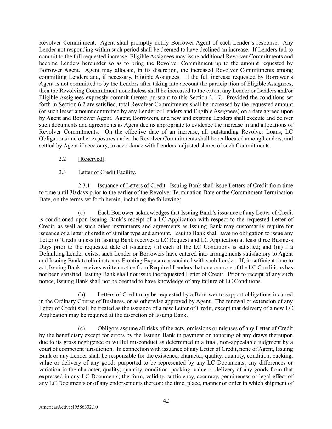 42 AmericasActive:19586302.10 Revolver Commitment. Agent shall promptly notify Borrower Agent of each Lender’s response. Any Lender not responding within such period shall be deemed to have declined an increase. If Lenders fail to commit to the full requested increase, Eligible Assignees may issue additional Revolver Commitments and become Lenders hereunder so as to bring the Revolver Commitment up to the amount requested by Borrower Agent. Agent may allocate, in its discretion, the increased Revolver Commitments among committing Lenders and, if necessary, Eligible Assignees. If the full increase requested by Borrower’s Agent is not committed to by the Lenders after taking into account the participation of Eligible Assignees, then the Revolving Commitment nonetheless shall be increased to the extent any Lender or Lenders and/or Eligible Assignees expressly commit thereto pursuant to this Section 2.1.7. Provided the conditions set forth in Section 6.2 are satisfied, total Revolver Commitments shall be increased by the requested amount (or such lesser amount committed by any Lender or Lenders and Eligible Assignees) on a date agreed upon by Agent and Borrower Agent. Agent, Borrowers, and new and existing Lenders shall execute and deliver such documents and agreements as Agent deems appropriate to evidence the increase in and allocations of Revolver Commitments. On the effective date of an increase, all outstanding Revolver Loans, LC Obligations and other exposures under the Revolver Commitments shall be reallocated among Lenders, and settled by Agent if necessary, in accordance with Lenders’ adjusted shares of such Commitments. 2.2 [Reserved]. 2.3 Letter of Credit Facility. 2.3.1. Issuance of Letters of Credit. Issuing Bank shall issue Letters of Credit from time to time until 30 days prior to the earlier of the Revolver Termination Date or the Commitment Termination Date, on the terms set forth herein, including the following: (a) Each Borrower acknowledges that Issuing Bank’s issuance of any Letter of Credit is conditioned upon Issuing Bank’s receipt of a LC Application with respect to the requested Letter of Credit, as well as such other instruments and agreements as Issuing Bank may customarily require for issuance of a letter of credit of similar type and amount. Issuing Bank shall have no obligation to issue any Letter of Credit unless (i) Issuing Bank receives a LC Request and LC Application at least three Business Days prior to the requested date of issuance; (ii) each of the LC Conditions is satisfied; and (iii) if a Defaulting Lender exists, such Lender or Borrowers have entered into arrangements satisfactory to Agent and Issuing Bank to eliminate any Fronting Exposure associated with such Lender. If, in sufficient time to act, Issuing Bank receives written notice from Required Lenders that one or more of the LC Conditions has not been satisfied, Issuing Bank shall not issue the requested Letter of Credit. Prior to receipt of any such notice, Issuing Bank shall not be deemed to have knowledge of any failure of LC Conditions. (b) Letters of Credit may be requested by a Borrower to support obligations incurred in the Ordinary Course of Business, or as otherwise approved by Agent. The renewal or extension of any Letter of Credit shall be treated as the issuance of a new Letter of Credit, except that delivery of a new LC Application may be required at the discretion of Issuing Bank. (c) Obligors assume all risks of the acts, omissions or misuses of any Letter of Credit by the beneficiary except for errors by the Issuing Bank in payment or honoring of any draws thereupon due to its gross negligence or willful misconduct as determined in a final, non-appealable judgment by a court of competent jurisdiction. In connection with issuance of any Letter of Credit, none of Agent, Issuing Bank or any Lender shall be responsible for the existence, character, quality, quantity, condition, packing, value or delivery of any goods purported to be represented by any LC Documents; any differences or variation in the character, quality, quantity, condition, packing, value or delivery of any goods from that expressed in any LC Documents; the form, validity, sufficiency, accuracy, genuineness or legal effect of any LC Documents or of any endorsements thereon; the time, place, manner or order in which shipment of