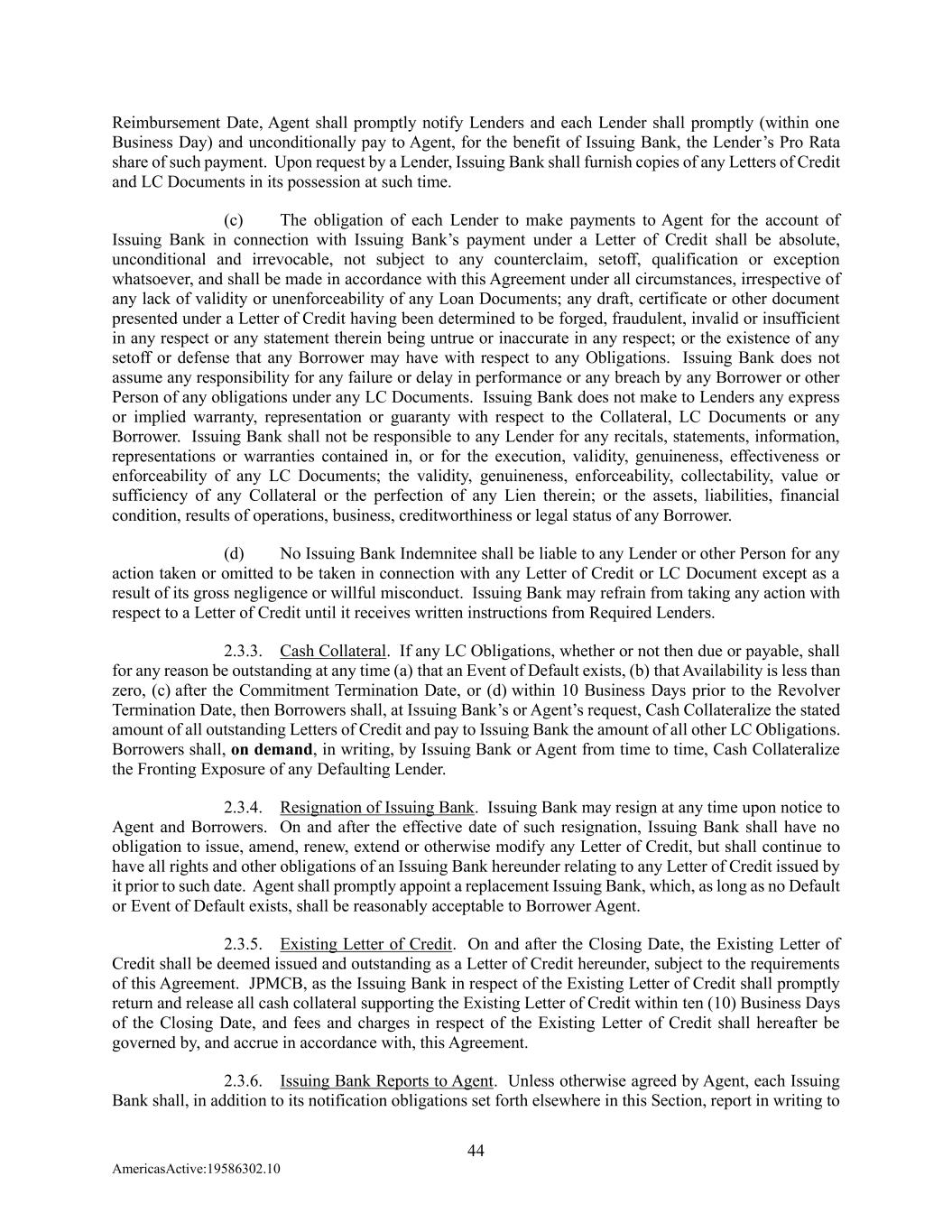 44 AmericasActive:19586302.10 Reimbursement Date, Agent shall promptly notify Lenders and each Lender shall promptly (within one Business Day) and unconditionally pay to Agent, for the benefit of Issuing Bank, the Lender’s Pro Rata share of such payment. Upon request by a Lender, Issuing Bank shall furnish copies of any Letters of Credit and LC Documents in its possession at such time. (c) The obligation of each Lender to make payments to Agent for the account of Issuing Bank in connection with Issuing Bank’s payment under a Letter of Credit shall be absolute, unconditional and irrevocable, not subject to any counterclaim, setoff, qualification or exception whatsoever, and shall be made in accordance with this Agreement under all circumstances, irrespective of any lack of validity or unenforceability of any Loan Documents; any draft, certificate or other document presented under a Letter of Credit having been determined to be forged, fraudulent, invalid or insufficient in any respect or any statement therein being untrue or inaccurate in any respect; or the existence of any setoff or defense that any Borrower may have with respect to any Obligations. Issuing Bank does not assume any responsibility for any failure or delay in performance or any breach by any Borrower or other Person of any obligations under any LC Documents. Issuing Bank does not make to Lenders any express or implied warranty, representation or guaranty with respect to the Collateral, LC Documents or any Borrower. Issuing Bank shall not be responsible to any Lender for any recitals, statements, information, representations or warranties contained in, or for the execution, validity, genuineness, effectiveness or enforceability of any LC Documents; the validity, genuineness, enforceability, collectability, value or sufficiency of any Collateral or the perfection of any Lien therein; or the assets, liabilities, financial condition, results of operations, business, creditworthiness or legal status of any Borrower. (d) No Issuing Bank Indemnitee shall be liable to any Lender or other Person for any action taken or omitted to be taken in connection with any Letter of Credit or LC Document except as a result of its gross negligence or willful misconduct. Issuing Bank may refrain from taking any action with respect to a Letter of Credit until it receives written instructions from Required Lenders. 2.3.3. Cash Collateral. If any LC Obligations, whether or not then due or payable, shall for any reason be outstanding at any time (a) that an Event of Default exists, (b) that Availability is less than zero, (c) after the Commitment Termination Date, or (d) within 10 Business Days prior to the Revolver Termination Date, then Borrowers shall, at Issuing Bank’s or Agent’s request, Cash Collateralize the stated amount of all outstanding Letters of Credit and pay to Issuing Bank the amount of all other LC Obligations. Borrowers shall, on demand, in writing, by Issuing Bank or Agent from time to time, Cash Collateralize the Fronting Exposure of any Defaulting Lender. 2.3.4. Resignation of Issuing Bank. Issuing Bank may resign at any time upon notice to Agent and Borrowers. On and after the effective date of such resignation, Issuing Bank shall have no obligation to issue, amend, renew, extend or otherwise modify any Letter of Credit, but shall continue to have all rights and other obligations of an Issuing Bank hereunder relating to any Letter of Credit issued by it prior to such date. Agent shall promptly appoint a replacement Issuing Bank, which, as long as no Default or Event of Default exists, shall be reasonably acceptable to Borrower Agent. 2.3.5. Existing Letter of Credit. On and after the Closing Date, the Existing Letter of Credit shall be deemed issued and outstanding as a Letter of Credit hereunder, subject to the requirements of this Agreement. JPMCB, as the Issuing Bank in respect of the Existing Letter of Credit shall promptly return and release all cash collateral supporting the Existing Letter of Credit within ten (10) Business Days of the Closing Date, and fees and charges in respect of the Existing Letter of Credit shall hereafter be governed by, and accrue in accordance with, this Agreement. 2.3.6. Issuing Bank Reports to Agent. Unless otherwise agreed by Agent, each Issuing Bank shall, in addition to its notification obligations set forth elsewhere in this Section, report in writing to
