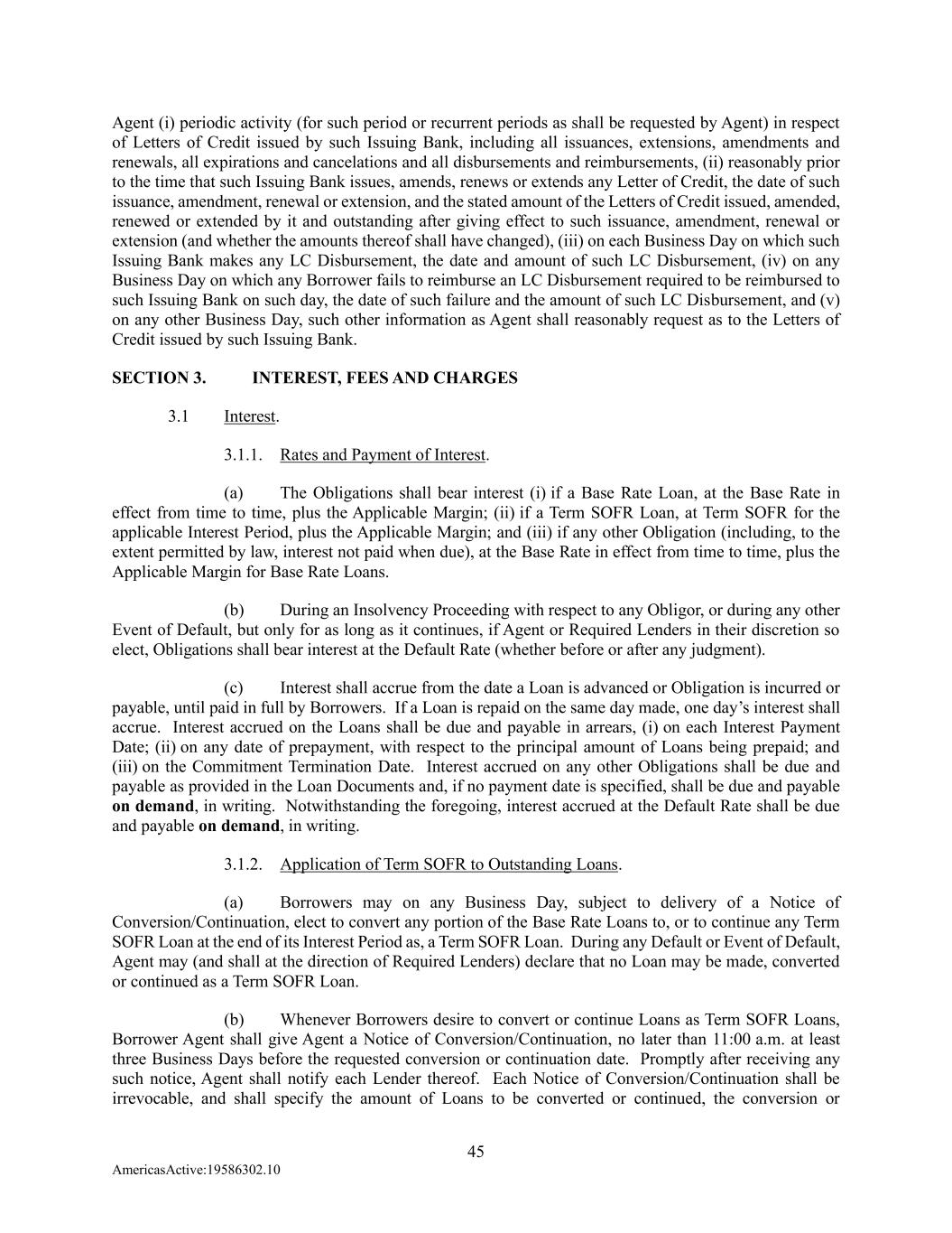 45 AmericasActive:19586302.10 Agent (i) periodic activity (for such period or recurrent periods as shall be requested by Agent) in respect of Letters of Credit issued by such Issuing Bank, including all issuances, extensions, amendments and renewals, all expirations and cancelations and all disbursements and reimbursements, (ii) reasonably prior to the time that such Issuing Bank issues, amends, renews or extends any Letter of Credit, the date of such issuance, amendment, renewal or extension, and the stated amount of the Letters of Credit issued, amended, renewed or extended by it and outstanding after giving effect to such issuance, amendment, renewal or extension (and whether the amounts thereof shall have changed), (iii) on each Business Day on which such Issuing Bank makes any LC Disbursement, the date and amount of such LC Disbursement, (iv) on any Business Day on which any Borrower fails to reimburse an LC Disbursement required to be reimbursed to such Issuing Bank on such day, the date of such failure and the amount of such LC Disbursement, and (v) on any other Business Day, such other information as Agent shall reasonably request as to the Letters of Credit issued by such Issuing Bank. SECTION 3. INTEREST, FEES AND CHARGES 3.1 Interest. 3.1.1. Rates and Payment of Interest. (a) The Obligations shall bear interest (i) if a Base Rate Loan, at the Base Rate in effect from time to time, plus the Applicable Margin; (ii) if a Term SOFR Loan, at Term SOFR for the applicable Interest Period, plus the Applicable Margin; and (iii) if any other Obligation (including, to the extent permitted by law, interest not paid when due), at the Base Rate in effect from time to time, plus the Applicable Margin for Base Rate Loans. (b) During an Insolvency Proceeding with respect to any Obligor, or during any other Event of Default, but only for as long as it continues, if Agent or Required Lenders in their discretion so elect, Obligations shall bear interest at the Default Rate (whether before or after any judgment). (c) Interest shall accrue from the date a Loan is advanced or Obligation is incurred or payable, until paid in full by Borrowers. If a Loan is repaid on the same day made, one day’s interest shall accrue. Interest accrued on the Loans shall be due and payable in arrears, (i) on each Interest Payment Date; (ii) on any date of prepayment, with respect to the principal amount of Loans being prepaid; and (iii) on the Commitment Termination Date. Interest accrued on any other Obligations shall be due and payable as provided in the Loan Documents and, if no payment date is specified, shall be due and payable on demand, in writing. Notwithstanding the foregoing, interest accrued at the Default Rate shall be due and payable on demand, in writing. 3.1.2. Application of Term SOFR to Outstanding Loans. (a) Borrowers may on any Business Day, subject to delivery of a Notice of Conversion/Continuation, elect to convert any portion of the Base Rate Loans to, or to continue any Term SOFR Loan at the end of its Interest Period as, a Term SOFR Loan. During any Default or Event of Default, Agent may (and shall at the direction of Required Lenders) declare that no Loan may be made, converted or continued as a Term SOFR Loan. (b) Whenever Borrowers desire to convert or continue Loans as Term SOFR Loans, Borrower Agent shall give Agent a Notice of Conversion/Continuation, no later than 11:00 a.m. at least three Business Days before the requested conversion or continuation date. Promptly after receiving any such notice, Agent shall notify each Lender thereof. Each Notice of Conversion/Continuation shall be irrevocable, and shall specify the amount of Loans to be converted or continued, the conversion or