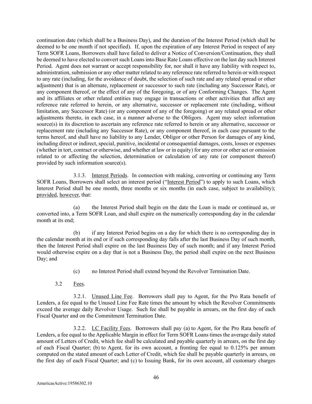 46 AmericasActive:19586302.10 continuation date (which shall be a Business Day), and the duration of the Interest Period (which shall be deemed to be one month if not specified). If, upon the expiration of any Interest Period in respect of any Term SOFR Loans, Borrowers shall have failed to deliver a Notice of Conversion/Continuation, they shall be deemed to have elected to convert such Loans into Base Rate Loans effective on the last day such Interest Period. Agent does not warrant or accept responsibility for, nor shall it have any liability with respect to, administration, submission or any other matter related to any reference rate referred to herein or with respect to any rate (including, for the avoidance of doubt, the selection of such rate and any related spread or other adjustment) that is an alternate, replacement or successor to such rate (including any Successor Rate), or any component thereof, or the effect of any of the foregoing, or of any Conforming Changes. The Agent and its affiliates or other related entities may engage in transactions or other activities that affect any reference rate referred to herein, or any alternative, successor or replacement rate (including, without limitation, any Successor Rate) (or any component of any of the foregoing) or any related spread or other adjustments thereto, in each case, in a manner adverse to the Obligors. Agent may select information source(s) in its discretion to ascertain any reference rate referred to herein or any alternative, successor or replacement rate (including any Successor Rate), or any component thereof, in each case pursuant to the terms hereof, and shall have no liability to any Lender, Obligor or other Person for damages of any kind, including direct or indirect, special, punitive, incidental or consequential damages, costs, losses or expenses (whether in tort, contract or otherwise, and whether at law or in equity) for any error or other act or omission related to or affecting the selection, determination or calculation of any rate (or component thereof) provided by such information source(s). 3.1.3. Interest Periods. In connection with making, converting or continuing any Term SOFR Loans, Borrowers shall select an interest period (“Interest Period”) to apply to such Loans, which Interest Period shall be one month, three months or six months (in each case, subject to availability); provided, however, that: (a) the Interest Period shall begin on the date the Loan is made or continued as, or converted into, a Term SOFR Loan, and shall expire on the numerically corresponding day in the calendar month at its end; (b) if any Interest Period begins on a day for which there is no corresponding day in the calendar month at its end or if such corresponding day falls after the last Business Day of such month, then the Interest Period shall expire on the last Business Day of such month; and if any Interest Period would otherwise expire on a day that is not a Business Day, the period shall expire on the next Business Day; and (c) no Interest Period shall extend beyond the Revolver Termination Date. 3.2 Fees. 3.2.1. Unused Line Fee. Borrowers shall pay to Agent, for the Pro Rata benefit of Lenders, a fee equal to the Unused Line Fee Rate times the amount by which the Revolver Commitments exceed the average daily Revolver Usage. Such fee shall be payable in arrears, on the first day of each Fiscal Quarter and on the Commitment Termination Date. 3.2.2. LC Facility Fees. Borrowers shall pay (a) to Agent, for the Pro Rata benefit of Lenders, a fee equal to the Applicable Margin in effect for Term SOFR Loans times the average daily stated amount of Letters of Credit, which fee shall be calculated and payable quarterly in arrears, on the first day of each Fiscal Quarter; (b) to Agent, for its own account, a fronting fee equal to 0.125% per annum computed on the stated amount of each Letter of Credit, which fee shall be payable quarterly in arrears, on the first day of each Fiscal Quarter; and (c) to Issuing Bank, for its own account, all customary charges