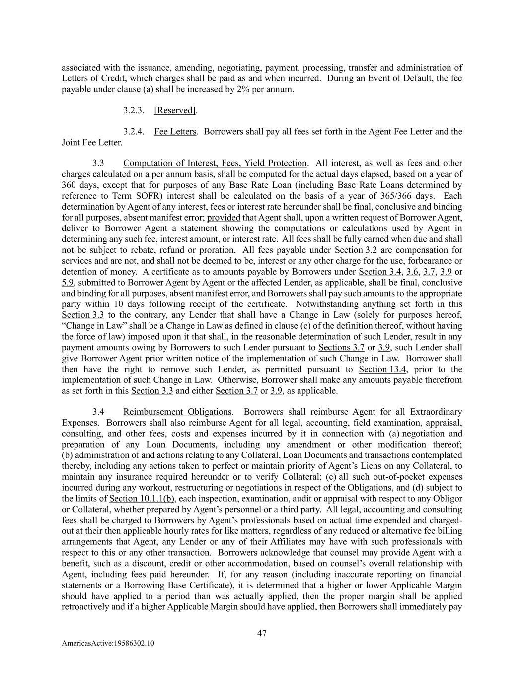 47 AmericasActive:19586302.10 associated with the issuance, amending, negotiating, payment, processing, transfer and administration of Letters of Credit, which charges shall be paid as and when incurred. During an Event of Default, the fee payable under clause (a) shall be increased by 2% per annum. 3.2.3. [Reserved]. 3.2.4. Fee Letters. Borrowers shall pay all fees set forth in the Agent Fee Letter and the Joint Fee Letter. 3.3 Computation of Interest, Fees, Yield Protection. All interest, as well as fees and other charges calculated on a per annum basis, shall be computed for the actual days elapsed, based on a year of 360 days, except that for purposes of any Base Rate Loan (including Base Rate Loans determined by reference to Term SOFR) interest shall be calculated on the basis of a year of 365/366 days. Each determination by Agent of any interest, fees or interest rate hereunder shall be final, conclusive and binding for all purposes, absent manifest error; provided that Agent shall, upon a written request of Borrower Agent, deliver to Borrower Agent a statement showing the computations or calculations used by Agent in determining any such fee, interest amount, or interest rate. All fees shall be fully earned when due and shall not be subject to rebate, refund or proration. All fees payable under Section 3.2 are compensation for services and are not, and shall not be deemed to be, interest or any other charge for the use, forbearance or detention of money. A certificate as to amounts payable by Borrowers under Section 3.4, 3.6, 3.7, 3.9 or 5.9, submitted to Borrower Agent by Agent or the affected Lender, as applicable, shall be final, conclusive and binding for all purposes, absent manifest error, and Borrowers shall pay such amounts to the appropriate party within 10 days following receipt of the certificate. Notwithstanding anything set forth in this Section 3.3 to the contrary, any Lender that shall have a Change in Law (solely for purposes hereof, “Change in Law” shall be a Change in Law as defined in clause (c) of the definition thereof, without having the force of law) imposed upon it that shall, in the reasonable determination of such Lender, result in any payment amounts owing by Borrowers to such Lender pursuant to Sections 3.7 or 3.9, such Lender shall give Borrower Agent prior written notice of the implementation of such Change in Law. Borrower shall then have the right to remove such Lender, as permitted pursuant to Section 13.4, prior to the implementation of such Change in Law. Otherwise, Borrower shall make any amounts payable therefrom as set forth in this Section 3.3 and either Section 3.7 or 3.9, as applicable. 3.4 Reimbursement Obligations. Borrowers shall reimburse Agent for all Extraordinary Expenses. Borrowers shall also reimburse Agent for all legal, accounting, field examination, appraisal, consulting, and other fees, costs and expenses incurred by it in connection with (a) negotiation and preparation of any Loan Documents, including any amendment or other modification thereof; (b) administration of and actions relating to any Collateral, Loan Documents and transactions contemplated thereby, including any actions taken to perfect or maintain priority of Agent’s Liens on any Collateral, to maintain any insurance required hereunder or to verify Collateral; (c) all such out-of-pocket expenses incurred during any workout, restructuring or negotiations in respect of the Obligations, and (d) subject to the limits of Section 10.1.1(b), each inspection, examination, audit or appraisal with respect to any Obligor or Collateral, whether prepared by Agent’s personnel or a third party. All legal, accounting and consulting fees shall be charged to Borrowers by Agent’s professionals based on actual time expended and charged- out at their then applicable hourly rates for like matters, regardless of any reduced or alternative fee billing arrangements that Agent, any Lender or any of their Affiliates may have with such professionals with respect to this or any other transaction. Borrowers acknowledge that counsel may provide Agent with a benefit, such as a discount, credit or other accommodation, based on counsel’s overall relationship with Agent, including fees paid hereunder. If, for any reason (including inaccurate reporting on financial statements or a Borrowing Base Certificate), it is determined that a higher or lower Applicable Margin should have applied to a period than was actually applied, then the proper margin shall be applied retroactively and if a higher Applicable Margin should have applied, then Borrowers shall immediately pay