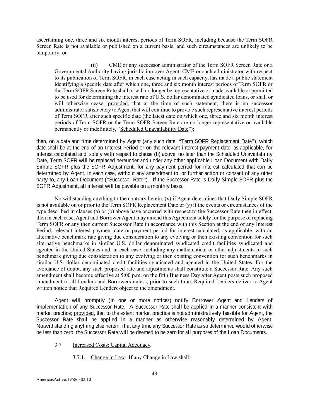 49 AmericasActive:19586302.10 ascertaining one, three and six month interest periods of Term SOFR, including because the Term SOFR Screen Rate is not available or published on a current basis, and such circumstances are unlikely to be temporary; or (ii) CME or any successor administrator of the Term SOFR Screen Rate or a Governmental Authority having jurisdiction over Agent, CME or such administrator with respect to its publication of Term SOFR, in each case acting in such capacity, has made a public statement identifying a specific date after which one, three and six month interest periods of Term SOFR or the Term SOFR Screen Rate shall or will no longer be representative or made available or permitted to be used for determining the interest rate of U.S. dollar denominated syndicated loans, or shall or will otherwise cease, provided, that at the time of such statement, there is no successor administrator satisfactory to Agent that will continue to provide such representative interest periods of Term SOFR after such specific date (the latest date on which one, three and six month interest periods of Term SOFR or the Term SOFR Screen Rate are no longer representative or available permanently or indefinitely, “Scheduled Unavailability Date”); then, on a date and time determined by Agent (any such date, “Term SOFR Replacement Date”), which date shall be at the end of an Interest Period or on the relevant interest payment date, as applicable, for interest calculated and, solely with respect to clause (b) above, no later than the Scheduled Unavailability Date, Term SOFR will be replaced hereunder and under any other applicable Loan Document with Daily Simple SOFR plus the SOFR Adjustment, for any payment period for interest calculated that can be determined by Agent, in each case, without any amendment to, or further action or consent of any other party to, any Loan Document (“Successor Rate”). If the Successor Rate is Daily Simple SOFR plus the SOFR Adjustment, all interest will be payable on a monthly basis. Notwithstanding anything to the contrary herein, (x) if Agent determines that Daily Simple SOFR is not available on or prior to the Term SOFR Replacement Date or (y) if the events or circumstances of the type described in clauses (a) or (b) above have occurred with respect to the Successor Rate then in effect, then in each case, Agent and Borrower Agent may amend this Agreement solely for the purpose of replacing Term SOFR or any then current Successor Rate in accordance with this Section at the end of any Interest Period, relevant interest payment date or payment period for interest calculated, as applicable, with an alternative benchmark rate giving due consideration to any evolving or then existing convention for such alternative benchmarks in similar U.S. dollar denominated syndicated credit facilities syndicated and agented in the United States and, in each case, including any mathematical or other adjustments to such benchmark giving due consideration to any evolving or then existing convention for such benchmarks in similar U.S. dollar denominated credit facilities syndicated and agented in the United States. For the avoidance of doubt, any such proposed rate and adjustments shall constitute a Successor Rate. Any such amendment shall become effective at 5:00 p.m. on the fifth Business Day after Agent posts such proposed amendment to all Lenders and Borrowers unless, prior to such time, Required Lenders deliver to Agent written notice that Required Lenders object to the amendment. Agent will promptly (in one or more notices) notify Borrower Agent and Lenders of implementation of any Successor Rate. A Successor Rate shall be applied in a manner consistent with market practice; provided, that to the extent market practice is not administratively feasible for Agent, the Successor Rate shall be applied in a manner as otherwise reasonably determined by Agent. Notwithstanding anything else herein, if at any time any Successor Rate as so determined would otherwise be less than zero, the Successor Rate will be deemed to be zero for all purposes of the Loan Documents. 3.7 Increased Costs; Capital Adequacy. 3.7.1. Change in Law. If any Change in Law shall: