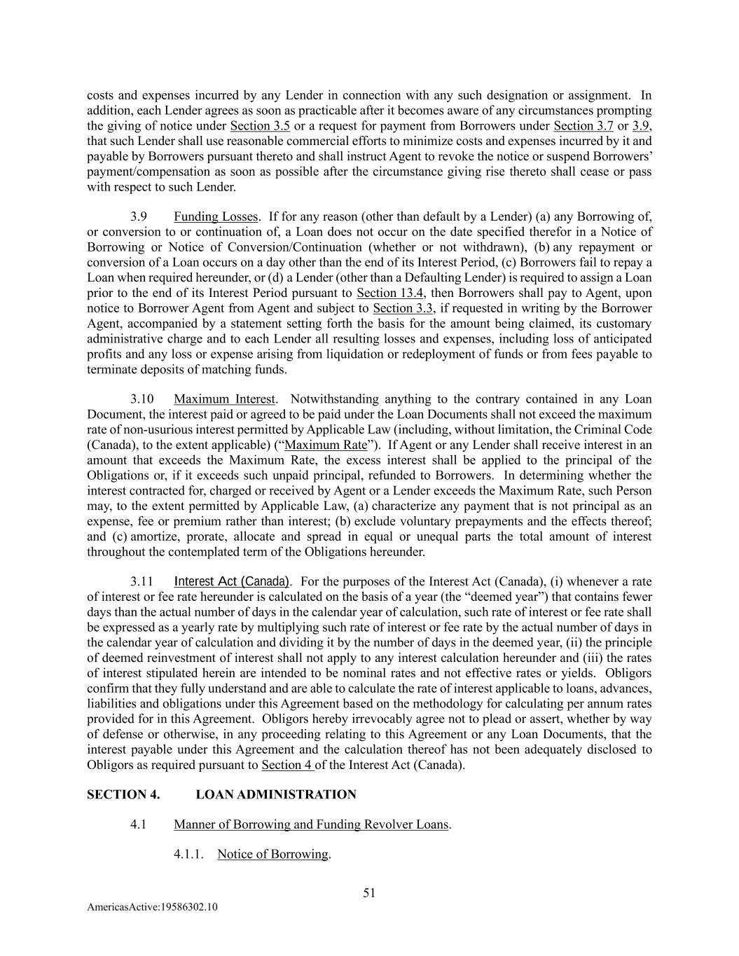 51 AmericasActive:19586302.10 costs and expenses incurred by any Lender in connection with any such designation or assignment. In addition, each Lender agrees as soon as practicable after it becomes aware of any circumstances prompting the giving of notice under Section 3.5 or a request for payment from Borrowers under Section 3.7 or 3.9, that such Lender shall use reasonable commercial efforts to minimize costs and expenses incurred by it and payable by Borrowers pursuant thereto and shall instruct Agent to revoke the notice or suspend Borrowers’ payment/compensation as soon as possible after the circumstance giving rise thereto shall cease or pass with respect to such Lender. 3.9 Funding Losses. If for any reason (other than default by a Lender) (a) any Borrowing of, or conversion to or continuation of, a Loan does not occur on the date specified therefor in a Notice of Borrowing or Notice of Conversion/Continuation (whether or not withdrawn), (b) any repayment or conversion of a Loan occurs on a day other than the end of its Interest Period, (c) Borrowers fail to repay a Loan when required hereunder, or (d) a Lender (other than a Defaulting Lender) is required to assign a Loan prior to the end of its Interest Period pursuant to Section 13.4, then Borrowers shall pay to Agent, upon notice to Borrower Agent from Agent and subject to Section 3.3, if requested in writing by the Borrower Agent, accompanied by a statement setting forth the basis for the amount being claimed, its customary administrative charge and to each Lender all resulting losses and expenses, including loss of anticipated profits and any loss or expense arising from liquidation or redeployment of funds or from fees payable to terminate deposits of matching funds. 3.10 Maximum Interest. Notwithstanding anything to the contrary contained in any Loan Document, the interest paid or agreed to be paid under the Loan Documents shall not exceed the maximum rate of non-usurious interest permitted by Applicable Law (including, without limitation, the Criminal Code (Canada), to the extent applicable) (“Maximum Rate”). If Agent or any Lender shall receive interest in an amount that exceeds the Maximum Rate, the excess interest shall be applied to the principal of the Obligations or, if it exceeds such unpaid principal, refunded to Borrowers. In determining whether the interest contracted for, charged or received by Agent or a Lender exceeds the Maximum Rate, such Person may, to the extent permitted by Applicable Law, (a) characterize any payment that is not principal as an expense, fee or premium rather than interest; (b) exclude voluntary prepayments and the effects thereof; and (c) amortize, prorate, allocate and spread in equal or unequal parts the total amount of interest throughout the contemplated term of the Obligations hereunder. 3.11 Interest Act (Canada). For the purposes of the Interest Act (Canada), (i) whenever a rate of interest or fee rate hereunder is calculated on the basis of a year (the “deemed year”) that contains fewer days than the actual number of days in the calendar year of calculation, such rate of interest or fee rate shall be expressed as a yearly rate by multiplying such rate of interest or fee rate by the actual number of days in the calendar year of calculation and dividing it by the number of days in the deemed year, (ii) the principle of deemed reinvestment of interest shall not apply to any interest calculation hereunder and (iii) the rates of interest stipulated herein are intended to be nominal rates and not effective rates or yields. Obligors confirm that they fully understand and are able to calculate the rate of interest applicable to loans, advances, liabilities and obligations under this Agreement based on the methodology for calculating per annum rates provided for in this Agreement. Obligors hereby irrevocably agree not to plead or assert, whether by way of defense or otherwise, in any proceeding relating to this Agreement or any Loan Documents, that the interest payable under this Agreement and the calculation thereof has not been adequately disclosed to Obligors as required pursuant to Section 4 of the Interest Act (Canada). SECTION 4. LOAN ADMINISTRATION 4.1 Manner of Borrowing and Funding Revolver Loans. 4.1.1. Notice of Borrowing.