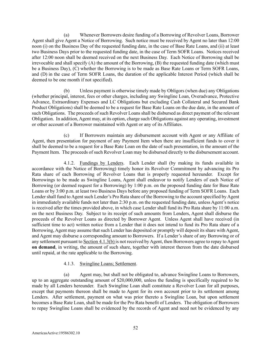 52 AmericasActive:19586302.10 (a) Whenever Borrowers desire funding of a Borrowing of Revolver Loans, Borrower Agent shall give Agent a Notice of Borrowing. Such notice must be received by Agent no later than 12:00 noon (i) on the Business Day of the requested funding date, in the case of Base Rate Loans, and (ii) at least two Business Days prior to the requested funding date, in the case of Term SOFR Loans. Notices received after 12:00 noon shall be deemed received on the next Business Day. Each Notice of Borrowing shall be irrevocable and shall specify (A) the amount of the Borrowing, (B) the requested funding date (which must be a Business Day), (C) whether the Borrowing is to be made as Base Rate Loans or Term SOFR Loans, and (D) in the case of Term SOFR Loans, the duration of the applicable Interest Period (which shall be deemed to be one month if not specified). (b) Unless payment is otherwise timely made by Obligors (when due) any Obligations (whether principal, interest, fees or other charges, including any Swingline Loan, Overadvance, Protective Advance, Extraordinary Expenses and LC Obligations but excluding Cash Collateral and Secured Bank Product Obligations) shall be deemed to be a request for Base Rate Loans on the due date, in the amount of such Obligations. The proceeds of such Revolver Loans shall be disbursed as direct payment of the relevant Obligation. In addition, Agent may, at its option, charge such Obligations against any operating, investment or other account of a Borrower maintained with Agent or any of its Affiliates. (c) If Borrowers maintain any disbursement account with Agent or any Affiliate of Agent, then presentation for payment of any Payment Item when there are insufficient funds to cover it shall be deemed to be a request for a Base Rate Loan on the date of such presentation, in the amount of the Payment Item. The proceeds of such Revolver Loan may be disbursed directly to the disbursement account. 4.1.2. Fundings by Lenders. Each Lender shall (by making its funds available in accordance with the Notice of Borrowing) timely honor its Revolver Commitment by advancing its Pro Rata share of each Borrowing of Revolver Loans that is properly requested hereunder. Except for Borrowings to be made as Swingline Loans, Agent shall endeavor to notify Lenders of each Notice of Borrowing (or deemed request for a Borrowing) by 1:00 p.m. on the proposed funding date for Base Rate Loans or by 3:00 p.m. at least two Business Days before any proposed funding of Term SOFR Loans. Each Lender shall fund to Agent such Lender’s Pro Rata share of the Borrowing to the account specified by Agent in immediately available funds not later than 2:30 p.m. on the requested funding date, unless Agent’s notice is received after the times provided above, in which case Lender shall fund its Pro Rata share by 11:00 a.m. on the next Business Day. Subject to its receipt of such amounts from Lenders, Agent shall disburse the proceeds of the Revolver Loans as directed by Borrower Agent. Unless Agent shall have received (in sufficient time to act) written notice from a Lender that it does not intend to fund its Pro Rata share of a Borrowing, Agent may assume that such Lender has deposited or promptly will deposit its share with Agent, and Agent may disburse a corresponding amount to Borrowers. If a Lender’s share of any Borrowing or of any settlement pursuant to Section 4.1.3(b) is not received by Agent, then Borrowers agree to repay to Agent on demand, in writing, the amount of such share, together with interest thereon from the date disbursed until repaid, at the rate applicable to the Borrowing. 4.1.3. Swingline Loans; Settlement. (a) Agent may, but shall not be obligated to, advance Swingline Loans to Borrowers, up to an aggregate outstanding amount of $20,000,000, unless the funding is specifically required to be made by all Lenders hereunder. Each Swingline Loan shall constitute a Revolver Loan for all purposes, except that payments thereon shall be made to Agent for its own account prior to its settlement among Lenders. After settlement, payment on what was prior thereto a Swingline Loan, but upon settlement becomes a Base Rate Loan, shall be made for the Pro Rata benefit of Lenders. The obligation of Borrowers to repay Swingline Loans shall be evidenced by the records of Agent and need not be evidenced by any