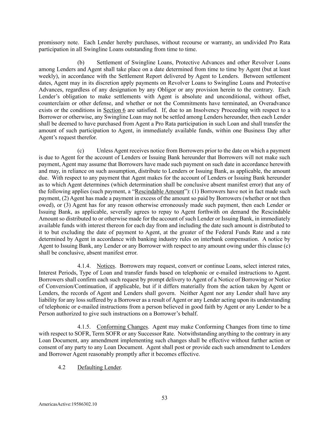 53 AmericasActive:19586302.10 promissory note. Each Lender hereby purchases, without recourse or warranty, an undivided Pro Rata participation in all Swingline Loans outstanding from time to time. (b) Settlement of Swingline Loans, Protective Advances and other Revolver Loans among Lenders and Agent shall take place on a date determined from time to time by Agent (but at least weekly), in accordance with the Settlement Report delivered by Agent to Lenders. Between settlement dates, Agent may in its discretion apply payments on Revolver Loans to Swingline Loans and Protective Advances, regardless of any designation by any Obligor or any provision herein to the contrary. Each Lender’s obligation to make settlements with Agent is absolute and unconditional, without offset, counterclaim or other defense, and whether or not the Commitments have terminated, an Overadvance exists or the conditions in Section 6 are satisfied. If, due to an Insolvency Proceeding with respect to a Borrower or otherwise, any Swingline Loan may not be settled among Lenders hereunder, then each Lender shall be deemed to have purchased from Agent a Pro Rata participation in such Loan and shall transfer the amount of such participation to Agent, in immediately available funds, within one Business Day after Agent’s request therefor. (c) Unless Agent receives notice from Borrowers prior to the date on which a payment is due to Agent for the account of Lenders or Issuing Bank hereunder that Borrowers will not make such payment, Agent may assume that Borrowers have made such payment on such date in accordance herewith and may, in reliance on such assumption, distribute to Lenders or Issuing Bank, as applicable, the amount due. With respect to any payment that Agent makes for the account of Lenders or Issuing Bank hereunder as to which Agent determines (which determination shall be conclusive absent manifest error) that any of the following applies (such payment, a “Rescindable Amount”): (1) Borrowers have not in fact made such payment, (2) Agent has made a payment in excess of the amount so paid by Borrowers (whether or not then owed), or (3) Agent has for any reason otherwise erroneously made such payment, then each Lender or Issuing Bank, as applicable, severally agrees to repay to Agent forthwith on demand the Rescindable Amount so distributed to or otherwise made for the account of such Lender or Issuing Bank, in immediately available funds with interest thereon for each day from and including the date such amount is distributed to it to but excluding the date of payment to Agent, at the greater of the Federal Funds Rate and a rate determined by Agent in accordance with banking industry rules on interbank compensation. A notice by Agent to Issuing Bank, any Lender or any Borrower with respect to any amount owing under this clause (c) shall be conclusive, absent manifest error. 4.1.4. Notices. Borrowers may request, convert or continue Loans, select interest rates, Interest Periods, Type of Loan and transfer funds based on telephonic or e-mailed instructions to Agent. Borrowers shall confirm each such request by prompt delivery to Agent of a Notice of Borrowing or Notice of Conversion/Continuation, if applicable, but if it differs materially from the action taken by Agent or Lenders, the records of Agent and Lenders shall govern. Neither Agent nor any Lender shall have any liability for any loss suffered by a Borrower as a result of Agent or any Lender acting upon its understanding of telephonic or e-mailed instructions from a person believed in good faith by Agent or any Lender to be a Person authorized to give such instructions on a Borrower’s behalf. 4.1.5. Conforming Changes. Agent may make Conforming Changes from time to time with respect to SOFR, Term SOFR or any Successor Rate. Notwithstanding anything to the contrary in any Loan Document, any amendment implementing such changes shall be effective without further action or consent of any party to any Loan Document. Agent shall post or provide each such amendment to Lenders and Borrower Agent reasonably promptly after it becomes effective. 4.2 Defaulting Lender.