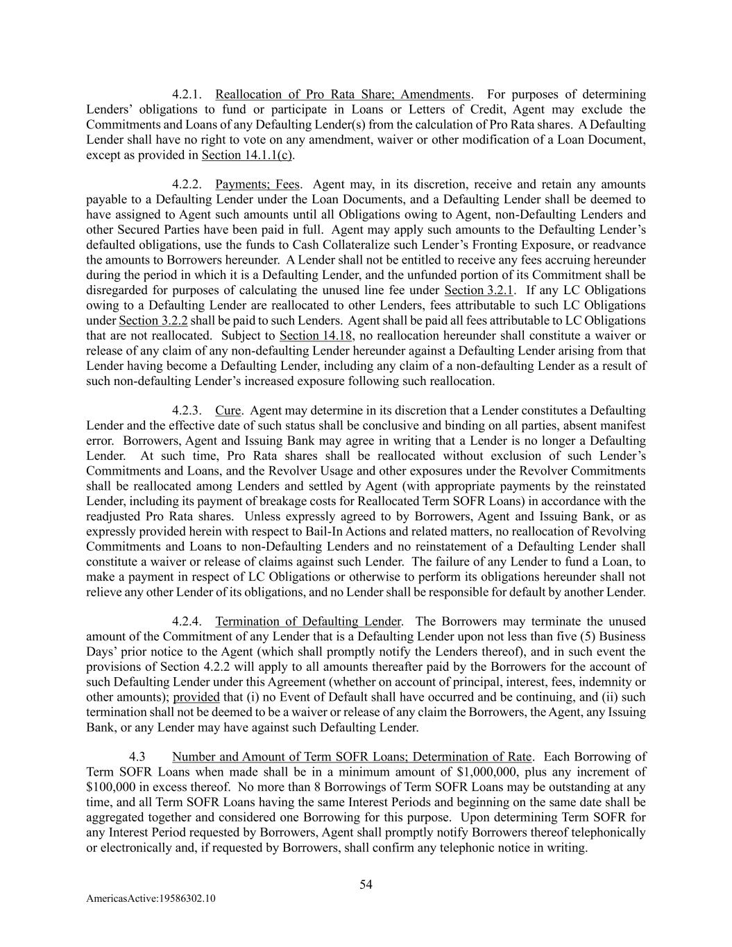 54 AmericasActive:19586302.10 4.2.1. Reallocation of Pro Rata Share; Amendments. For purposes of determining Lenders’ obligations to fund or participate in Loans or Letters of Credit, Agent may exclude the Commitments and Loans of any Defaulting Lender(s) from the calculation of Pro Rata shares. A Defaulting Lender shall have no right to vote on any amendment, waiver or other modification of a Loan Document, except as provided in Section 14.1.1(c). 4.2.2. Payments; Fees. Agent may, in its discretion, receive and retain any amounts payable to a Defaulting Lender under the Loan Documents, and a Defaulting Lender shall be deemed to have assigned to Agent such amounts until all Obligations owing to Agent, non-Defaulting Lenders and other Secured Parties have been paid in full. Agent may apply such amounts to the Defaulting Lender’s defaulted obligations, use the funds to Cash Collateralize such Lender’s Fronting Exposure, or readvance the amounts to Borrowers hereunder. A Lender shall not be entitled to receive any fees accruing hereunder during the period in which it is a Defaulting Lender, and the unfunded portion of its Commitment shall be disregarded for purposes of calculating the unused line fee under Section 3.2.1. If any LC Obligations owing to a Defaulting Lender are reallocated to other Lenders, fees attributable to such LC Obligations under Section 3.2.2 shall be paid to such Lenders. Agent shall be paid all fees attributable to LC Obligations that are not reallocated. Subject to Section 14.18, no reallocation hereunder shall constitute a waiver or release of any claim of any non-defaulting Lender hereunder against a Defaulting Lender arising from that Lender having become a Defaulting Lender, including any claim of a non-defaulting Lender as a result of such non-defaulting Lender’s increased exposure following such reallocation. 4.2.3. Cure. Agent may determine in its discretion that a Lender constitutes a Defaulting Lender and the effective date of such status shall be conclusive and binding on all parties, absent manifest error. Borrowers, Agent and Issuing Bank may agree in writing that a Lender is no longer a Defaulting Lender. At such time, Pro Rata shares shall be reallocated without exclusion of such Lender’s Commitments and Loans, and the Revolver Usage and other exposures under the Revolver Commitments shall be reallocated among Lenders and settled by Agent (with appropriate payments by the reinstated Lender, including its payment of breakage costs for Reallocated Term SOFR Loans) in accordance with the readjusted Pro Rata shares. Unless expressly agreed to by Borrowers, Agent and Issuing Bank, or as expressly provided herein with respect to Bail-In Actions and related matters, no reallocation of Revolving Commitments and Loans to non-Defaulting Lenders and no reinstatement of a Defaulting Lender shall constitute a waiver or release of claims against such Lender. The failure of any Lender to fund a Loan, to make a payment in respect of LC Obligations or otherwise to perform its obligations hereunder shall not relieve any other Lender of its obligations, and no Lender shall be responsible for default by another Lender. 4.2.4. Termination of Defaulting Lender. The Borrowers may terminate the unused amount of the Commitment of any Lender that is a Defaulting Lender upon not less than five (5) Business Days’ prior notice to the Agent (which shall promptly notify the Lenders thereof), and in such event the provisions of Section 4.2.2 will apply to all amounts thereafter paid by the Borrowers for the account of such Defaulting Lender under this Agreement (whether on account of principal, interest, fees, indemnity or other amounts); provided that (i) no Event of Default shall have occurred and be continuing, and (ii) such termination shall not be deemed to be a waiver or release of any claim the Borrowers, the Agent, any Issuing Bank, or any Lender may have against such Defaulting Lender. 4.3 Number and Amount of Term SOFR Loans; Determination of Rate. Each Borrowing of Term SOFR Loans when made shall be in a minimum amount of $1,000,000, plus any increment of $100,000 in excess thereof. No more than 8 Borrowings of Term SOFR Loans may be outstanding at any time, and all Term SOFR Loans having the same Interest Periods and beginning on the same date shall be aggregated together and considered one Borrowing for this purpose. Upon determining Term SOFR for any Interest Period requested by Borrowers, Agent shall promptly notify Borrowers thereof telephonically or electronically and, if requested by Borrowers, shall confirm any telephonic notice in writing.