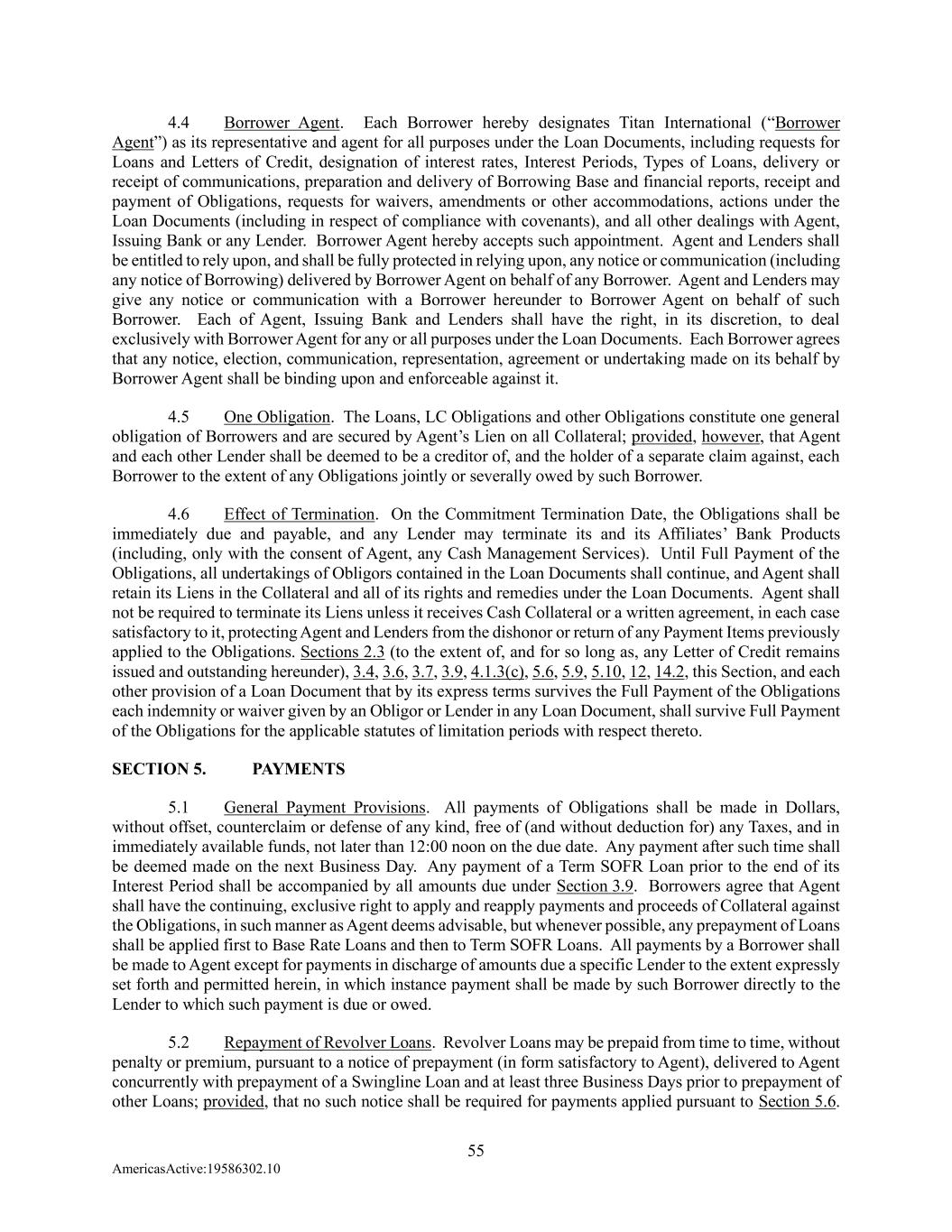 55 AmericasActive:19586302.10 4.4 Borrower Agent. Each Borrower hereby designates Titan International (“Borrower Agent”) as its representative and agent for all purposes under the Loan Documents, including requests for Loans and Letters of Credit, designation of interest rates, Interest Periods, Types of Loans, delivery or receipt of communications, preparation and delivery of Borrowing Base and financial reports, receipt and payment of Obligations, requests for waivers, amendments or other accommodations, actions under the Loan Documents (including in respect of compliance with covenants), and all other dealings with Agent, Issuing Bank or any Lender. Borrower Agent hereby accepts such appointment. Agent and Lenders shall be entitled to rely upon, and shall be fully protected in relying upon, any notice or communication (including any notice of Borrowing) delivered by Borrower Agent on behalf of any Borrower. Agent and Lenders may give any notice or communication with a Borrower hereunder to Borrower Agent on behalf of such Borrower. Each of Agent, Issuing Bank and Lenders shall have the right, in its discretion, to deal exclusively with Borrower Agent for any or all purposes under the Loan Documents. Each Borrower agrees that any notice, election, communication, representation, agreement or undertaking made on its behalf by Borrower Agent shall be binding upon and enforceable against it. 4.5 One Obligation. The Loans, LC Obligations and other Obligations constitute one general obligation of Borrowers and are secured by Agent’s Lien on all Collateral; provided, however, that Agent and each other Lender shall be deemed to be a creditor of, and the holder of a separate claim against, each Borrower to the extent of any Obligations jointly or severally owed by such Borrower. 4.6 Effect of Termination. On the Commitment Termination Date, the Obligations shall be immediately due and payable, and any Lender may terminate its and its Affiliates’ Bank Products (including, only with the consent of Agent, any Cash Management Services). Until Full Payment of the Obligations, all undertakings of Obligors contained in the Loan Documents shall continue, and Agent shall retain its Liens in the Collateral and all of its rights and remedies under the Loan Documents. Agent shall not be required to terminate its Liens unless it receives Cash Collateral or a written agreement, in each case satisfactory to it, protecting Agent and Lenders from the dishonor or return of any Payment Items previously applied to the Obligations. Sections 2.3 (to the extent of, and for so long as, any Letter of Credit remains issued and outstanding hereunder), 3.4, 3.6, 3.7, 3.9, 4.1.3(c), 5.6, 5.9, 5.10, 12, 14.2, this Section, and each other provision of a Loan Document that by its express terms survives the Full Payment of the Obligations each indemnity or waiver given by an Obligor or Lender in any Loan Document, shall survive Full Payment of the Obligations for the applicable statutes of limitation periods with respect thereto. SECTION 5. PAYMENTS 5.1 General Payment Provisions. All payments of Obligations shall be made in Dollars, without offset, counterclaim or defense of any kind, free of (and without deduction for) any Taxes, and in immediately available funds, not later than 12:00 noon on the due date. Any payment after such time shall be deemed made on the next Business Day. Any payment of a Term SOFR Loan prior to the end of its Interest Period shall be accompanied by all amounts due under Section 3.9. Borrowers agree that Agent shall have the continuing, exclusive right to apply and reapply payments and proceeds of Collateral against the Obligations, in such manner as Agent deems advisable, but whenever possible, any prepayment of Loans shall be applied first to Base Rate Loans and then to Term SOFR Loans. All payments by a Borrower shall be made to Agent except for payments in discharge of amounts due a specific Lender to the extent expressly set forth and permitted herein, in which instance payment shall be made by such Borrower directly to the Lender to which such payment is due or owed. 5.2 Repayment of Revolver Loans. Revolver Loans may be prepaid from time to time, without penalty or premium, pursuant to a notice of prepayment (in form satisfactory to Agent), delivered to Agent concurrently with prepayment of a Swingline Loan and at least three Business Days prior to prepayment of other Loans; provided, that no such notice shall be required for payments applied pursuant to Section 5.6.