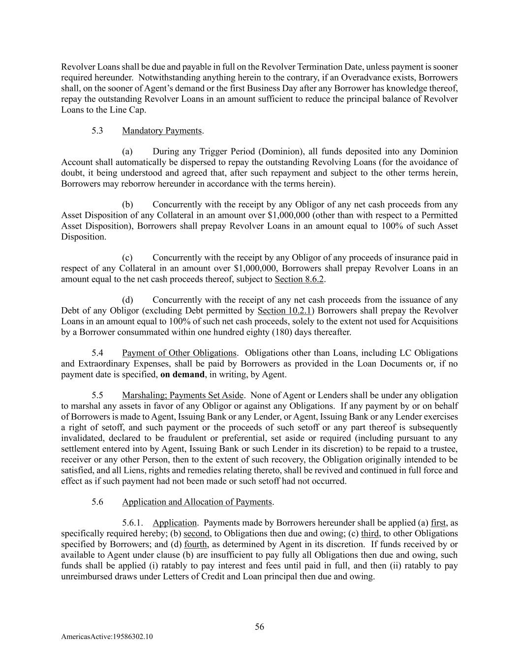 56 AmericasActive:19586302.10 Revolver Loans shall be due and payable in full on the Revolver Termination Date, unless payment is sooner required hereunder. Notwithstanding anything herein to the contrary, if an Overadvance exists, Borrowers shall, on the sooner of Agent’s demand or the first Business Day after any Borrower has knowledge thereof, repay the outstanding Revolver Loans in an amount sufficient to reduce the principal balance of Revolver Loans to the Line Cap. 5.3 Mandatory Payments. (a) During any Trigger Period (Dominion), all funds deposited into any Dominion Account shall automatically be dispersed to repay the outstanding Revolving Loans (for the avoidance of doubt, it being understood and agreed that, after such repayment and subject to the other terms herein, Borrowers may reborrow hereunder in accordance with the terms herein). (b) Concurrently with the receipt by any Obligor of any net cash proceeds from any Asset Disposition of any Collateral in an amount over $1,000,000 (other than with respect to a Permitted Asset Disposition), Borrowers shall prepay Revolver Loans in an amount equal to 100% of such Asset Disposition. (c) Concurrently with the receipt by any Obligor of any proceeds of insurance paid in respect of any Collateral in an amount over $1,000,000, Borrowers shall prepay Revolver Loans in an amount equal to the net cash proceeds thereof, subject to Section 8.6.2. (d) Concurrently with the receipt of any net cash proceeds from the issuance of any Debt of any Obligor (excluding Debt permitted by Section 10.2.1) Borrowers shall prepay the Revolver Loans in an amount equal to 100% of such net cash proceeds, solely to the extent not used for Acquisitions by a Borrower consummated within one hundred eighty (180) days thereafter. 5.4 Payment of Other Obligations. Obligations other than Loans, including LC Obligations and Extraordinary Expenses, shall be paid by Borrowers as provided in the Loan Documents or, if no payment date is specified, on demand, in writing, by Agent. 5.5 Marshaling; Payments Set Aside. None of Agent or Lenders shall be under any obligation to marshal any assets in favor of any Obligor or against any Obligations. If any payment by or on behalf of Borrowers is made to Agent, Issuing Bank or any Lender, or Agent, Issuing Bank or any Lender exercises a right of setoff, and such payment or the proceeds of such setoff or any part thereof is subsequently invalidated, declared to be fraudulent or preferential, set aside or required (including pursuant to any settlement entered into by Agent, Issuing Bank or such Lender in its discretion) to be repaid to a trustee, receiver or any other Person, then to the extent of such recovery, the Obligation originally intended to be satisfied, and all Liens, rights and remedies relating thereto, shall be revived and continued in full force and effect as if such payment had not been made or such setoff had not occurred. 5.6 Application and Allocation of Payments. 5.6.1. Application. Payments made by Borrowers hereunder shall be applied (a) first, as specifically required hereby; (b) second, to Obligations then due and owing; (c) third, to other Obligations specified by Borrowers; and (d) fourth, as determined by Agent in its discretion. If funds received by or available to Agent under clause (b) are insufficient to pay fully all Obligations then due and owing, such funds shall be applied (i) ratably to pay interest and fees until paid in full, and then (ii) ratably to pay unreimbursed draws under Letters of Credit and Loan principal then due and owing.