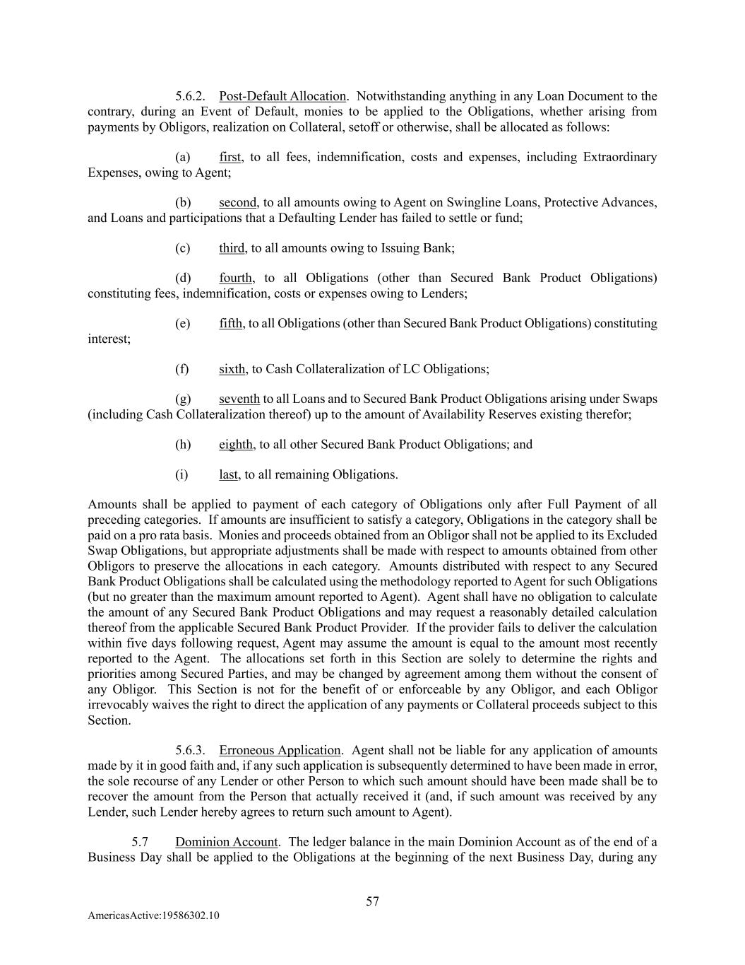 57 AmericasActive:19586302.10 5.6.2. Post-Default Allocation. Notwithstanding anything in any Loan Document to the contrary, during an Event of Default, monies to be applied to the Obligations, whether arising from payments by Obligors, realization on Collateral, setoff or otherwise, shall be allocated as follows: (a) first, to all fees, indemnification, costs and expenses, including Extraordinary Expenses, owing to Agent; (b) second, to all amounts owing to Agent on Swingline Loans, Protective Advances, and Loans and participations that a Defaulting Lender has failed to settle or fund; (c) third, to all amounts owing to Issuing Bank; (d) fourth, to all Obligations (other than Secured Bank Product Obligations) constituting fees, indemnification, costs or expenses owing to Lenders; (e) fifth, to all Obligations (other than Secured Bank Product Obligations) constituting interest; (f) sixth, to Cash Collateralization of LC Obligations; (g) seventh to all Loans and to Secured Bank Product Obligations arising under Swaps (including Cash Collateralization thereof) up to the amount of Availability Reserves existing therefor; (h) eighth, to all other Secured Bank Product Obligations; and (i) last, to all remaining Obligations. Amounts shall be applied to payment of each category of Obligations only after Full Payment of all preceding categories. If amounts are insufficient to satisfy a category, Obligations in the category shall be paid on a pro rata basis. Monies and proceeds obtained from an Obligor shall not be applied to its Excluded Swap Obligations, but appropriate adjustments shall be made with respect to amounts obtained from other Obligors to preserve the allocations in each category. Amounts distributed with respect to any Secured Bank Product Obligations shall be calculated using the methodology reported to Agent for such Obligations (but no greater than the maximum amount reported to Agent). Agent shall have no obligation to calculate the amount of any Secured Bank Product Obligations and may request a reasonably detailed calculation thereof from the applicable Secured Bank Product Provider. If the provider fails to deliver the calculation within five days following request, Agent may assume the amount is equal to the amount most recently reported to the Agent. The allocations set forth in this Section are solely to determine the rights and priorities among Secured Parties, and may be changed by agreement among them without the consent of any Obligor. This Section is not for the benefit of or enforceable by any Obligor, and each Obligor irrevocably waives the right to direct the application of any payments or Collateral proceeds subject to this Section. 5.6.3. Erroneous Application. Agent shall not be liable for any application of amounts made by it in good faith and, if any such application is subsequently determined to have been made in error, the sole recourse of any Lender or other Person to which such amount should have been made shall be to recover the amount from the Person that actually received it (and, if such amount was received by any Lender, such Lender hereby agrees to return such amount to Agent). 5.7 Dominion Account. The ledger balance in the main Dominion Account as of the end of a Business Day shall be applied to the Obligations at the beginning of the next Business Day, during any