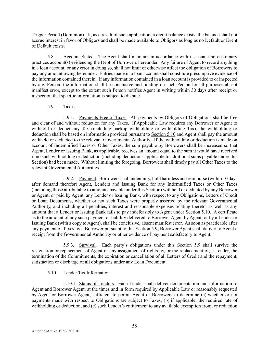 58 AmericasActive:19586302.10 Trigger Period (Dominion). If, as a result of such application, a credit balance exists, the balance shall not accrue interest in favor of Obligors and shall be made available to Obligors as long as no Default or Event of Default exists. 5.8 Account Stated. The Agent shall maintain in accordance with its usual and customary practices account(s) evidencing the Debt of Borrowers hereunder. Any failure of Agent to record anything in a loan account, or any error in doing so, shall not limit or otherwise affect the obligation of Borrowers to pay any amount owing hereunder. Entries made in a loan account shall constitute presumptive evidence of the information contained therein. If any information contained in a loan account is provided to or inspected by any Person, the information shall be conclusive and binding on such Person for all purposes absent manifest error, except to the extent such Person notifies Agent in writing within 30 days after receipt or inspection that specific information is subject to dispute. 5.9 Taxes. 5.9.1. Payments Free of Taxes. All payments by Obligors of Obligations shall be free and clear of and without reduction for any Taxes. If Applicable Law requires any Borrower or Agent to withhold or deduct any Tax (including backup withholding or withholding Tax), the withholding or deduction shall be based on information provided pursuant to Section 5.10 and Agent shall pay the amount withheld or deducted to the relevant Governmental Authority. If the withholding or deduction is made on account of Indemnified Taxes or Other Taxes, the sum payable by Borrowers shall be increased so that Agent, Lender or Issuing Bank, as applicable, receives an amount equal to the sum it would have received if no such withholding or deduction (including deductions applicable to additional sums payable under this Section) had been made. Without limiting the foregoing, Borrowers shall timely pay all Other Taxes to the relevant Governmental Authorities. 5.9.2. Payment. Borrowers shall indemnify, hold harmless and reimburse (within 10 days after demand therefor) Agent, Lenders and Issuing Bank for any Indemnified Taxes or Other Taxes (including those attributable to amounts payable under this Section) withheld or deducted by any Borrower or Agent, or paid by Agent, any Lender or Issuing Bank, with respect to any Obligations, Letters of Credit or Loan Documents, whether or not such Taxes were properly asserted by the relevant Governmental Authority, and including all penalties, interest and reasonable expenses relating thereto, as well as any amount that a Lender or Issuing Bank fails to pay indefeasibly to Agent under Section 5.10. A certificate as to the amount of any such payment or liability delivered to Borrower Agent by Agent, or by a Lender or Issuing Bank (with a copy to Agent), shall be conclusive, absent manifest error. As soon as practicable after any payment of Taxes by a Borrower pursuant to this Section 5.9, Borrower Agent shall deliver to Agent a receipt from the Governmental Authority or other evidence of payment satisfactory to Agent. 5.9.3. Survival. Each party’s obligations under this Section 5.9 shall survive the resignation or replacement of Agent or any assignment of rights by, or the replacement of, a Lender, the termination of the Commitments, the expiration or cancellation of all Letters of Credit and the repayment, satisfaction or discharge of all obligations under any Loan Document. 5.10 Lender Tax Information. 5.10.1. Status of Lenders. Each Lender shall deliver documentation and information to Agent and Borrower Agent, at the times and in form required by Applicable Law or reasonably requested by Agent or Borrower Agent, sufficient to permit Agent or Borrowers to determine (a) whether or not payments made with respect to Obligations are subject to Taxes, (b) if applicable, the required rate of withholding or deduction, and (c) such Lender’s entitlement to any available exemption from, or reduction