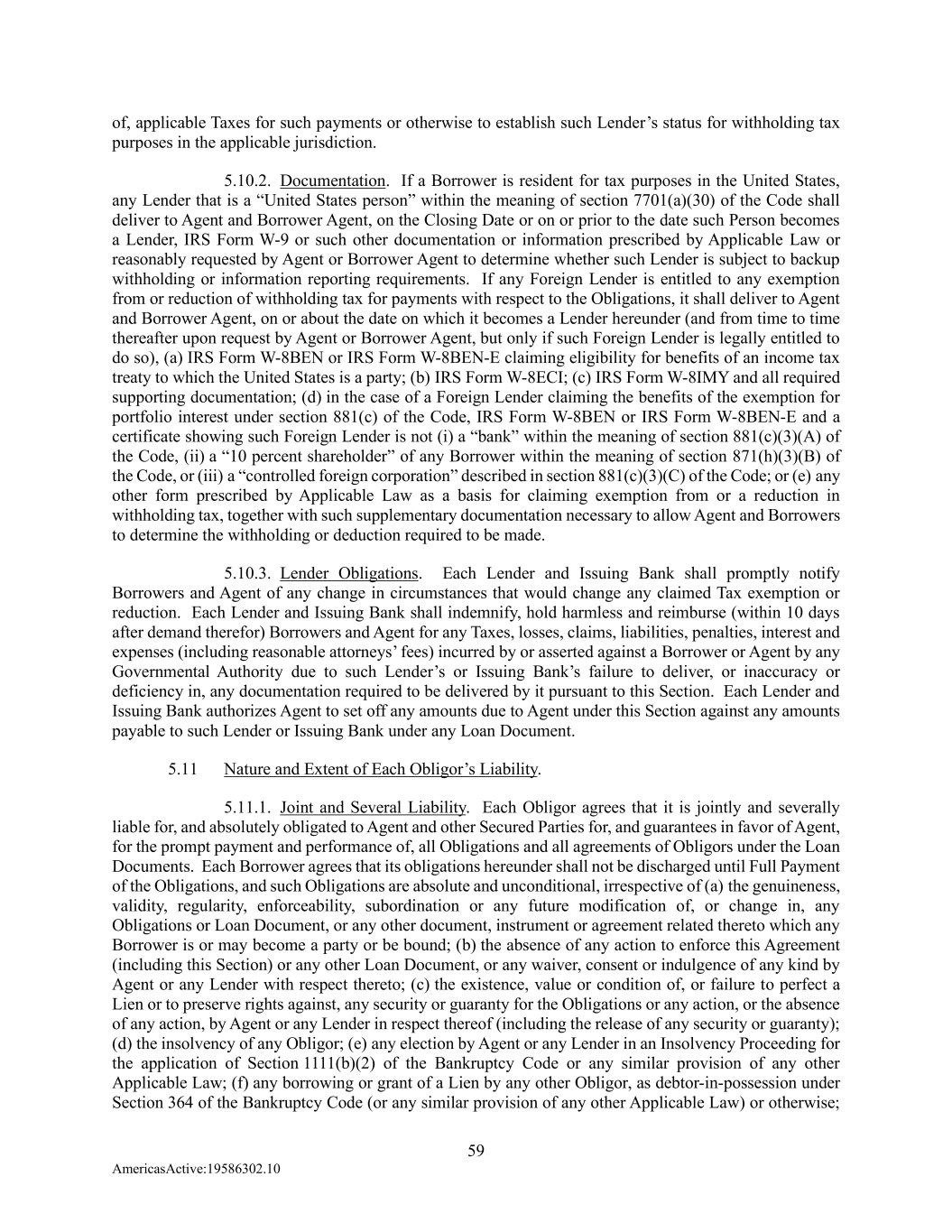 59 AmericasActive:19586302.10 of, applicable Taxes for such payments or otherwise to establish such Lender’s status for withholding tax purposes in the applicable jurisdiction. 5.10.2. Documentation. If a Borrower is resident for tax purposes in the United States, any Lender that is a “United States person” within the meaning of section 7701(a)(30) of the Code shall deliver to Agent and Borrower Agent, on the Closing Date or on or prior to the date such Person becomes a Lender, IRS Form W-9 or such other documentation or information prescribed by Applicable Law or reasonably requested by Agent or Borrower Agent to determine whether such Lender is subject to backup withholding or information reporting requirements. If any Foreign Lender is entitled to any exemption from or reduction of withholding tax for payments with respect to the Obligations, it shall deliver to Agent and Borrower Agent, on or about the date on which it becomes a Lender hereunder (and from time to time thereafter upon request by Agent or Borrower Agent, but only if such Foreign Lender is legally entitled to do so), (a) IRS Form W-8BEN or IRS Form W-8BEN-E claiming eligibility for benefits of an income tax treaty to which the United States is a party; (b) IRS Form W-8ECI; (c) IRS Form W-8IMY and all required supporting documentation; (d) in the case of a Foreign Lender claiming the benefits of the exemption for portfolio interest under section 881(c) of the Code, IRS Form W-8BEN or IRS Form W-8BEN-E and a certificate showing such Foreign Lender is not (i) a “bank” within the meaning of section 881(c)(3)(A) of the Code, (ii) a “10 percent shareholder” of any Borrower within the meaning of section 871(h)(3)(B) of the Code, or (iii) a “controlled foreign corporation” described in section 881(c)(3)(C) of the Code; or (e) any other form prescribed by Applicable Law as a basis for claiming exemption from or a reduction in withholding tax, together with such supplementary documentation necessary to allow Agent and Borrowers to determine the withholding or deduction required to be made. 5.10.3. Lender Obligations. Each Lender and Issuing Bank shall promptly notify Borrowers and Agent of any change in circumstances that would change any claimed Tax exemption or reduction. Each Lender and Issuing Bank shall indemnify, hold harmless and reimburse (within 10 days after demand therefor) Borrowers and Agent for any Taxes, losses, claims, liabilities, penalties, interest and expenses (including reasonable attorneys’ fees) incurred by or asserted against a Borrower or Agent by any Governmental Authority due to such Lender’s or Issuing Bank’s failure to deliver, or inaccuracy or deficiency in, any documentation required to be delivered by it pursuant to this Section. Each Lender and Issuing Bank authorizes Agent to set off any amounts due to Agent under this Section against any amounts payable to such Lender or Issuing Bank under any Loan Document. 5.11 Nature and Extent of Each Obligor’s Liability. 5.11.1. Joint and Several Liability. Each Obligor agrees that it is jointly and severally liable for, and absolutely obligated to Agent and other Secured Parties for, and guarantees in favor of Agent, for the prompt payment and performance of, all Obligations and all agreements of Obligors under the Loan Documents. Each Borrower agrees that its obligations hereunder shall not be discharged until Full Payment of the Obligations, and such Obligations are absolute and unconditional, irrespective of (a) the genuineness, validity, regularity, enforceability, subordination or any future modification of, or change in, any Obligations or Loan Document, or any other document, instrument or agreement related thereto which any Borrower is or may become a party or be bound; (b) the absence of any action to enforce this Agreement (including this Section) or any other Loan Document, or any waiver, consent or indulgence of any kind by Agent or any Lender with respect thereto; (c) the existence, value or condition of, or failure to perfect a Lien or to preserve rights against, any security or guaranty for the Obligations or any action, or the absence of any action, by Agent or any Lender in respect thereof (including the release of any security or guaranty); (d) the insolvency of any Obligor; (e) any election by Agent or any Lender in an Insolvency Proceeding for the application of Section 1111(b)(2) of the Bankruptcy Code or any similar provision of any other Applicable Law; (f) any borrowing or grant of a Lien by any other Obligor, as debtor-in-possession under Section 364 of the Bankruptcy Code (or any similar provision of any other Applicable Law) or otherwise;