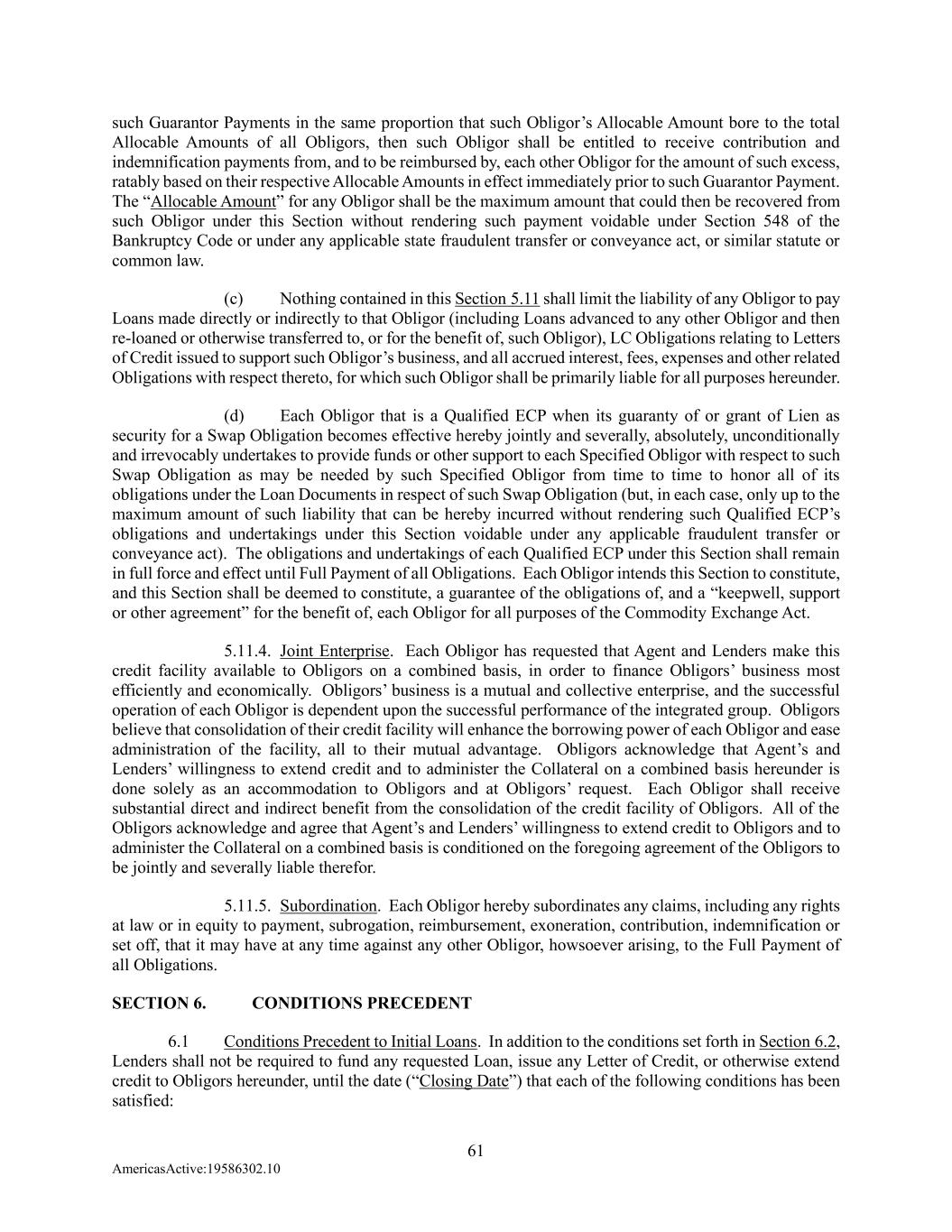 61 AmericasActive:19586302.10 such Guarantor Payments in the same proportion that such Obligor’s Allocable Amount bore to the total Allocable Amounts of all Obligors, then such Obligor shall be entitled to receive contribution and indemnification payments from, and to be reimbursed by, each other Obligor for the amount of such excess, ratably based on their respective Allocable Amounts in effect immediately prior to such Guarantor Payment. The “Allocable Amount” for any Obligor shall be the maximum amount that could then be recovered from such Obligor under this Section without rendering such payment voidable under Section 548 of the Bankruptcy Code or under any applicable state fraudulent transfer or conveyance act, or similar statute or common law. (c) Nothing contained in this Section 5.11 shall limit the liability of any Obligor to pay Loans made directly or indirectly to that Obligor (including Loans advanced to any other Obligor and then re-loaned or otherwise transferred to, or for the benefit of, such Obligor), LC Obligations relating to Letters of Credit issued to support such Obligor’s business, and all accrued interest, fees, expenses and other related Obligations with respect thereto, for which such Obligor shall be primarily liable for all purposes hereunder. (d) Each Obligor that is a Qualified ECP when its guaranty of or grant of Lien as security for a Swap Obligation becomes effective hereby jointly and severally, absolutely, unconditionally and irrevocably undertakes to provide funds or other support to each Specified Obligor with respect to such Swap Obligation as may be needed by such Specified Obligor from time to time to honor all of its obligations under the Loan Documents in respect of such Swap Obligation (but, in each case, only up to the maximum amount of such liability that can be hereby incurred without rendering such Qualified ECP’s obligations and undertakings under this Section voidable under any applicable fraudulent transfer or conveyance act). The obligations and undertakings of each Qualified ECP under this Section shall remain in full force and effect until Full Payment of all Obligations. Each Obligor intends this Section to constitute, and this Section shall be deemed to constitute, a guarantee of the obligations of, and a “keepwell, support or other agreement” for the benefit of, each Obligor for all purposes of the Commodity Exchange Act. 5.11.4. Joint Enterprise. Each Obligor has requested that Agent and Lenders make this credit facility available to Obligors on a combined basis, in order to finance Obligors’ business most efficiently and economically. Obligors’ business is a mutual and collective enterprise, and the successful operation of each Obligor is dependent upon the successful performance of the integrated group. Obligors believe that consolidation of their credit facility will enhance the borrowing power of each Obligor and ease administration of the facility, all to their mutual advantage. Obligors acknowledge that Agent’s and Lenders’ willingness to extend credit and to administer the Collateral on a combined basis hereunder is done solely as an accommodation to Obligors and at Obligors’ request. Each Obligor shall receive substantial direct and indirect benefit from the consolidation of the credit facility of Obligors. All of the Obligors acknowledge and agree that Agent’s and Lenders’ willingness to extend credit to Obligors and to administer the Collateral on a combined basis is conditioned on the foregoing agreement of the Obligors to be jointly and severally liable therefor. 5.11.5. Subordination. Each Obligor hereby subordinates any claims, including any rights at law or in equity to payment, subrogation, reimbursement, exoneration, contribution, indemnification or set off, that it may have at any time against any other Obligor, howsoever arising, to the Full Payment of all Obligations. SECTION 6. CONDITIONS PRECEDENT 6.1 Conditions Precedent to Initial Loans. In addition to the conditions set forth in Section 6.2, Lenders shall not be required to fund any requested Loan, issue any Letter of Credit, or otherwise extend credit to Obligors hereunder, until the date (“Closing Date”) that each of the following conditions has been satisfied: