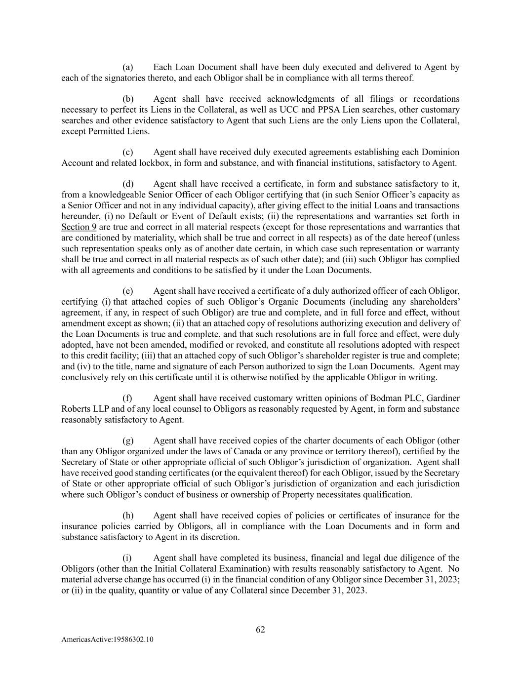 62 AmericasActive:19586302.10 (a) Each Loan Document shall have been duly executed and delivered to Agent by each of the signatories thereto, and each Obligor shall be in compliance with all terms thereof. (b) Agent shall have received acknowledgments of all filings or recordations necessary to perfect its Liens in the Collateral, as well as UCC and PPSA Lien searches, other customary searches and other evidence satisfactory to Agent that such Liens are the only Liens upon the Collateral, except Permitted Liens. (c) Agent shall have received duly executed agreements establishing each Dominion Account and related lockbox, in form and substance, and with financial institutions, satisfactory to Agent. (d) Agent shall have received a certificate, in form and substance satisfactory to it, from a knowledgeable Senior Officer of each Obligor certifying that (in such Senior Officer’s capacity as a Senior Officer and not in any individual capacity), after giving effect to the initial Loans and transactions hereunder, (i) no Default or Event of Default exists; (ii) the representations and warranties set forth in Section 9 are true and correct in all material respects (except for those representations and warranties that are conditioned by materiality, which shall be true and correct in all respects) as of the date hereof (unless such representation speaks only as of another date certain, in which case such representation or warranty shall be true and correct in all material respects as of such other date); and (iii) such Obligor has complied with all agreements and conditions to be satisfied by it under the Loan Documents. (e) Agent shall have received a certificate of a duly authorized officer of each Obligor, certifying (i) that attached copies of such Obligor’s Organic Documents (including any shareholders’ agreement, if any, in respect of such Obligor) are true and complete, and in full force and effect, without amendment except as shown; (ii) that an attached copy of resolutions authorizing execution and delivery of the Loan Documents is true and complete, and that such resolutions are in full force and effect, were duly adopted, have not been amended, modified or revoked, and constitute all resolutions adopted with respect to this credit facility; (iii) that an attached copy of such Obligor’s shareholder register is true and complete; and (iv) to the title, name and signature of each Person authorized to sign the Loan Documents. Agent may conclusively rely on this certificate until it is otherwise notified by the applicable Obligor in writing. (f) Agent shall have received customary written opinions of Bodman PLC, Gardiner Roberts LLP and of any local counsel to Obligors as reasonably requested by Agent, in form and substance reasonably satisfactory to Agent. (g) Agent shall have received copies of the charter documents of each Obligor (other than any Obligor organized under the laws of Canada or any province or territory thereof), certified by the Secretary of State or other appropriate official of such Obligor’s jurisdiction of organization. Agent shall have received good standing certificates (or the equivalent thereof) for each Obligor, issued by the Secretary of State or other appropriate official of such Obligor’s jurisdiction of organization and each jurisdiction where such Obligor’s conduct of business or ownership of Property necessitates qualification. (h) Agent shall have received copies of policies or certificates of insurance for the insurance policies carried by Obligors, all in compliance with the Loan Documents and in form and substance satisfactory to Agent in its discretion. (i) Agent shall have completed its business, financial and legal due diligence of the Obligors (other than the Initial Collateral Examination) with results reasonably satisfactory to Agent. No material adverse change has occurred (i) in the financial condition of any Obligor since December 31, 2023; or (ii) in the quality, quantity or value of any Collateral since December 31, 2023.