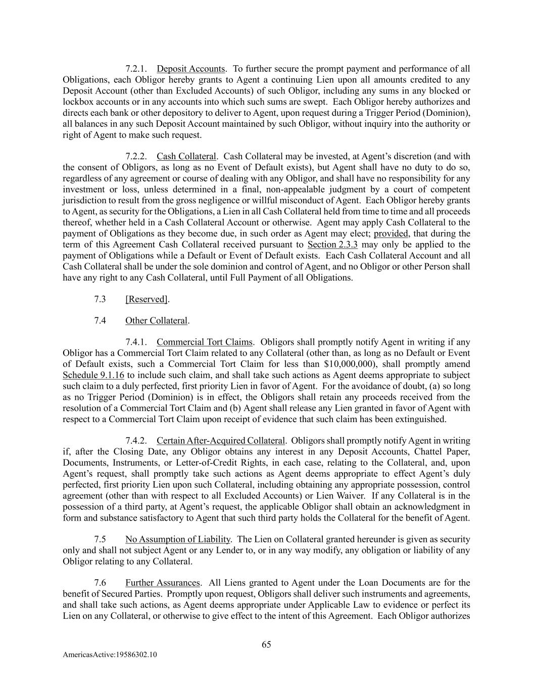 65 AmericasActive:19586302.10 7.2.1. Deposit Accounts. To further secure the prompt payment and performance of all Obligations, each Obligor hereby grants to Agent a continuing Lien upon all amounts credited to any Deposit Account (other than Excluded Accounts) of such Obligor, including any sums in any blocked or lockbox accounts or in any accounts into which such sums are swept. Each Obligor hereby authorizes and directs each bank or other depository to deliver to Agent, upon request during a Trigger Period (Dominion), all balances in any such Deposit Account maintained by such Obligor, without inquiry into the authority or right of Agent to make such request. 7.2.2. Cash Collateral. Cash Collateral may be invested, at Agent’s discretion (and with the consent of Obligors, as long as no Event of Default exists), but Agent shall have no duty to do so, regardless of any agreement or course of dealing with any Obligor, and shall have no responsibility for any investment or loss, unless determined in a final, non-appealable judgment by a court of competent jurisdiction to result from the gross negligence or willful misconduct of Agent. Each Obligor hereby grants to Agent, as security for the Obligations, a Lien in all Cash Collateral held from time to time and all proceeds thereof, whether held in a Cash Collateral Account or otherwise. Agent may apply Cash Collateral to the payment of Obligations as they become due, in such order as Agent may elect; provided, that during the term of this Agreement Cash Collateral received pursuant to Section 2.3.3 may only be applied to the payment of Obligations while a Default or Event of Default exists. Each Cash Collateral Account and all Cash Collateral shall be under the sole dominion and control of Agent, and no Obligor or other Person shall have any right to any Cash Collateral, until Full Payment of all Obligations. 7.3 [Reserved]. 7.4 Other Collateral. 7.4.1. Commercial Tort Claims. Obligors shall promptly notify Agent in writing if any Obligor has a Commercial Tort Claim related to any Collateral (other than, as long as no Default or Event of Default exists, such a Commercial Tort Claim for less than $10,000,000), shall promptly amend Schedule 9.1.16 to include such claim, and shall take such actions as Agent deems appropriate to subject such claim to a duly perfected, first priority Lien in favor of Agent. For the avoidance of doubt, (a) so long as no Trigger Period (Dominion) is in effect, the Obligors shall retain any proceeds received from the resolution of a Commercial Tort Claim and (b) Agent shall release any Lien granted in favor of Agent with respect to a Commercial Tort Claim upon receipt of evidence that such claim has been extinguished. 7.4.2. Certain After-Acquired Collateral. Obligors shall promptly notify Agent in writing if, after the Closing Date, any Obligor obtains any interest in any Deposit Accounts, Chattel Paper, Documents, Instruments, or Letter-of-Credit Rights, in each case, relating to the Collateral, and, upon Agent’s request, shall promptly take such actions as Agent deems appropriate to effect Agent’s duly perfected, first priority Lien upon such Collateral, including obtaining any appropriate possession, control agreement (other than with respect to all Excluded Accounts) or Lien Waiver. If any Collateral is in the possession of a third party, at Agent’s request, the applicable Obligor shall obtain an acknowledgment in form and substance satisfactory to Agent that such third party holds the Collateral for the benefit of Agent. 7.5 No Assumption of Liability. The Lien on Collateral granted hereunder is given as security only and shall not subject Agent or any Lender to, or in any way modify, any obligation or liability of any Obligor relating to any Collateral. 7.6 Further Assurances. All Liens granted to Agent under the Loan Documents are for the benefit of Secured Parties. Promptly upon request, Obligors shall deliver such instruments and agreements, and shall take such actions, as Agent deems appropriate under Applicable Law to evidence or perfect its Lien on any Collateral, or otherwise to give effect to the intent of this Agreement. Each Obligor authorizes