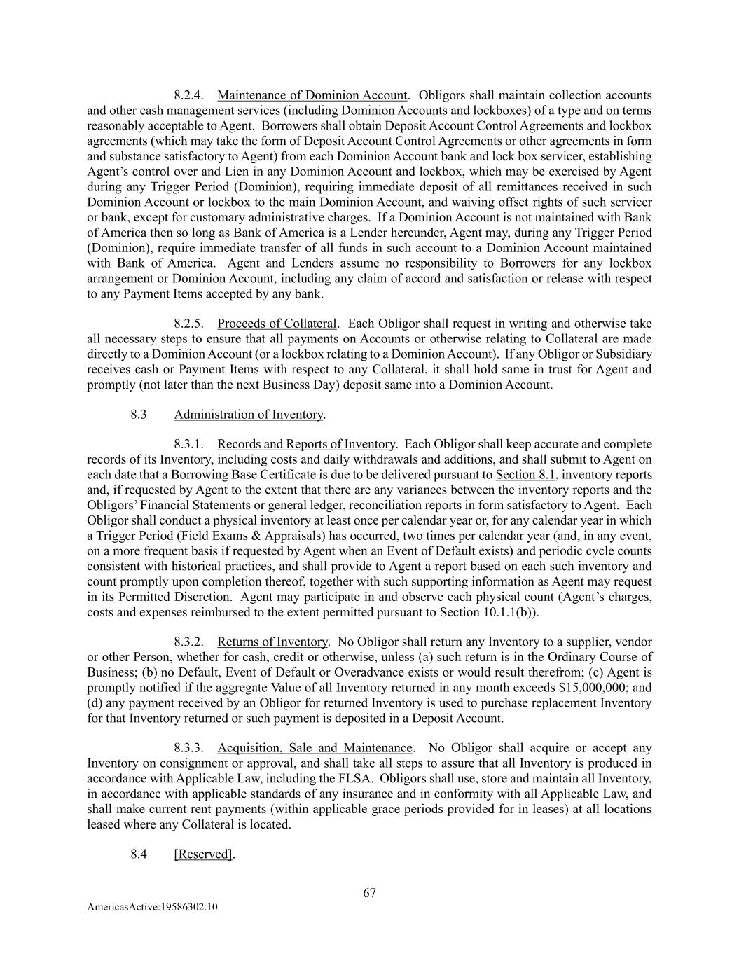 67 AmericasActive:19586302.10 8.2.4. Maintenance of Dominion Account. Obligors shall maintain collection accounts and other cash management services (including Dominion Accounts and lockboxes) of a type and on terms reasonably acceptable to Agent. Borrowers shall obtain Deposit Account Control Agreements and lockbox agreements (which may take the form of Deposit Account Control Agreements or other agreements in form and substance satisfactory to Agent) from each Dominion Account bank and lock box servicer, establishing Agent’s control over and Lien in any Dominion Account and lockbox, which may be exercised by Agent during any Trigger Period (Dominion), requiring immediate deposit of all remittances received in such Dominion Account or lockbox to the main Dominion Account, and waiving offset rights of such servicer or bank, except for customary administrative charges. If a Dominion Account is not maintained with Bank of America then so long as Bank of America is a Lender hereunder, Agent may, during any Trigger Period (Dominion), require immediate transfer of all funds in such account to a Dominion Account maintained with Bank of America. Agent and Lenders assume no responsibility to Borrowers for any lockbox arrangement or Dominion Account, including any claim of accord and satisfaction or release with respect to any Payment Items accepted by any bank. 8.2.5. Proceeds of Collateral. Each Obligor shall request in writing and otherwise take all necessary steps to ensure that all payments on Accounts or otherwise relating to Collateral are made directly to a Dominion Account (or a lockbox relating to a Dominion Account). If any Obligor or Subsidiary receives cash or Payment Items with respect to any Collateral, it shall hold same in trust for Agent and promptly (not later than the next Business Day) deposit same into a Dominion Account. 8.3 Administration of Inventory. 8.3.1. Records and Reports of Inventory. Each Obligor shall keep accurate and complete records of its Inventory, including costs and daily withdrawals and additions, and shall submit to Agent on each date that a Borrowing Base Certificate is due to be delivered pursuant to Section 8.1, inventory reports and, if requested by Agent to the extent that there are any variances between the inventory reports and the Obligors’ Financial Statements or general ledger, reconciliation reports in form satisfactory to Agent. Each Obligor shall conduct a physical inventory at least once per calendar year or, for any calendar year in which a Trigger Period (Field Exams & Appraisals) has occurred, two times per calendar year (and, in any event, on a more frequent basis if requested by Agent when an Event of Default exists) and periodic cycle counts consistent with historical practices, and shall provide to Agent a report based on each such inventory and count promptly upon completion thereof, together with such supporting information as Agent may request in its Permitted Discretion. Agent may participate in and observe each physical count (Agent’s charges, costs and expenses reimbursed to the extent permitted pursuant to Section 10.1.1(b)). 8.3.2. Returns of Inventory. No Obligor shall return any Inventory to a supplier, vendor or other Person, whether for cash, credit or otherwise, unless (a) such return is in the Ordinary Course of Business; (b) no Default, Event of Default or Overadvance exists or would result therefrom; (c) Agent is promptly notified if the aggregate Value of all Inventory returned in any month exceeds $15,000,000; and (d) any payment received by an Obligor for returned Inventory is used to purchase replacement Inventory for that Inventory returned or such payment is deposited in a Deposit Account. 8.3.3. Acquisition, Sale and Maintenance. No Obligor shall acquire or accept any Inventory on consignment or approval, and shall take all steps to assure that all Inventory is produced in accordance with Applicable Law, including the FLSA. Obligors shall use, store and maintain all Inventory, in accordance with applicable standards of any insurance and in conformity with all Applicable Law, and shall make current rent payments (within applicable grace periods provided for in leases) at all locations leased where any Collateral is located. 8.4 [Reserved].