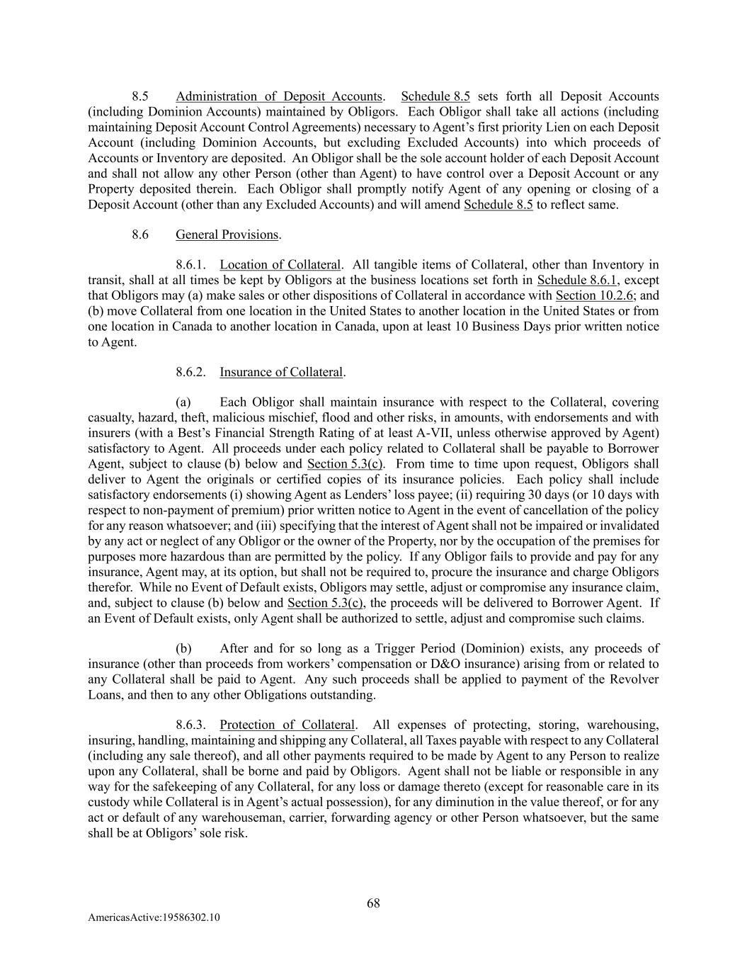 68 AmericasActive:19586302.10 8.5 Administration of Deposit Accounts. Schedule 8.5 sets forth all Deposit Accounts (including Dominion Accounts) maintained by Obligors. Each Obligor shall take all actions (including maintaining Deposit Account Control Agreements) necessary to Agent’s first priority Lien on each Deposit Account (including Dominion Accounts, but excluding Excluded Accounts) into which proceeds of Accounts or Inventory are deposited. An Obligor shall be the sole account holder of each Deposit Account and shall not allow any other Person (other than Agent) to have control over a Deposit Account or any Property deposited therein. Each Obligor shall promptly notify Agent of any opening or closing of a Deposit Account (other than any Excluded Accounts) and will amend Schedule 8.5 to reflect same. 8.6 General Provisions. 8.6.1. Location of Collateral. All tangible items of Collateral, other than Inventory in transit, shall at all times be kept by Obligors at the business locations set forth in Schedule 8.6.1, except that Obligors may (a) make sales or other dispositions of Collateral in accordance with Section 10.2.6; and (b) move Collateral from one location in the United States to another location in the United States or from one location in Canada to another location in Canada, upon at least 10 Business Days prior written notice to Agent. 8.6.2. Insurance of Collateral. (a) Each Obligor shall maintain insurance with respect to the Collateral, covering casualty, hazard, theft, malicious mischief, flood and other risks, in amounts, with endorsements and with insurers (with a Best’s Financial Strength Rating of at least A-VII, unless otherwise approved by Agent) satisfactory to Agent. All proceeds under each policy related to Collateral shall be payable to Borrower Agent, subject to clause (b) below and Section 5.3(c). From time to time upon request, Obligors shall deliver to Agent the originals or certified copies of its insurance policies. Each policy shall include satisfactory endorsements (i) showing Agent as Lenders’ loss payee; (ii) requiring 30 days (or 10 days with respect to non-payment of premium) prior written notice to Agent in the event of cancellation of the policy for any reason whatsoever; and (iii) specifying that the interest of Agent shall not be impaired or invalidated by any act or neglect of any Obligor or the owner of the Property, nor by the occupation of the premises for purposes more hazardous than are permitted by the policy. If any Obligor fails to provide and pay for any insurance, Agent may, at its option, but shall not be required to, procure the insurance and charge Obligors therefor. While no Event of Default exists, Obligors may settle, adjust or compromise any insurance claim, and, subject to clause (b) below and Section 5.3(c), the proceeds will be delivered to Borrower Agent. If an Event of Default exists, only Agent shall be authorized to settle, adjust and compromise such claims. (b) After and for so long as a Trigger Period (Dominion) exists, any proceeds of insurance (other than proceeds from workers’ compensation or D&O insurance) arising from or related to any Collateral shall be paid to Agent. Any such proceeds shall be applied to payment of the Revolver Loans, and then to any other Obligations outstanding. 8.6.3. Protection of Collateral. All expenses of protecting, storing, warehousing, insuring, handling, maintaining and shipping any Collateral, all Taxes payable with respect to any Collateral (including any sale thereof), and all other payments required to be made by Agent to any Person to realize upon any Collateral, shall be borne and paid by Obligors. Agent shall not be liable or responsible in any way for the safekeeping of any Collateral, for any loss or damage thereto (except for reasonable care in its custody while Collateral is in Agent’s actual possession), for any diminution in the value thereof, or for any act or default of any warehouseman, carrier, forwarding agency or other Person whatsoever, but the same shall be at Obligors’ sole risk.
