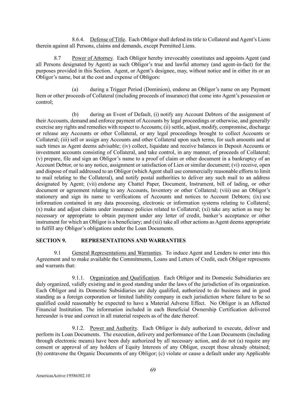 69 AmericasActive:19586302.10 8.6.4. Defense of Title. Each Obligor shall defend its title to Collateral and Agent’s Liens therein against all Persons, claims and demands, except Permitted Liens. 8.7 Power of Attorney. Each Obligor hereby irrevocably constitutes and appoints Agent (and all Persons designated by Agent) as such Obligor’s true and lawful attorney (and agent-in-fact) for the purposes provided in this Section. Agent, or Agent’s designee, may, without notice and in either its or an Obligor’s name, but at the cost and expense of Obligors: (a) during a Trigger Period (Dominion), endorse an Obligor’s name on any Payment Item or other proceeds of Collateral (including proceeds of insurance) that come into Agent’s possession or control; (b) during an Event of Default, (i) notify any Account Debtors of the assignment of their Accounts, demand and enforce payment of Accounts by legal proceedings or otherwise, and generally exercise any rights and remedies with respect to Accounts; (ii) settle, adjust, modify, compromise, discharge or release any Accounts or other Collateral, or any legal proceedings brought to collect Accounts or Collateral; (iii) sell or assign any Accounts and other Collateral upon such terms, for such amounts and at such times as Agent deems advisable; (iv) collect, liquidate and receive balances in Deposit Accounts or investment accounts consisting of Collateral, and take control, in any manner, of proceeds of Collateral; (v) prepare, file and sign an Obligor’s name to a proof of claim or other document in a bankruptcy of an Account Debtor, or to any notice, assignment or satisfaction of Lien or similar document; (vi) receive, open and dispose of mail addressed to an Obligor (which Agent shall use commercially reasonable efforts to limit to mail relating to the Collateral), and notify postal authorities to deliver any such mail to an address designated by Agent; (vii) endorse any Chattel Paper, Document, Instrument, bill of lading, or other document or agreement relating to any Accounts, Inventory or other Collateral; (viii) use an Obligor’s stationery and sign its name to verifications of Accounts and notices to Account Debtors; (ix) use information contained in any data processing, electronic or information systems relating to Collateral; (x) make and adjust claims under insurance policies related to Collateral; (xi) take any action as may be necessary or appropriate to obtain payment under any letter of credit, banker’s acceptance or other instrument for which an Obligor is a beneficiary; and (xii) take all other actions as Agent deems appropriate to fulfill any Obligor’s obligations under the Loan Documents. SECTION 9. REPRESENTATIONS AND WARRANTIES 9.1 General Representations and Warranties. To induce Agent and Lenders to enter into this Agreement and to make available the Commitments, Loans and Letters of Credit, each Obligor represents and warrants that: 9.1.1. Organization and Qualification. Each Obligor and its Domestic Subsidiaries are duly organized, validly existing and in good standing under the laws of the jurisdiction of its organization. Each Obligor and its Domestic Subsidiaries are duly qualified, authorized to do business and in good standing as a foreign corporation or limited liability company in each jurisdiction where failure to be so qualified could reasonably be expected to have a Material Adverse Effect. No Obligor is an Affected Financial Institution. The information included in each Beneficial Ownership Certification delivered hereunder is true and correct in all material respects as of the date thereof. 9.1.2. Power and Authority. Each Obligor is duly authorized to execute, deliver and perform its Loan Documents. The execution, delivery and performance of the Loan Documents (including through electronic means) have been duly authorized by all necessary action, and do not (a) require any consent or approval of any holders of Equity Interests of any Obligor, except those already obtained; (b) contravene the Organic Documents of any Obligor; (c) violate or cause a default under any Applicable