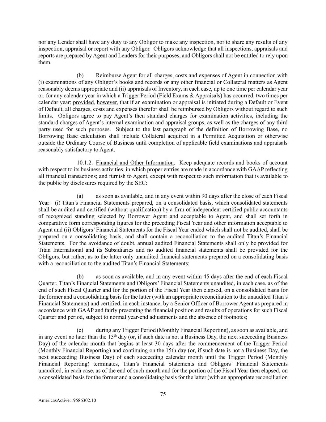 75 AmericasActive:19586302.10 nor any Lender shall have any duty to any Obligor to make any inspection, nor to share any results of any inspection, appraisal or report with any Obligor. Obligors acknowledge that all inspections, appraisals and reports are prepared by Agent and Lenders for their purposes, and Obligors shall not be entitled to rely upon them. (b) Reimburse Agent for all charges, costs and expenses of Agent in connection with (i) examinations of any Obligor’s books and records or any other financial or Collateral matters as Agent reasonably deems appropriate and (ii) appraisals of Inventory, in each case, up to one time per calendar year or, for any calendar year in which a Trigger Period (Field Exams & Appraisals) has occurred, two times per calendar year; provided, however, that if an examination or appraisal is initiated during a Default or Event of Default, all charges, costs and expenses therefor shall be reimbursed by Obligors without regard to such limits. Obligors agree to pay Agent’s then standard charges for examination activities, including the standard charges of Agent’s internal examination and appraisal groups, as well as the charges of any third party used for such purposes. Subject to the last paragraph of the definition of Borrowing Base, no Borrowing Base calculation shall include Collateral acquired in a Permitted Acquisition or otherwise outside the Ordinary Course of Business until completion of applicable field examinations and appraisals reasonably satisfactory to Agent. 10.1.2. Financial and Other Information. Keep adequate records and books of account with respect to its business activities, in which proper entries are made in accordance with GAAP reflecting all financial transactions; and furnish to Agent, except with respect to such information that is available to the public by disclosures required by the SEC: (a) as soon as available, and in any event within 90 days after the close of each Fiscal Year: (i) Titan’s Financial Statements prepared, on a consolidated basis, which consolidated statements shall be audited and certified (without qualification) by a firm of independent certified public accountants of recognized standing selected by Borrower Agent and acceptable to Agent, and shall set forth in comparative form corresponding figures for the preceding Fiscal Year and other information acceptable to Agent and (ii) Obligors’ Financial Statements for the Fiscal Year ended which shall not be audited, shall be prepared on a consolidating basis, and shall contain a reconciliation to the audited Titan’s Financial Statements. For the avoidance of doubt, annual audited Financial Statements shall only be provided for Titan International and its Subsidiaries and no audited financial statements shall be provided for the Obligors, but rather, as to the latter only unaudited financial statements prepared on a consolidating basis with a reconciliation to the audited Titan’s Financial Statements; (b) as soon as available, and in any event within 45 days after the end of each Fiscal Quarter, Titan’s Financial Statements and Obligors’ Financial Statements unaudited, in each case, as of the end of such Fiscal Quarter and for the portion of the Fiscal Year then elapsed, on a consolidated basis for the former and a consolidating basis for the latter (with an appropriate reconciliation to the unaudited Titan’s Financial Statements) and certified, in each instance, by a Senior Officer of Borrower Agent as prepared in accordance with GAAP and fairly presenting the financial position and results of operations for such Fiscal Quarter and period, subject to normal year-end adjustments and the absence of footnotes; (c) during any Trigger Period (Monthly Financial Reporting), as soon as available, and in any event no later than the 15th day (or, if such date is not a Business Day, the next succeeding Business Day) of the calendar month that begins at least 30 days after the commencement of the Trigger Period (Monthly Financial Reporting) and continuing on the 15th day (or, if such date is not a Business Day, the next succeeding Business Day) of each succeeding calendar month until the Trigger Period (Monthly Financial Reporting) terminates, Titan’s Financial Statements and Obligors’ Financial Statements unaudited, in each case, as of the end of such month and for the portion of the Fiscal Year then elapsed, on a consolidated basis for the former and a consolidating basis for the latter (with an appropriate reconciliation