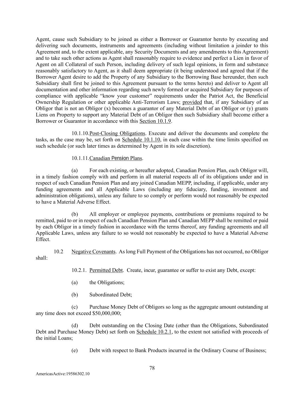78 AmericasActive:19586302.10 Agent, cause such Subsidiary to be joined as either a Borrower or Guarantor hereto by executing and delivering such documents, instruments and agreements (including without limitation a joinder to this Agreement and, to the extent applicable, any Security Documents and any amendments to this Agreement) and to take such other actions as Agent shall reasonably require to evidence and perfect a Lien in favor of Agent on all Collateral of such Person, including delivery of such legal opinions, in form and substance reasonably satisfactory to Agent, as it shall deem appropriate (it being understood and agreed that if the Borrower Agent desire to add the Property of any Subsidiary to the Borrowing Base hereunder, then such Subsidiary shall first be joined to this Agreement pursuant to the terms hereto) and deliver to Agent all documentation and other information regarding such newly formed or acquired Subsidiary for purposes of compliance with applicable “know your customer” requirements under the Patriot Act, the Beneficial Ownership Regulation or other applicable Anti-Terrorism Laws; provided that, if any Subsidiary of an Obligor that is not an Obligor (x) becomes a guarantor of any Material Debt of an Obligor or (y) grants Liens on Property to support any Material Debt of an Obligor then such Subsidiary shall become either a Borrower or Guarantor in accordance with this Section 10.1.9. 10.1.10. Post-Closing Obligations. Execute and deliver the documents and complete the tasks, as the case may be, set forth on Schedule 10.1.10, in each case within the time limits specified on such schedule (or such later times as determined by Agent in its sole discretion). 10.1.11. Canadian Pension Plans. (a) For each existing, or hereafter adopted, Canadian Pension Plan, each Obligor will, in a timely fashion comply with and perform in all material respects all of its obligations under and in respect of such Canadian Pension Plan and any joined Canadian MEPP, including, if applicable, under any funding agreements and all Applicable Laws (including any fiduciary, funding, investment and administration obligations), unless any failure to so comply or perform would not reasonably be expected to have a Material Adverse Effect. (b) All employer or employee payments, contributions or premiums required to be remitted, paid to or in respect of each Canadian Pension Plan and Canadian MEPP shall be remitted or paid by each Obligor in a timely fashion in accordance with the terms thereof, any funding agreements and all Applicable Laws, unless any failure to so would not reasonably be expected to have a Material Adverse Effect. 10.2 Negative Covenants. As long Full Payment of the Obligations has not occurred, no Obligor shall: 10.2.1. Permitted Debt. Create, incur, guarantee or suffer to exist any Debt, except: (a) the Obligations; (b) Subordinated Debt; (c) Purchase Money Debt of Obligors so long as the aggregate amount outstanding at any time does not exceed $50,000,000; (d) Debt outstanding on the Closing Date (other than the Obligations, Subordinated Debt and Purchase Money Debt) set forth on Schedule 10.2.1, to the extent not satisfied with proceeds of the initial Loans; (e) Debt with respect to Bank Products incurred in the Ordinary Course of Business;
