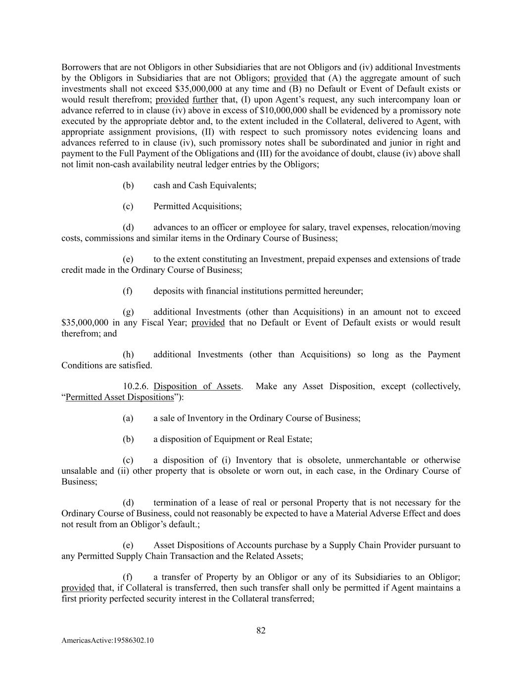82 AmericasActive:19586302.10 Borrowers that are not Obligors in other Subsidiaries that are not Obligors and (iv) additional Investments by the Obligors in Subsidiaries that are not Obligors; provided that (A) the aggregate amount of such investments shall not exceed $35,000,000 at any time and (B) no Default or Event of Default exists or would result therefrom; provided further that, (I) upon Agent’s request, any such intercompany loan or advance referred to in clause (iv) above in excess of $10,000,000 shall be evidenced by a promissory note executed by the appropriate debtor and, to the extent included in the Collateral, delivered to Agent, with appropriate assignment provisions, (II) with respect to such promissory notes evidencing loans and advances referred to in clause (iv), such promissory notes shall be subordinated and junior in right and payment to the Full Payment of the Obligations and (III) for the avoidance of doubt, clause (iv) above shall not limit non-cash availability neutral ledger entries by the Obligors; (b) cash and Cash Equivalents; (c) Permitted Acquisitions; (d) advances to an officer or employee for salary, travel expenses, relocation/moving costs, commissions and similar items in the Ordinary Course of Business; (e) to the extent constituting an Investment, prepaid expenses and extensions of trade credit made in the Ordinary Course of Business; (f) deposits with financial institutions permitted hereunder; (g) additional Investments (other than Acquisitions) in an amount not to exceed $35,000,000 in any Fiscal Year; provided that no Default or Event of Default exists or would result therefrom; and (h) additional Investments (other than Acquisitions) so long as the Payment Conditions are satisfied. 10.2.6. Disposition of Assets. Make any Asset Disposition, except (collectively, “Permitted Asset Dispositions”): (a) a sale of Inventory in the Ordinary Course of Business; (b) a disposition of Equipment or Real Estate; (c) a disposition of (i) Inventory that is obsolete, unmerchantable or otherwise unsalable and (ii) other property that is obsolete or worn out, in each case, in the Ordinary Course of Business; (d) termination of a lease of real or personal Property that is not necessary for the Ordinary Course of Business, could not reasonably be expected to have a Material Adverse Effect and does not result from an Obligor’s default.; (e) Asset Dispositions of Accounts purchase by a Supply Chain Provider pursuant to any Permitted Supply Chain Transaction and the Related Assets; (f) a transfer of Property by an Obligor or any of its Subsidiaries to an Obligor; provided that, if Collateral is transferred, then such transfer shall only be permitted if Agent maintains a first priority perfected security interest in the Collateral transferred;