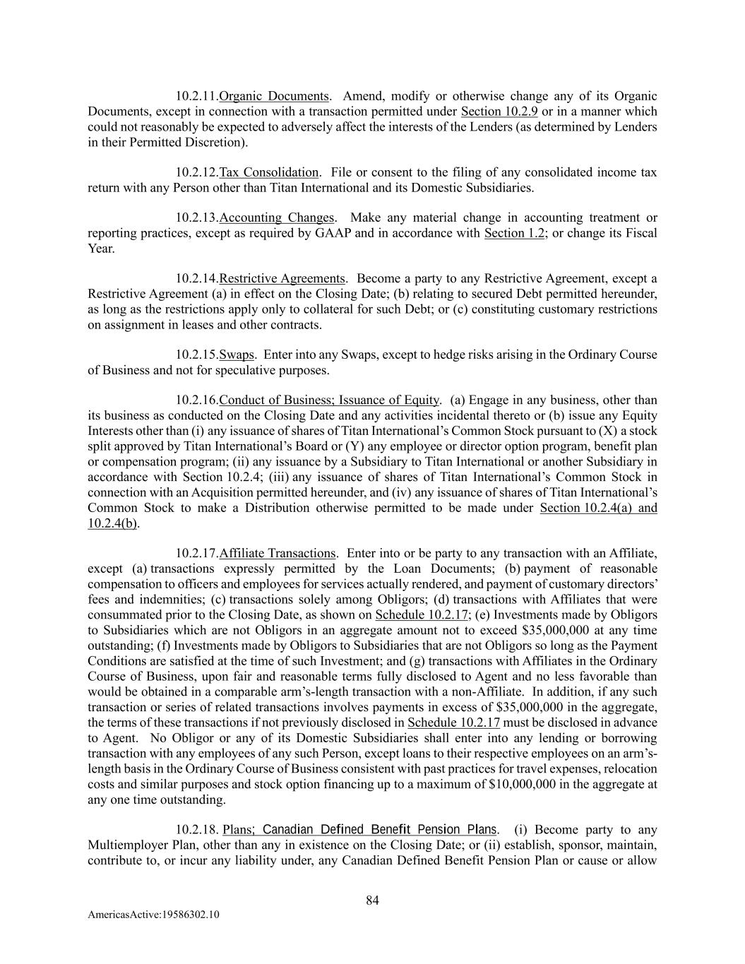 84 AmericasActive:19586302.10 10.2.11. Organic Documents. Amend, modify or otherwise change any of its Organic Documents, except in connection with a transaction permitted under Section 10.2.9 or in a manner which could not reasonably be expected to adversely affect the interests of the Lenders (as determined by Lenders in their Permitted Discretion). 10.2.12. Tax Consolidation. File or consent to the filing of any consolidated income tax return with any Person other than Titan International and its Domestic Subsidiaries. 10.2.13. Accounting Changes. Make any material change in accounting treatment or reporting practices, except as required by GAAP and in accordance with Section 1.2; or change its Fiscal Year. 10.2.14. Restrictive Agreements. Become a party to any Restrictive Agreement, except a Restrictive Agreement (a) in effect on the Closing Date; (b) relating to secured Debt permitted hereunder, as long as the restrictions apply only to collateral for such Debt; or (c) constituting customary restrictions on assignment in leases and other contracts. 10.2.15. Swaps. Enter into any Swaps, except to hedge risks arising in the Ordinary Course of Business and not for speculative purposes. 10.2.16. Conduct of Business; Issuance of Equity. (a) Engage in any business, other than its business as conducted on the Closing Date and any activities incidental thereto or (b) issue any Equity Interests other than (i) any issuance of shares of Titan International’s Common Stock pursuant to (X) a stock split approved by Titan International’s Board or (Y) any employee or director option program, benefit plan or compensation program; (ii) any issuance by a Subsidiary to Titan International or another Subsidiary in accordance with Section 10.2.4; (iii) any issuance of shares of Titan International’s Common Stock in connection with an Acquisition permitted hereunder, and (iv) any issuance of shares of Titan International’s Common Stock to make a Distribution otherwise permitted to be made under Section 10.2.4(a) and 10.2.4(b). 10.2.17. Affiliate Transactions. Enter into or be party to any transaction with an Affiliate, except (a) transactions expressly permitted by the Loan Documents; (b) payment of reasonable compensation to officers and employees for services actually rendered, and payment of customary directors’ fees and indemnities; (c) transactions solely among Obligors; (d) transactions with Affiliates that were consummated prior to the Closing Date, as shown on Schedule 10.2.17; (e) Investments made by Obligors to Subsidiaries which are not Obligors in an aggregate amount not to exceed $35,000,000 at any time outstanding; (f) Investments made by Obligors to Subsidiaries that are not Obligors so long as the Payment Conditions are satisfied at the time of such Investment; and (g) transactions with Affiliates in the Ordinary Course of Business, upon fair and reasonable terms fully disclosed to Agent and no less favorable than would be obtained in a comparable arm’s-length transaction with a non-Affiliate. In addition, if any such transaction or series of related transactions involves payments in excess of $35,000,000 in the aggregate, the terms of these transactions if not previously disclosed in Schedule 10.2.17 must be disclosed in advance to Agent. No Obligor or any of its Domestic Subsidiaries shall enter into any lending or borrowing transaction with any employees of any such Person, except loans to their respective employees on an arm’s- length basis in the Ordinary Course of Business consistent with past practices for travel expenses, relocation costs and similar purposes and stock option financing up to a maximum of $10,000,000 in the aggregate at any one time outstanding. 10.2.18. Plans; Canadian Defined Benefit Pension Plans. (i) Become party to any Multiemployer Plan, other than any in existence on the Closing Date; or (ii) establish, sponsor, maintain, contribute to, or incur any liability under, any Canadian Defined Benefit Pension Plan or cause or allow