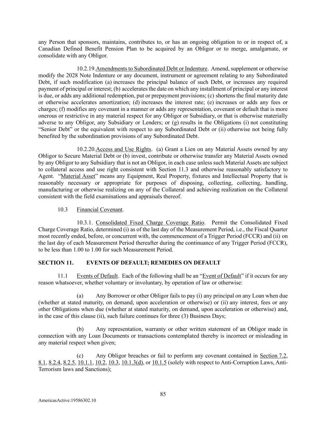 85 AmericasActive:19586302.10 any Person that sponsors, maintains, contributes to, or has an ongoing obligation to or in respect of, a Canadian Defined Benefit Pension Plan to be acquired by an Obligor or to merge, amalgamate, or consolidate with any Obligor. 10.2.19. Amendments to Subordinated Debt or Indenture. Amend, supplement or otherwise modify the 2028 Note Indenture or any document, instrument or agreement relating to any Subordinated Debt, if such modification (a) increases the principal balance of such Debt, or increases any required payment of principal or interest; (b) accelerates the date on which any installment of principal or any interest is due, or adds any additional redemption, put or prepayment provisions; (c) shortens the final maturity date or otherwise accelerates amortization; (d) increases the interest rate; (e) increases or adds any fees or charges; (f) modifies any covenant in a manner or adds any representation, covenant or default that is more onerous or restrictive in any material respect for any Obligor or Subsidiary, or that is otherwise materially adverse to any Obligor, any Subsidiary or Lenders; or (g) results in the Obligations (i) not constituting “Senior Debt” or the equivalent with respect to any Subordinated Debt or (ii) otherwise not being fully benefited by the subordination provisions of any Subordinated Debt. 10.2.20. Access and Use Rights. (a) Grant a Lien on any Material Assets owned by any Obligor to Secure Material Debt or (b) invest, contribute or otherwise transfer any Material Assets owned by any Obligor to any Subsidiary that is not an Obligor, in each case unless such Material Assets are subject to collateral access and use right consistent with Section 11.3 and otherwise reasonably satisfactory to Agent. “Material Asset” means any Equipment, Real Property, fixtures and Intellectual Property that is reasonably necessary or appropriate for purposes of disposing, collecting, collecting, handling, manufacturing or otherwise realizing on any of the Collateral and achieving realization on the Collateral consistent with the field examinations and appraisals thereof. 10.3 Financial Covenant. 10.3.1. Consolidated Fixed Charge Coverage Ratio. Permit the Consolidated Fixed Charge Coverage Ratio, determined (i) as of the last day of the Measurement Period, i.e., the Fiscal Quarter most recently ended, before, or concurrent with, the commencement of a Trigger Period (FCCR) and (ii) on the last day of each Measurement Period thereafter during the continuance of any Trigger Period (FCCR), to be less than 1.00 to 1.00 for such Measurement Period. SECTION 11. EVENTS OF DEFAULT; REMEDIES ON DEFAULT 11.1 Events of Default. Each of the following shall be an “Event of Default” if it occurs for any reason whatsoever, whether voluntary or involuntary, by operation of law or otherwise: (a) Any Borrower or other Obligor fails to pay (i) any principal on any Loan when due (whether at stated maturity, on demand, upon acceleration or otherwise) or (ii) any interest, fees or any other Obligations when due (whether at stated maturity, on demand, upon acceleration or otherwise) and, in the case of this clause (ii), such failure continues for three (3) Business Days; (b) Any representation, warranty or other written statement of an Obligor made in connection with any Loan Documents or transactions contemplated thereby is incorrect or misleading in any material respect when given; (c) Any Obligor breaches or fail to perform any covenant contained in Section 7.2, 8.1, 8.2.4, 8.2.5, 10.1.1, 10.2, 10.3, 10.1.3(d), or 10.1.5 (solely with respect to Anti-Corruption Laws, Anti- Terrorism laws and Sanctions);