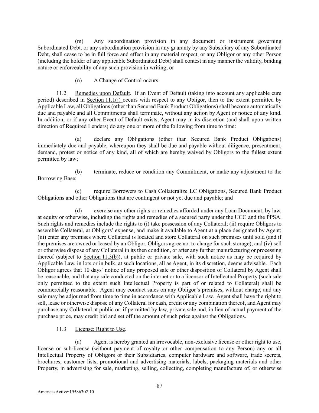 87 AmericasActive:19586302.10 (m) Any subordination provision in any document or instrument governing Subordinated Debt, or any subordination provision in any guaranty by any Subsidiary of any Subordinated Debt, shall cease to be in full force and effect in any material respect, or any Obligor or any other Person (including the holder of any applicable Subordinated Debt) shall contest in any manner the validity, binding nature or enforceability of any such provision in writing; or (n) A Change of Control occurs. 11.2 Remedies upon Default. If an Event of Default (taking into account any applicable cure period) described in Section 11.1(j) occurs with respect to any Obligor, then to the extent permitted by Applicable Law, all Obligations (other than Secured Bank Product Obligations) shall become automatically due and payable and all Commitments shall terminate, without any action by Agent or notice of any kind. In addition, or if any other Event of Default exists, Agent may in its discretion (and shall upon written direction of Required Lenders) do any one or more of the following from time to time: (a) declare any Obligations (other than Secured Bank Product Obligations) immediately due and payable, whereupon they shall be due and payable without diligence, presentment, demand, protest or notice of any kind, all of which are hereby waived by Obligors to the fullest extent permitted by law; (b) terminate, reduce or condition any Commitment, or make any adjustment to the Borrowing Base; (c) require Borrowers to Cash Collateralize LC Obligations, Secured Bank Product Obligations and other Obligations that are contingent or not yet due and payable; and (d) exercise any other rights or remedies afforded under any Loan Document, by law, at equity or otherwise, including the rights and remedies of a secured party under the UCC and the PPSA. Such rights and remedies include the rights to (i) take possession of any Collateral; (ii) require Obligors to assemble Collateral, at Obligors’ expense, and make it available to Agent at a place designated by Agent; (iii) enter any premises where Collateral is located and store Collateral on such premises until sold (and if the premises are owned or leased by an Obligor, Obligors agree not to charge for such storage); and (iv) sell or otherwise dispose of any Collateral in its then condition, or after any further manufacturing or processing thereof (subject to Section 11.3(b)), at public or private sale, with such notice as may be required by Applicable Law, in lots or in bulk, at such locations, all as Agent, in its discretion, deems advisable. Each Obligor agrees that 10 days’ notice of any proposed sale or other disposition of Collateral by Agent shall be reasonable, and that any sale conducted on the internet or to a licensor of Intellectual Property (such sale only permitted to the extent such Intellectual Property is part of or related to Collateral) shall be commercially reasonable. Agent may conduct sales on any Obligor’s premises, without charge, and any sale may be adjourned from time to time in accordance with Applicable Law. Agent shall have the right to sell, lease or otherwise dispose of any Collateral for cash, credit or any combination thereof, and Agent may purchase any Collateral at public or, if permitted by law, private sale and, in lieu of actual payment of the purchase price, may credit bid and set off the amount of such price against the Obligations. 11.3 License; Right to Use. (a) Agent is hereby granted an irrevocable, non-exclusive license or other right to use, license or sub-license (without payment of royalty or other compensation to any Person) any or all Intellectual Property of Obligors or their Subsidiaries, computer hardware and software, trade secrets, brochures, customer lists, promotional and advertising materials, labels, packaging materials and other Property, in advertising for sale, marketing, selling, collecting, completing manufacture of, or otherwise