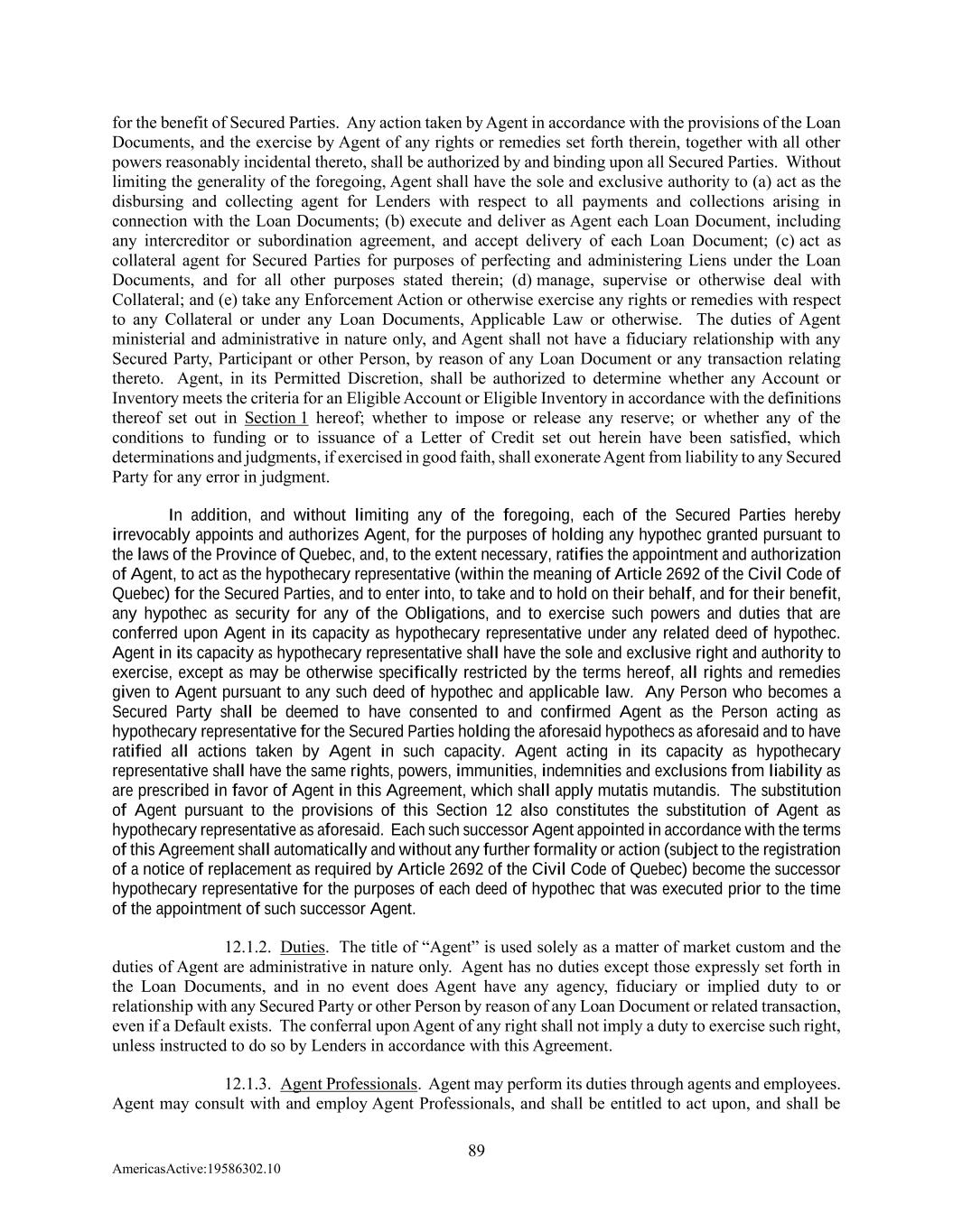 89 AmericasActive:19586302.10 for the benefit of Secured Parties. Any action taken by Agent in accordance with the provisions of the Loan Documents, and the exercise by Agent of any rights or remedies set forth therein, together with all other powers reasonably incidental thereto, shall be authorized by and binding upon all Secured Parties. Without limiting the generality of the foregoing, Agent shall have the sole and exclusive authority to (a) act as the disbursing and collecting agent for Lenders with respect to all payments and collections arising in connection with the Loan Documents; (b) execute and deliver as Agent each Loan Document, including any intercreditor or subordination agreement, and accept delivery of each Loan Document; (c) act as collateral agent for Secured Parties for purposes of perfecting and administering Liens under the Loan Documents, and for all other purposes stated therein; (d) manage, supervise or otherwise deal with Collateral; and (e) take any Enforcement Action or otherwise exercise any rights or remedies with respect to any Collateral or under any Loan Documents, Applicable Law or otherwise. The duties of Agent ministerial and administrative in nature only, and Agent shall not have a fiduciary relationship with any Secured Party, Participant or other Person, by reason of any Loan Document or any transaction relating thereto. Agent, in its Permitted Discretion, shall be authorized to determine whether any Account or Inventory meets the criteria for an Eligible Account or Eligible Inventory in accordance with the definitions thereof set out in Section 1 hereof; whether to impose or release any reserve; or whether any of the conditions to funding or to issuance of a Letter of Credit set out herein have been satisfied, which determinations and judgments, if exercised in good faith, shall exonerate Agent from liability to any Secured Party for any error in judgment. In addition, and without limiting any of the foregoing, each of the Secured Parties hereby irrevocably appoints and authorizes Agent, for the purposes of holding any hypothec granted pursuant to the laws of the Province of Quebec, and, to the extent necessary, ratifies the appointment and authorization of Agent, to act as the hypothecary representative (within the meaning of Article 2692 of the Civil Code of Quebec) for the Secured Parties, and to enter into, to take and to hold on their behalf, and for their benefit, any hypothec as security for any of the Obligations, and to exercise such powers and duties that are conferred upon Agent in its capacity as hypothecary representative under any related deed of hypothec. Agent in its capacity as hypothecary representative shall have the sole and exclusive right and authority to exercise, except as may be otherwise specifically restricted by the terms hereof, all rights and remedies given to Agent pursuant to any such deed of hypothec and applicable law. Any Person who becomes a Secured Party shall be deemed to have consented to and confirmed Agent as the Person acting as hypothecary representative for the Secured Parties holding the aforesaid hypothecs as aforesaid and to have ratified all actions taken by Agent in such capacity. Agent acting in its capacity as hypothecary representative shall have the same rights, powers, immunities, indemnities and exclusions from liability as are prescribed in favor of Agent in this Agreement, which shall apply mutatis mutandis. The substitution of Agent pursuant to the provisions of this Section 12 also constitutes the substitution of Agent as hypothecary representative as aforesaid. Each such successor Agent appointed in accordance with the terms of this Agreement shall automatically and without any further formality or action (subject to the registration of a notice of replacement as required by Article 2692 of the Civil Code of Quebec) become the successor hypothecary representative for the purposes of each deed of hypothec that was executed prior to the time of the appointment of such successor Agent. 12.1.2. Duties. The title of “Agent” is used solely as a matter of market custom and the duties of Agent are administrative in nature only. Agent has no duties except those expressly set forth in the Loan Documents, and in no event does Agent have any agency, fiduciary or implied duty to or relationship with any Secured Party or other Person by reason of any Loan Document or related transaction, even if a Default exists. The conferral upon Agent of any right shall not imply a duty to exercise such right, unless instructed to do so by Lenders in accordance with this Agreement. 12.1.3. Agent Professionals. Agent may perform its duties through agents and employees. Agent may consult with and employ Agent Professionals, and shall be entitled to act upon, and shall be