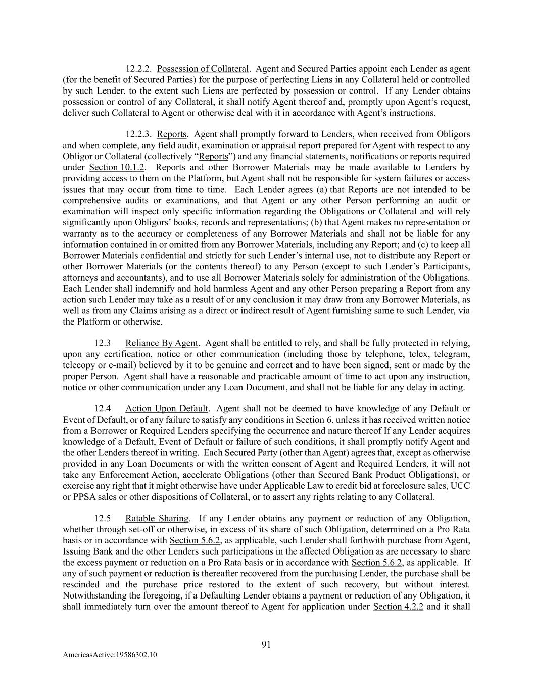 91 AmericasActive:19586302.10 12.2.2. Possession of Collateral. Agent and Secured Parties appoint each Lender as agent (for the benefit of Secured Parties) for the purpose of perfecting Liens in any Collateral held or controlled by such Lender, to the extent such Liens are perfected by possession or control. If any Lender obtains possession or control of any Collateral, it shall notify Agent thereof and, promptly upon Agent’s request, deliver such Collateral to Agent or otherwise deal with it in accordance with Agent’s instructions. 12.2.3. Reports. Agent shall promptly forward to Lenders, when received from Obligors and when complete, any field audit, examination or appraisal report prepared for Agent with respect to any Obligor or Collateral (collectively “Reports”) and any financial statements, notifications or reports required under Section 10.1.2. Reports and other Borrower Materials may be made available to Lenders by providing access to them on the Platform, but Agent shall not be responsible for system failures or access issues that may occur from time to time. Each Lender agrees (a) that Reports are not intended to be comprehensive audits or examinations, and that Agent or any other Person performing an audit or examination will inspect only specific information regarding the Obligations or Collateral and will rely significantly upon Obligors’ books, records and representations; (b) that Agent makes no representation or warranty as to the accuracy or completeness of any Borrower Materials and shall not be liable for any information contained in or omitted from any Borrower Materials, including any Report; and (c) to keep all Borrower Materials confidential and strictly for such Lender’s internal use, not to distribute any Report or other Borrower Materials (or the contents thereof) to any Person (except to such Lender’s Participants, attorneys and accountants), and to use all Borrower Materials solely for administration of the Obligations. Each Lender shall indemnify and hold harmless Agent and any other Person preparing a Report from any action such Lender may take as a result of or any conclusion it may draw from any Borrower Materials, as well as from any Claims arising as a direct or indirect result of Agent furnishing same to such Lender, via the Platform or otherwise. 12.3 Reliance By Agent. Agent shall be entitled to rely, and shall be fully protected in relying, upon any certification, notice or other communication (including those by telephone, telex, telegram, telecopy or e-mail) believed by it to be genuine and correct and to have been signed, sent or made by the proper Person. Agent shall have a reasonable and practicable amount of time to act upon any instruction, notice or other communication under any Loan Document, and shall not be liable for any delay in acting. 12.4 Action Upon Default. Agent shall not be deemed to have knowledge of any Default or Event of Default, or of any failure to satisfy any conditions in Section 6, unless it has received written notice from a Borrower or Required Lenders specifying the occurrence and nature thereof If any Lender acquires knowledge of a Default, Event of Default or failure of such conditions, it shall promptly notify Agent and the other Lenders thereof in writing. Each Secured Party (other than Agent) agrees that, except as otherwise provided in any Loan Documents or with the written consent of Agent and Required Lenders, it will not take any Enforcement Action, accelerate Obligations (other than Secured Bank Product Obligations), or exercise any right that it might otherwise have under Applicable Law to credit bid at foreclosure sales, UCC or PPSA sales or other dispositions of Collateral, or to assert any rights relating to any Collateral. 12.5 Ratable Sharing. If any Lender obtains any payment or reduction of any Obligation, whether through set-off or otherwise, in excess of its share of such Obligation, determined on a Pro Rata basis or in accordance with Section 5.6.2, as applicable, such Lender shall forthwith purchase from Agent, Issuing Bank and the other Lenders such participations in the affected Obligation as are necessary to share the excess payment or reduction on a Pro Rata basis or in accordance with Section 5.6.2, as applicable. If any of such payment or reduction is thereafter recovered from the purchasing Lender, the purchase shall be rescinded and the purchase price restored to the extent of such recovery, but without interest. Notwithstanding the foregoing, if a Defaulting Lender obtains a payment or reduction of any Obligation, it shall immediately turn over the amount thereof to Agent for application under Section 4.2.2 and it shall