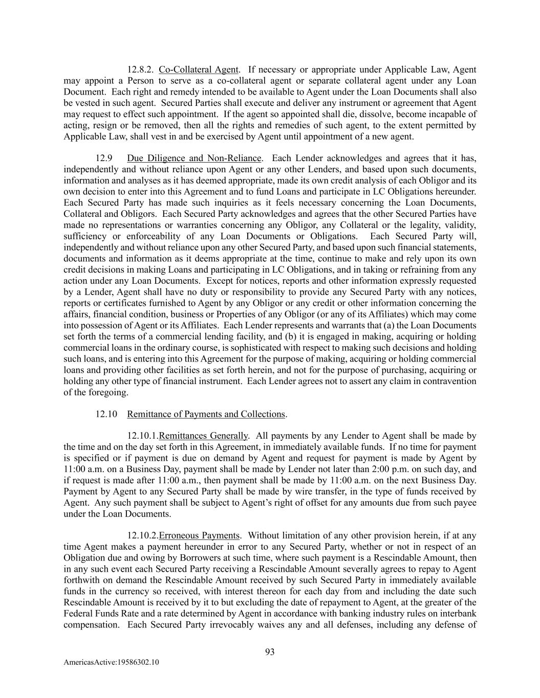 93 AmericasActive:19586302.10 12.8.2. Co-Collateral Agent. If necessary or appropriate under Applicable Law, Agent may appoint a Person to serve as a co-collateral agent or separate collateral agent under any Loan Document. Each right and remedy intended to be available to Agent under the Loan Documents shall also be vested in such agent. Secured Parties shall execute and deliver any instrument or agreement that Agent may request to effect such appointment. If the agent so appointed shall die, dissolve, become incapable of acting, resign or be removed, then all the rights and remedies of such agent, to the extent permitted by Applicable Law, shall vest in and be exercised by Agent until appointment of a new agent. 12.9 Due Diligence and Non-Reliance. Each Lender acknowledges and agrees that it has, independently and without reliance upon Agent or any other Lenders, and based upon such documents, information and analyses as it has deemed appropriate, made its own credit analysis of each Obligor and its own decision to enter into this Agreement and to fund Loans and participate in LC Obligations hereunder. Each Secured Party has made such inquiries as it feels necessary concerning the Loan Documents, Collateral and Obligors. Each Secured Party acknowledges and agrees that the other Secured Parties have made no representations or warranties concerning any Obligor, any Collateral or the legality, validity, sufficiency or enforceability of any Loan Documents or Obligations. Each Secured Party will, independently and without reliance upon any other Secured Party, and based upon such financial statements, documents and information as it deems appropriate at the time, continue to make and rely upon its own credit decisions in making Loans and participating in LC Obligations, and in taking or refraining from any action under any Loan Documents. Except for notices, reports and other information expressly requested by a Lender, Agent shall have no duty or responsibility to provide any Secured Party with any notices, reports or certificates furnished to Agent by any Obligor or any credit or other information concerning the affairs, financial condition, business or Properties of any Obligor (or any of its Affiliates) which may come into possession of Agent or its Affiliates. Each Lender represents and warrants that (a) the Loan Documents set forth the terms of a commercial lending facility, and (b) it is engaged in making, acquiring or holding commercial loans in the ordinary course, is sophisticated with respect to making such decisions and holding such loans, and is entering into this Agreement for the purpose of making, acquiring or holding commercial loans and providing other facilities as set forth herein, and not for the purpose of purchasing, acquiring or holding any other type of financial instrument. Each Lender agrees not to assert any claim in contravention of the foregoing. 12.10 Remittance of Payments and Collections. 12.10.1. Remittances Generally. All payments by any Lender to Agent shall be made by the time and on the day set forth in this Agreement, in immediately available funds. If no time for payment is specified or if payment is due on demand by Agent and request for payment is made by Agent by 11:00 a.m. on a Business Day, payment shall be made by Lender not later than 2:00 p.m. on such day, and if request is made after 11:00 a.m., then payment shall be made by 11:00 a.m. on the next Business Day. Payment by Agent to any Secured Party shall be made by wire transfer, in the type of funds received by Agent. Any such payment shall be subject to Agent’s right of offset for any amounts due from such payee under the Loan Documents. 12.10.2. Erroneous Payments. Without limitation of any other provision herein, if at any time Agent makes a payment hereunder in error to any Secured Party, whether or not in respect of an Obligation due and owing by Borrowers at such time, where such payment is a Rescindable Amount, then in any such event each Secured Party receiving a Rescindable Amount severally agrees to repay to Agent forthwith on demand the Rescindable Amount received by such Secured Party in immediately available funds in the currency so received, with interest thereon for each day from and including the date such Rescindable Amount is received by it to but excluding the date of repayment to Agent, at the greater of the Federal Funds Rate and a rate determined by Agent in accordance with banking industry rules on interbank compensation. Each Secured Party irrevocably waives any and all defenses, including any defense of