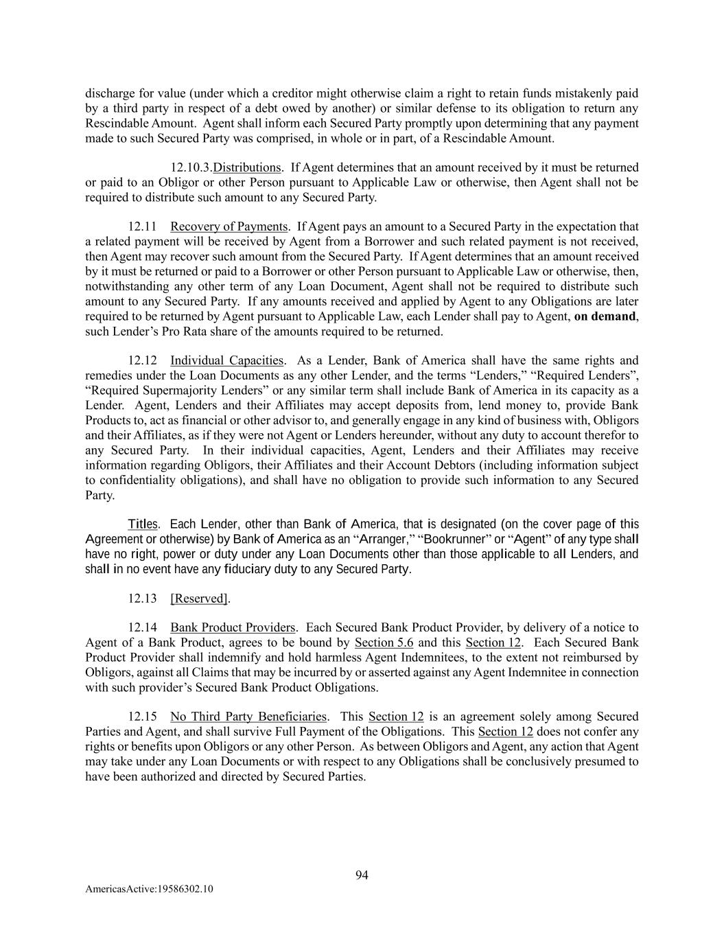 94 AmericasActive:19586302.10 discharge for value (under which a creditor might otherwise claim a right to retain funds mistakenly paid by a third party in respect of a debt owed by another) or similar defense to its obligation to return any Rescindable Amount. Agent shall inform each Secured Party promptly upon determining that any payment made to such Secured Party was comprised, in whole or in part, of a Rescindable Amount. 12.10.3. Distributions. If Agent determines that an amount received by it must be returned or paid to an Obligor or other Person pursuant to Applicable Law or otherwise, then Agent shall not be required to distribute such amount to any Secured Party. 12.11 Recovery of Payments. If Agent pays an amount to a Secured Party in the expectation that a related payment will be received by Agent from a Borrower and such related payment is not received, then Agent may recover such amount from the Secured Party. If Agent determines that an amount received by it must be returned or paid to a Borrower or other Person pursuant to Applicable Law or otherwise, then, notwithstanding any other term of any Loan Document, Agent shall not be required to distribute such amount to any Secured Party. If any amounts received and applied by Agent to any Obligations are later required to be returned by Agent pursuant to Applicable Law, each Lender shall pay to Agent, on demand, such Lender’s Pro Rata share of the amounts required to be returned. 12.12 Individual Capacities. As a Lender, Bank of America shall have the same rights and remedies under the Loan Documents as any other Lender, and the terms “Lenders,” “Required Lenders”, “Required Supermajority Lenders” or any similar term shall include Bank of America in its capacity as a Lender. Agent, Lenders and their Affiliates may accept deposits from, lend money to, provide Bank Products to, act as financial or other advisor to, and generally engage in any kind of business with, Obligors and their Affiliates, as if they were not Agent or Lenders hereunder, without any duty to account therefor to any Secured Party. In their individual capacities, Agent, Lenders and their Affiliates may receive information regarding Obligors, their Affiliates and their Account Debtors (including information subject to confidentiality obligations), and shall have no obligation to provide such information to any Secured Party. Titles. Each Lender, other than Bank of America, that is designated (on the cover page of this Agreement or otherwise) by Bank of America as an “Arranger,” “Bookrunner” or “Agent” of any type shall have no right, power or duty under any Loan Documents other than those applicable to all Lenders, and shall in no event have any fiduciary duty to any Secured Party. 12.13 [Reserved]. 12.14 Bank Product Providers. Each Secured Bank Product Provider, by delivery of a notice to Agent of a Bank Product, agrees to be bound by Section 5.6 and this Section 12. Each Secured Bank Product Provider shall indemnify and hold harmless Agent Indemnitees, to the extent not reimbursed by Obligors, against all Claims that may be incurred by or asserted against any Agent Indemnitee in connection with such provider’s Secured Bank Product Obligations. 12.15 No Third Party Beneficiaries. This Section 12 is an agreement solely among Secured Parties and Agent, and shall survive Full Payment of the Obligations. This Section 12 does not confer any rights or benefits upon Obligors or any other Person. As between Obligors and Agent, any action that Agent may take under any Loan Documents or with respect to any Obligations shall be conclusively presumed to have been authorized and directed by Secured Parties.