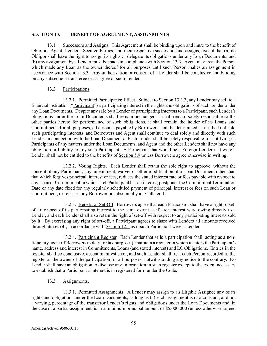 95 AmericasActive:19586302.10 SECTION 13. BENEFIT OF AGREEMENT; ASSIGNMENTS 13.1 Successors and Assigns. This Agreement shall be binding upon and inure to the benefit of Obligors, Agent, Lenders, Secured Parties, and their respective successors and assigns, except that (a) no Obligor shall have the right to assign its rights or delegate its obligations under any Loan Documents; and (b) any assignment by a Lender must be made in compliance with Section 13.3. Agent may treat the Person which made any Loan as the owner thereof for all purposes until such Person makes an assignment in accordance with Section 13.3. Any authorization or consent of a Lender shall be conclusive and binding on any subsequent transferee or assignee of such Lender. 13.2 Participations. 13.2.1. Permitted Participants; Effect. Subject to Section 13.3.3, any Lender may sell to a financial institution (“Participant”) a participating interest in the rights and obligations of such Lender under any Loan Documents. Despite any sale by a Lender of participating interests to a Participant, such Lender’s obligations under the Loan Documents shall remain unchanged, it shall remain solely responsible to the other parties hereto for performance of such obligations, it shall remain the holder of its Loans and Commitments for all purposes, all amounts payable by Borrowers shall be determined as if it had not sold such participating interests, and Borrowers and Agent shall continue to deal solely and directly with such Lender in connection with the Loan Documents. Each Lender shall be solely responsible for notifying its Participants of any matters under the Loan Documents, and Agent and the other Lenders shall not have any obligation or liability to any such Participant. A Participant that would be a Foreign Lender if it were a Lender shall not be entitled to the benefits of Section 5.9 unless Borrowers agree otherwise in writing. 13.2.2. Voting Rights. Each Lender shall retain the sole right to approve, without the consent of any Participant, any amendment, waiver or other modification of a Loan Document other than that which forgives principal, interest or fees, reduces the stated interest rate or fees payable with respect to any Loan or Commitment in which such Participant has an interest, postpones the Commitment Termination Date or any date fixed for any regularly scheduled payment of principal, interest or fees on such Loan or Commitment, or releases any Borrower or substantially all Collateral. 13.2.3. Benefit of Set-Off. Borrowers agree that each Participant shall have a right of set- off in respect of its participating interest to the same extent as if such interest were owing directly to a Lender, and each Lender shall also retain the right of set-off with respect to any participating interests sold by it. By exercising any right of set-off, a Participant agrees to share with Lenders all amounts received through its set-off, in accordance with Section 12.5 as if such Participant were a Lender. 13.2.4. Participant Register. Each Lender that sells a participation shall, acting as a non- fiduciary agent of Borrowers (solely for tax purposes), maintain a register in which it enters the Participant’s name, address and interest in Commitments, Loans (and stated interest) and LC Obligations. Entries in the register shall be conclusive, absent manifest error, and such Lender shall treat each Person recorded in the register as the owner of the participation for all purposes, notwithstanding any notice to the contrary. No Lender shall have an obligation to disclose any information in such register except to the extent necessary to establish that a Participant’s interest is in registered form under the Code. 13.3 Assignments. 13.3.1. Permitted Assignments. A Lender may assign to an Eligible Assignee any of its rights and obligations under the Loan Documents, as long as (a) each assignment is of a constant, and not a varying, percentage of the transferor Lender’s rights and obligations under the Loan Documents and, in the case of a partial assignment, is in a minimum principal amount of $5,000,000 (unless otherwise agreed